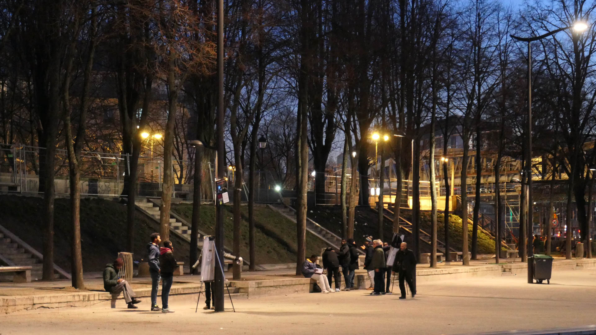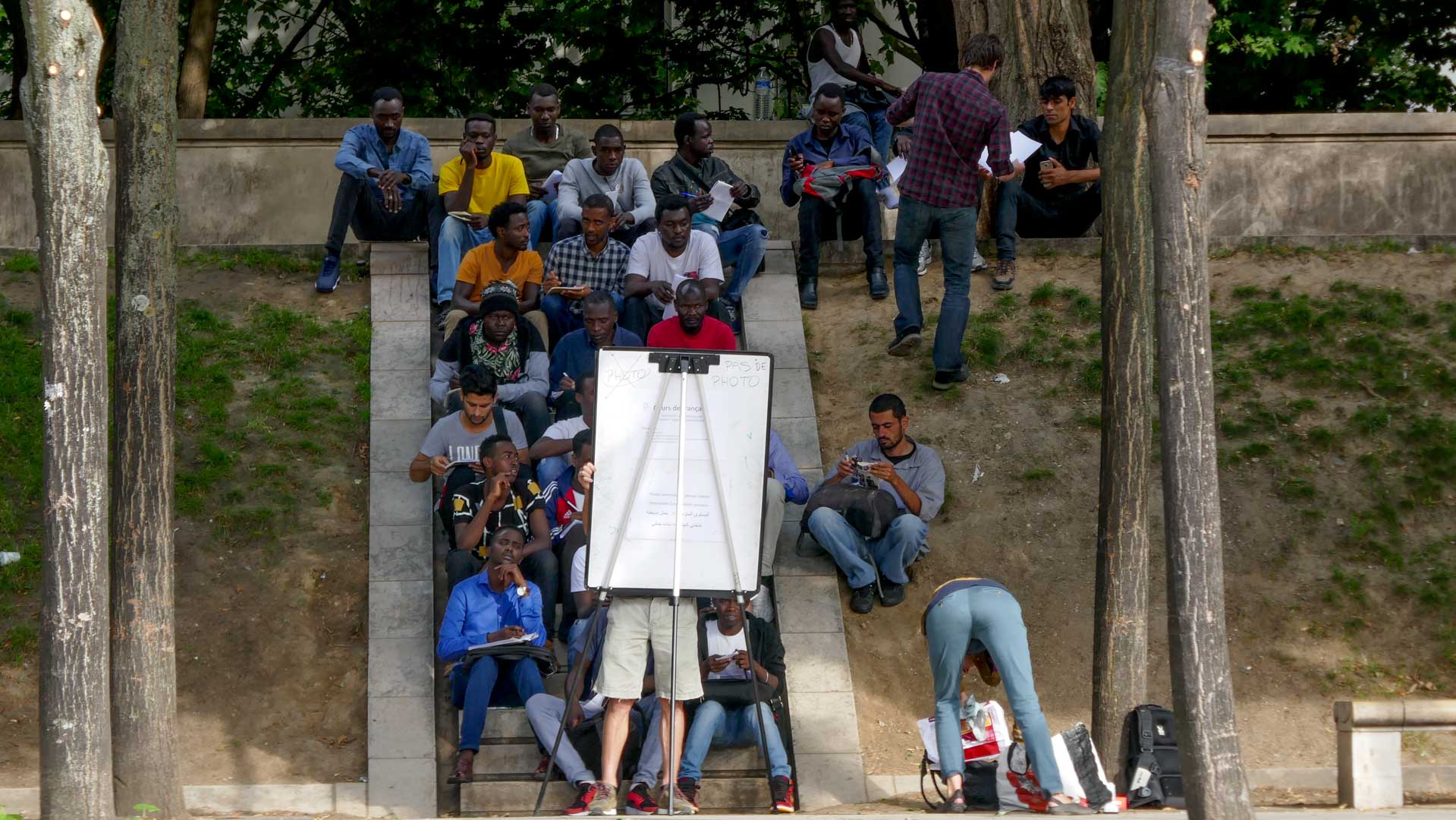 Un ultime obstacle pour les réfugiés Afghans, Érythréens, Éthiopiens et Soudanais campant autour de la Gare du Nord dans la plus extrême précarité. Depuis le mois de septembre 2016, les militants de l’association BAAM (Bureau d’Accueil et d’Accompagnement des Migrants) dispensent des cours de français, en plein air, sur les contreforts qui isolent la place de la ville.
