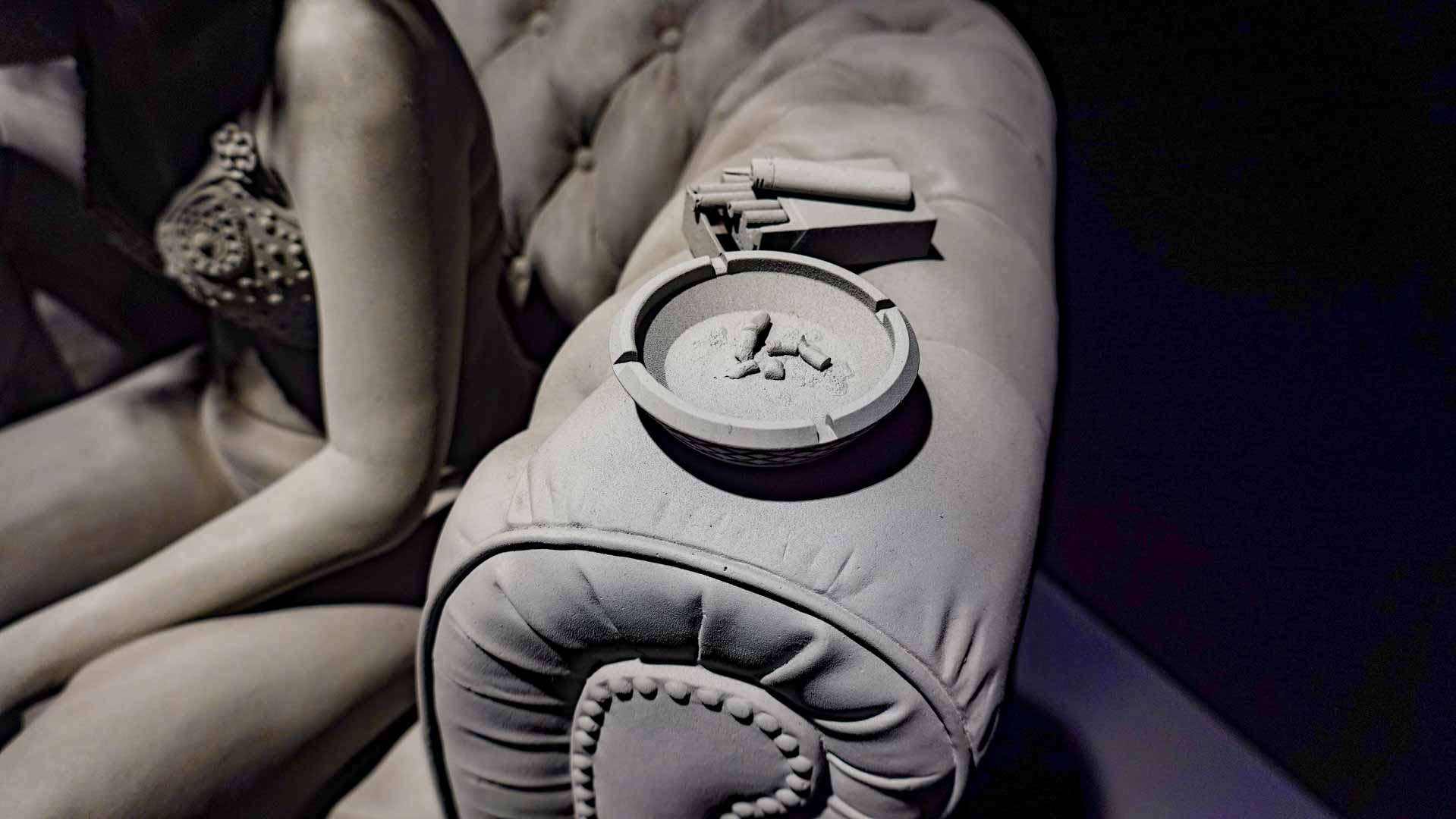 Les sculptures monumentales et monochromes plongent le spectateur dans des univers silencieux et méditatifs. Entre intérieurs fictifs, natures mortes, scènes nocturnes et personnages figés, l’artiste compose des moments suspendus, à mi-chemin entre héritage classique et atmosphère cinématographique.