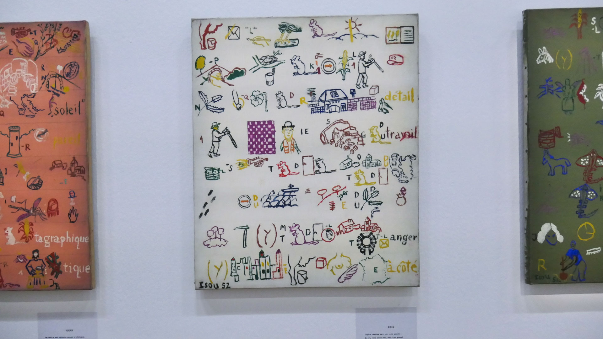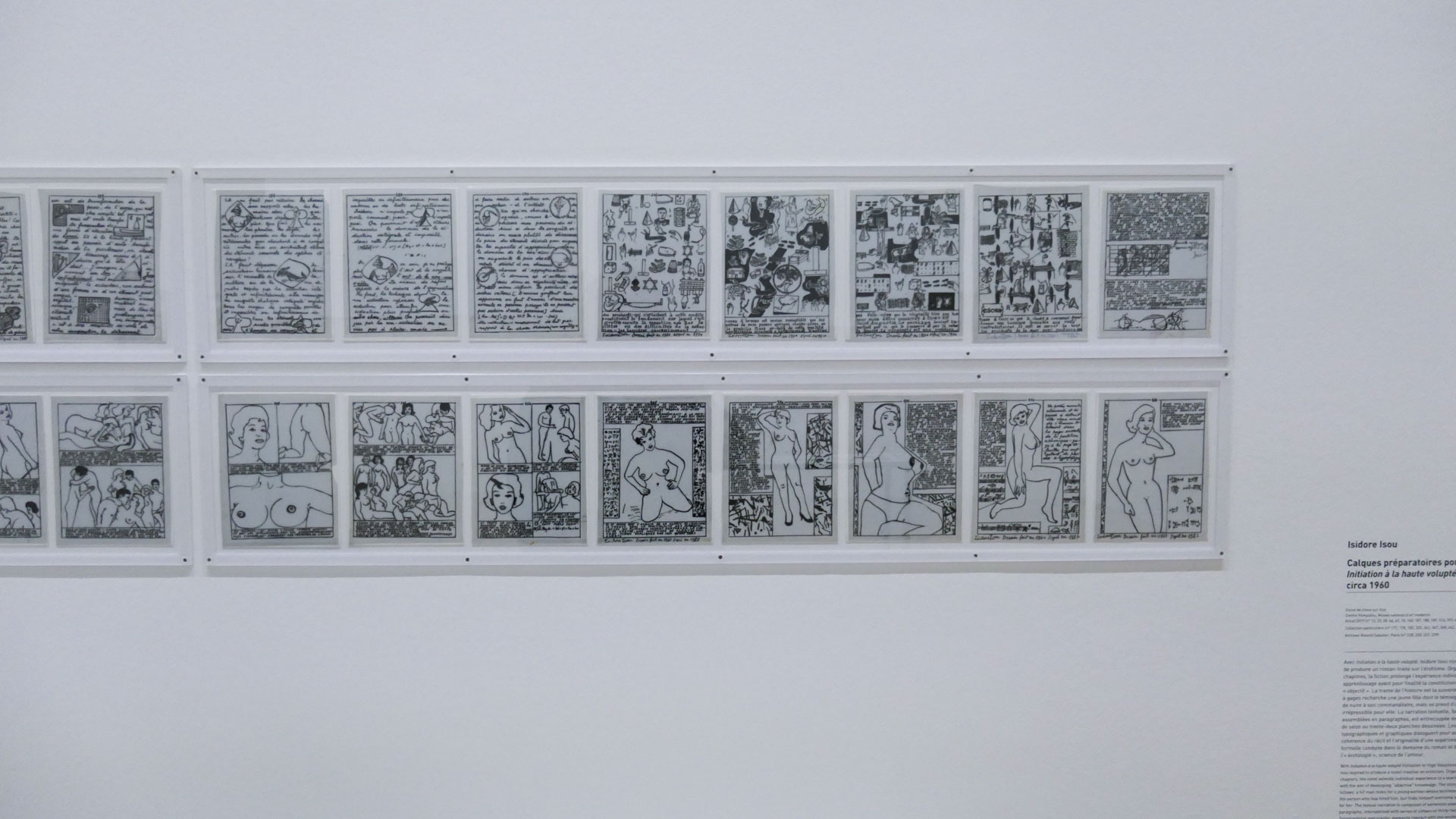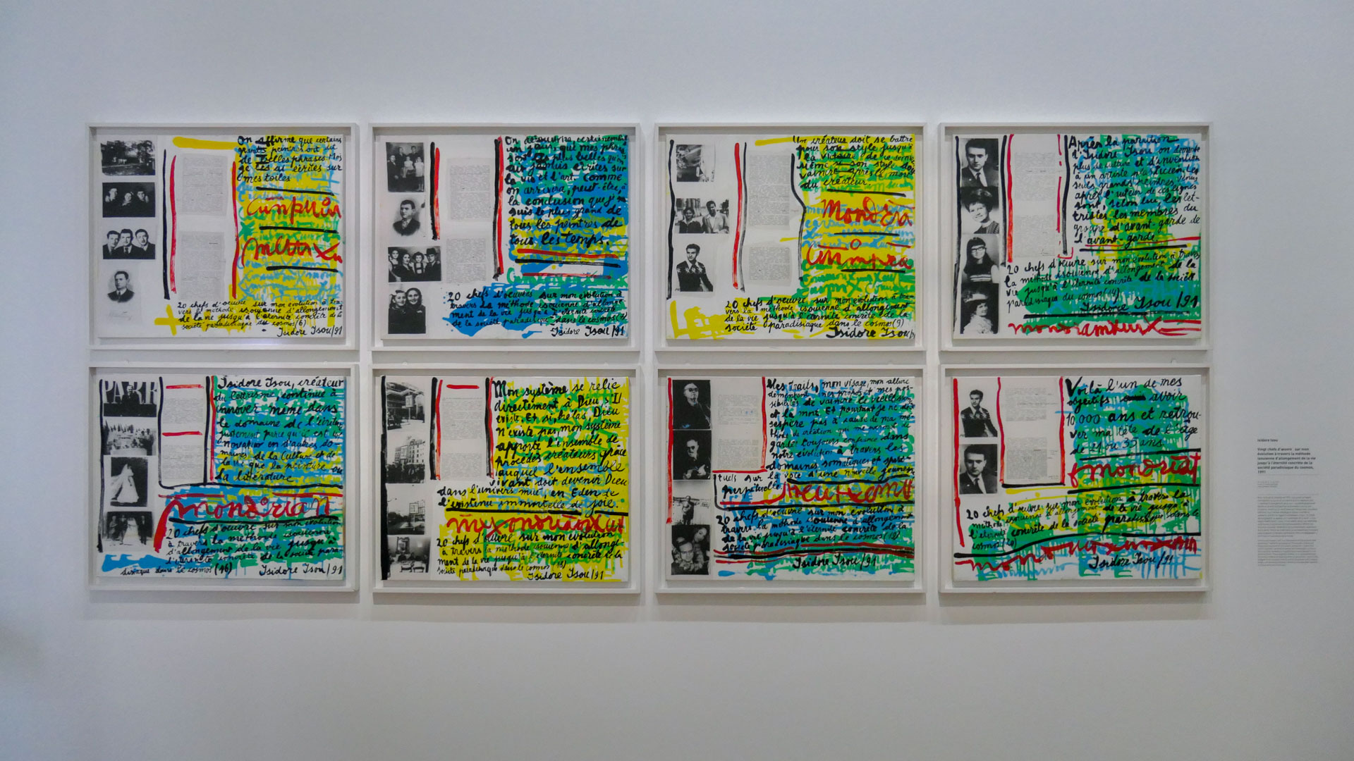 L’œuvre d’Isidore Isou s’étend sur plusieurs décennies et se déploie dans une grande diversité de supports, mêlant écriture, image et performance. Dans ses productions théoriques, il élabore une pensée structurée de l’avant-garde, cherchant à définir les étapes de naissance, de développement puis d’épuisement des formes artistiques. Cette recherche se traduit aussi par des expérimentations concrètes : en littérature, il multiplie les essais narratifs et les écritures hybrides ; dans les arts visuels, il développe notamment l’hypergraphie, qui combine signes, lettres et tracés ; au cinéma enfin, il participe à l’émergence de formes radicalement nouvelles, comme en témoigne Traité de bave et d’éternité (1951), œuvre fondatrice qui bouleverse le rapport entre image, son et récit. L’ensemble de son travail compose ainsi une œuvre singulière, à la fois dense, inclassable et fortement marquée par une volonté de renouveler en profondeur les pratiques artistiques.