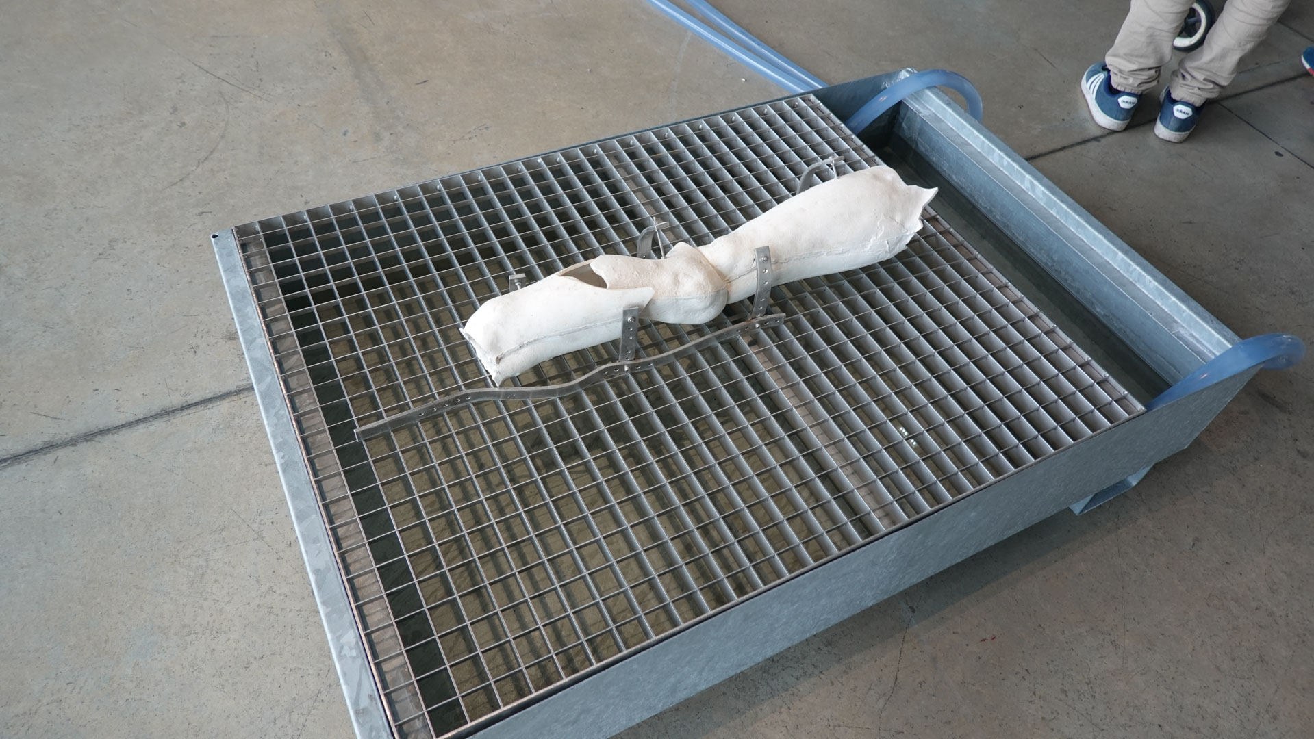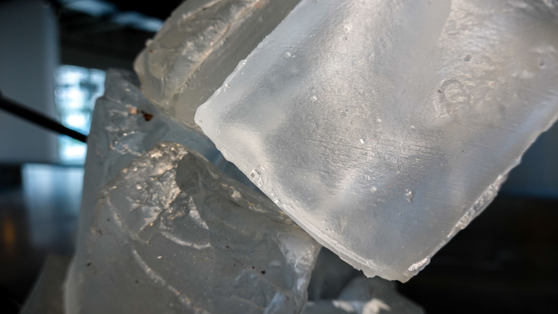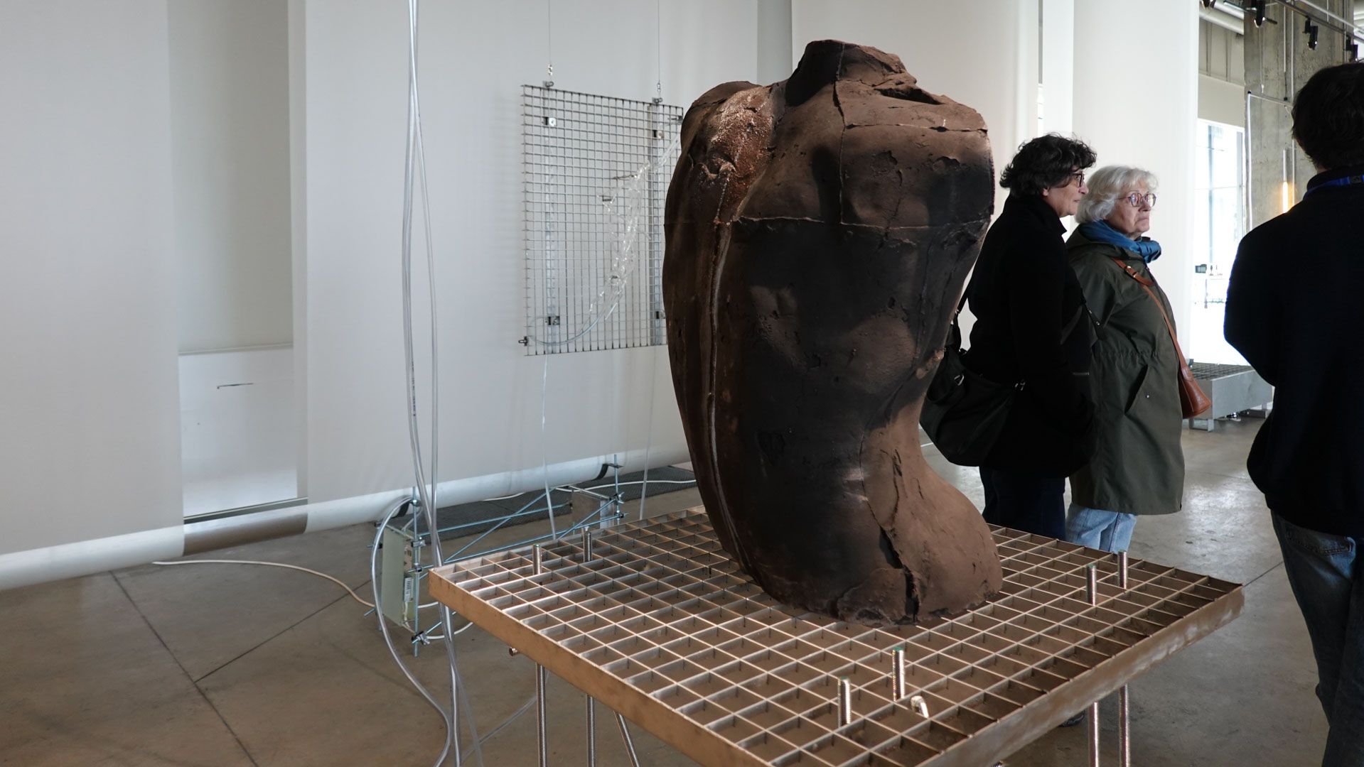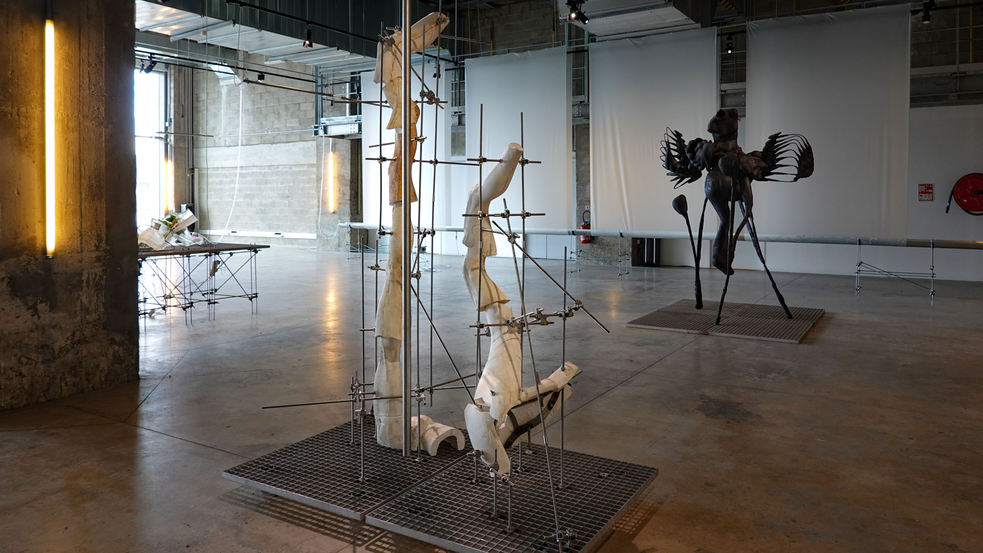 Ces êtres nouveaux, ces « Géants » comme les appelle Hugo Servanin, reflètent la nature fragile du corps humain. Ils nécessitent une attention et une maintenance de tous les jours. L’artiste et son équipe y veillent, faisant des Magasins Généraux une extension de l’atelier, une serre nucléaire où germent des mondes. Jusqu’à ce que la fin arrive. C’est le temps de l’embaumement, des corps céramisés, enveloppés dans des linceuls de verre et déposés inertes sur des bacs de rétention, à la manière de déchets industriels. Ils transmettent symboliquement au liquide qu’ils surplombent de quoi nourrir les vivants. La Morphose est un cycle, une chaîne de transformations corporelles interconnectées, un fantasme d’harmonie."
