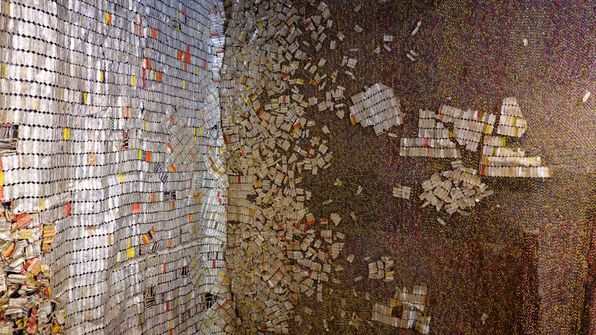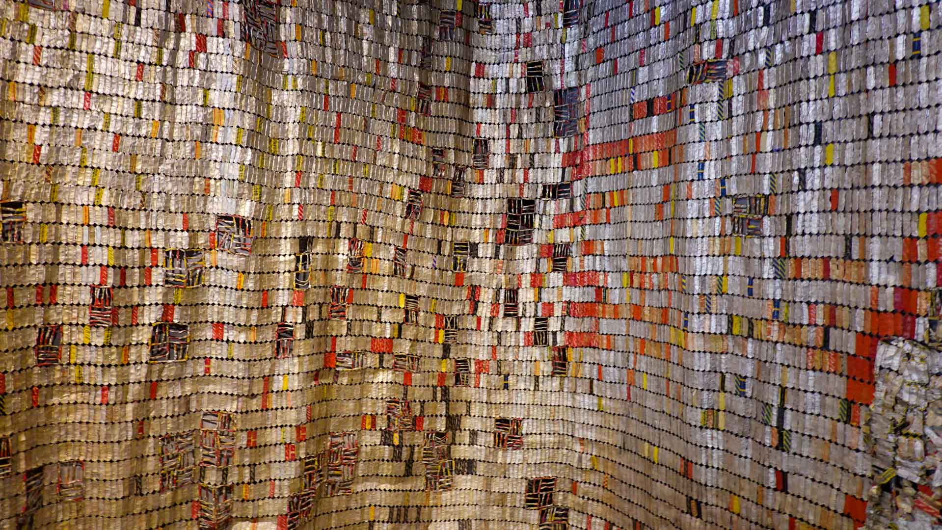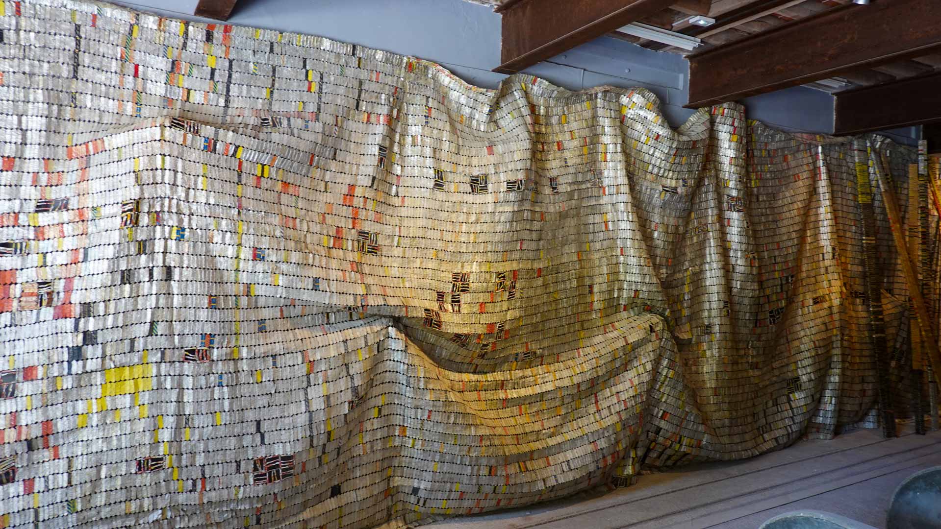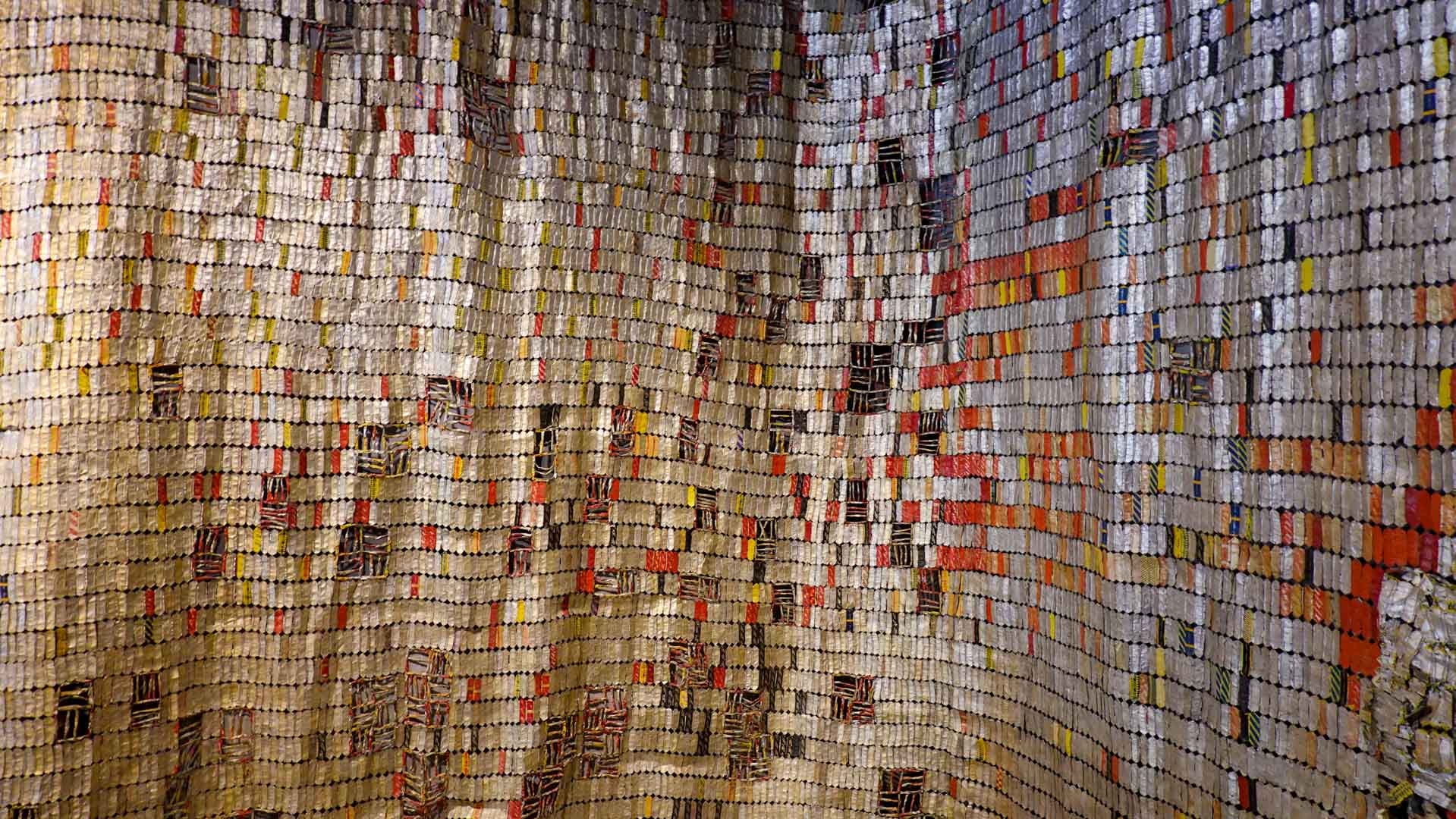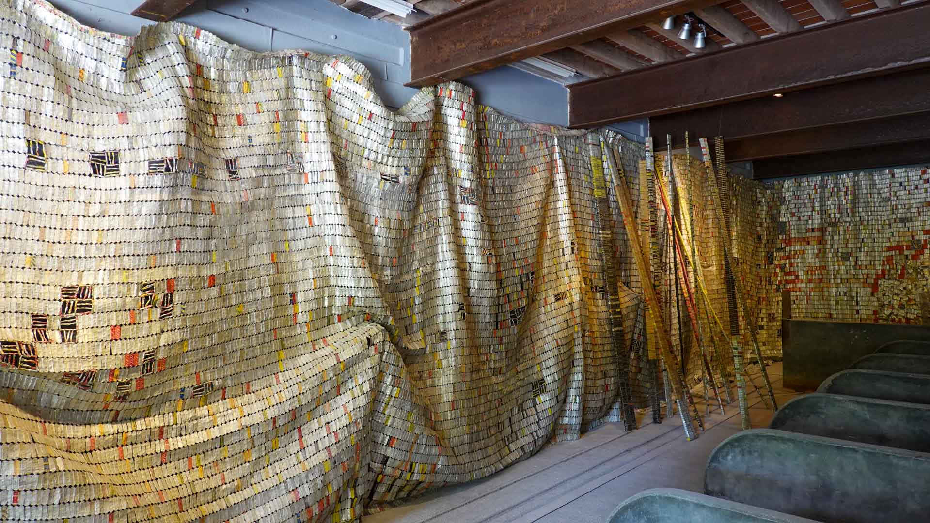 Cette installation murale monumentale constituée de milliers d’étiquettes et capsules de bouteilles en aluminium, forme un sublime paysage d’or et d’argent. Une œuvre aux couleurs vives et chatoyantes qui s’inspirent des grandes étoffes kente, pièces aux motifs symboliques portées par les chefs ghanéens."