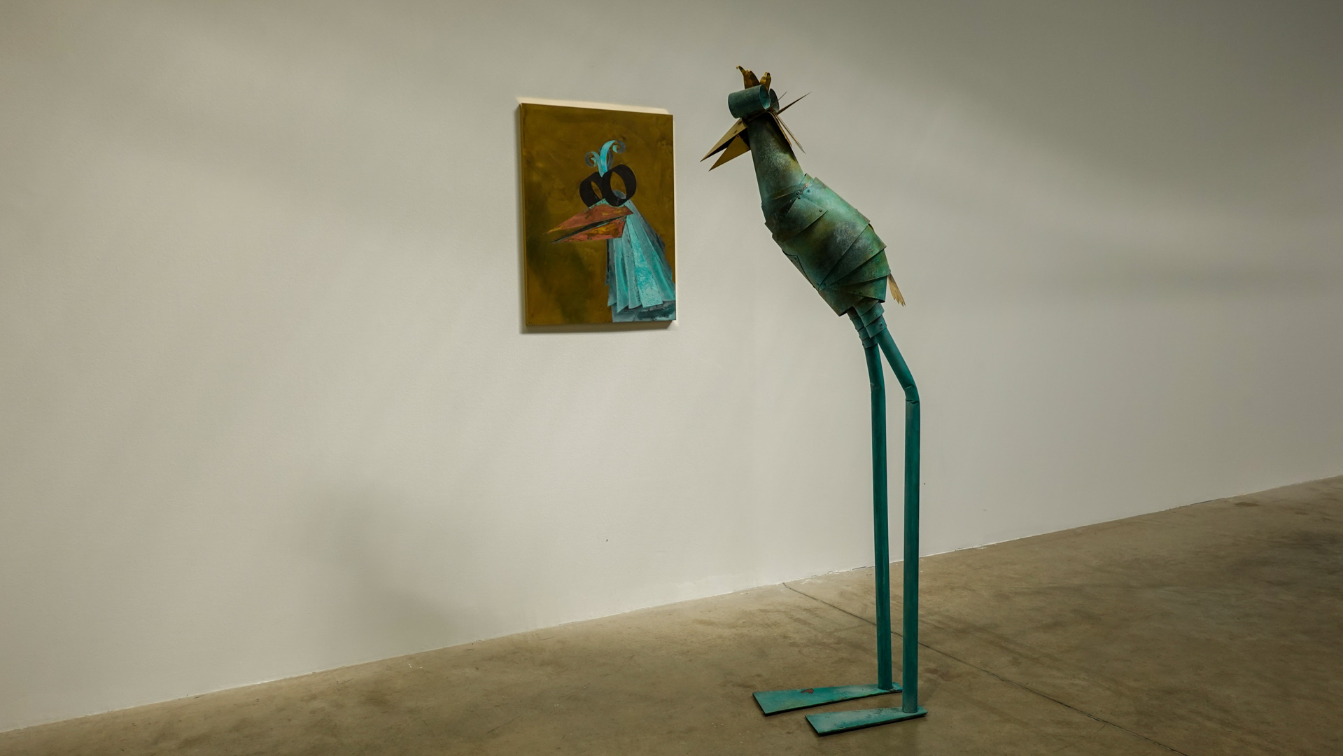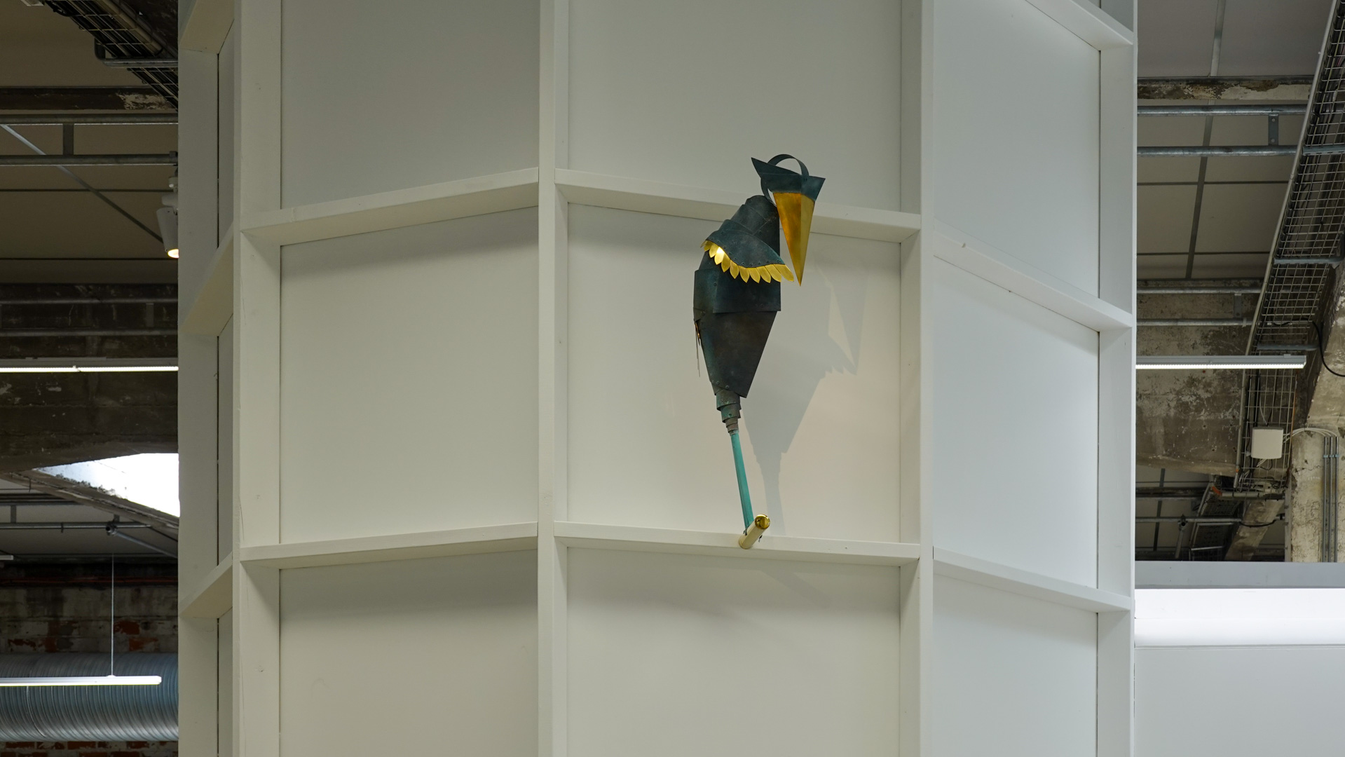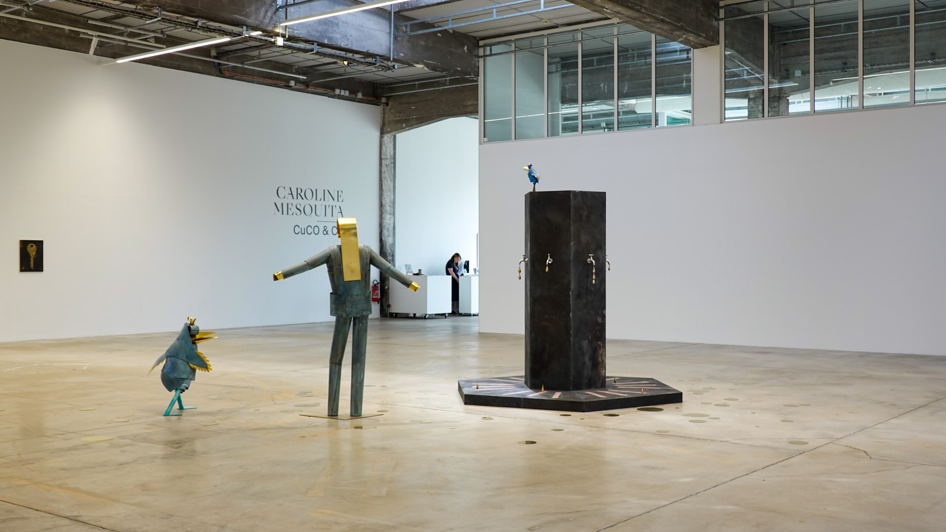 "Tel un rêve éveillé figé dans le temps, suite à un bug temporel, l’espace de la HAB Galerie se transforme en une scène aux allures de fabrique. CuCO & CO, qui évoque la formule chimique du vert-de-gris associé aux autres teintes qui colorent ce paysage, invite à explorer avec humour et poésie le cycle perpétuel de la matière et l’énigme de réalités parallèles où des sculptures prendraient vie.