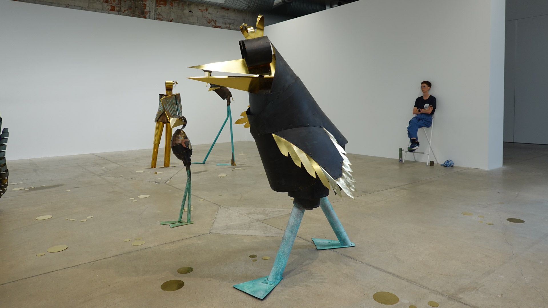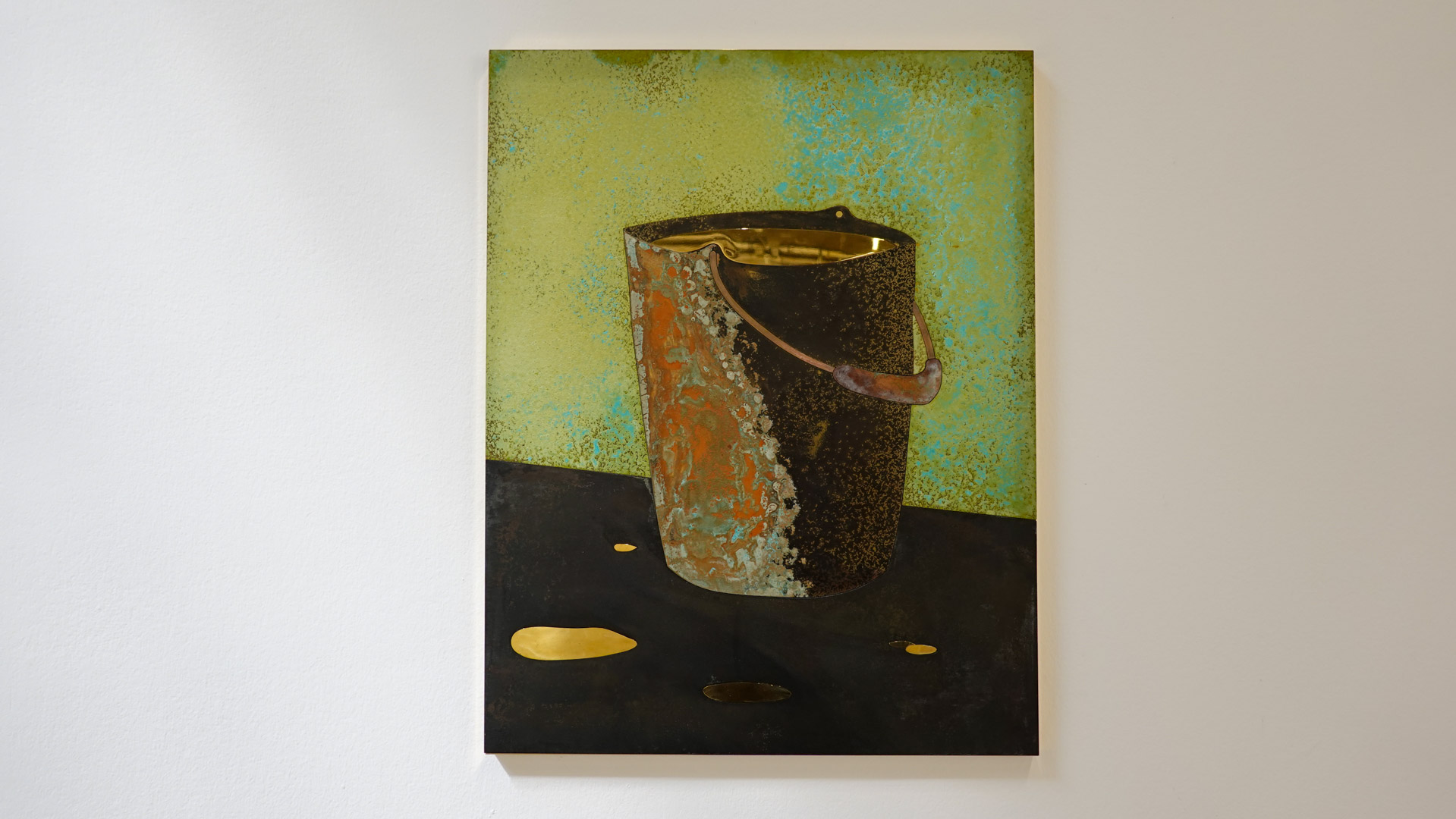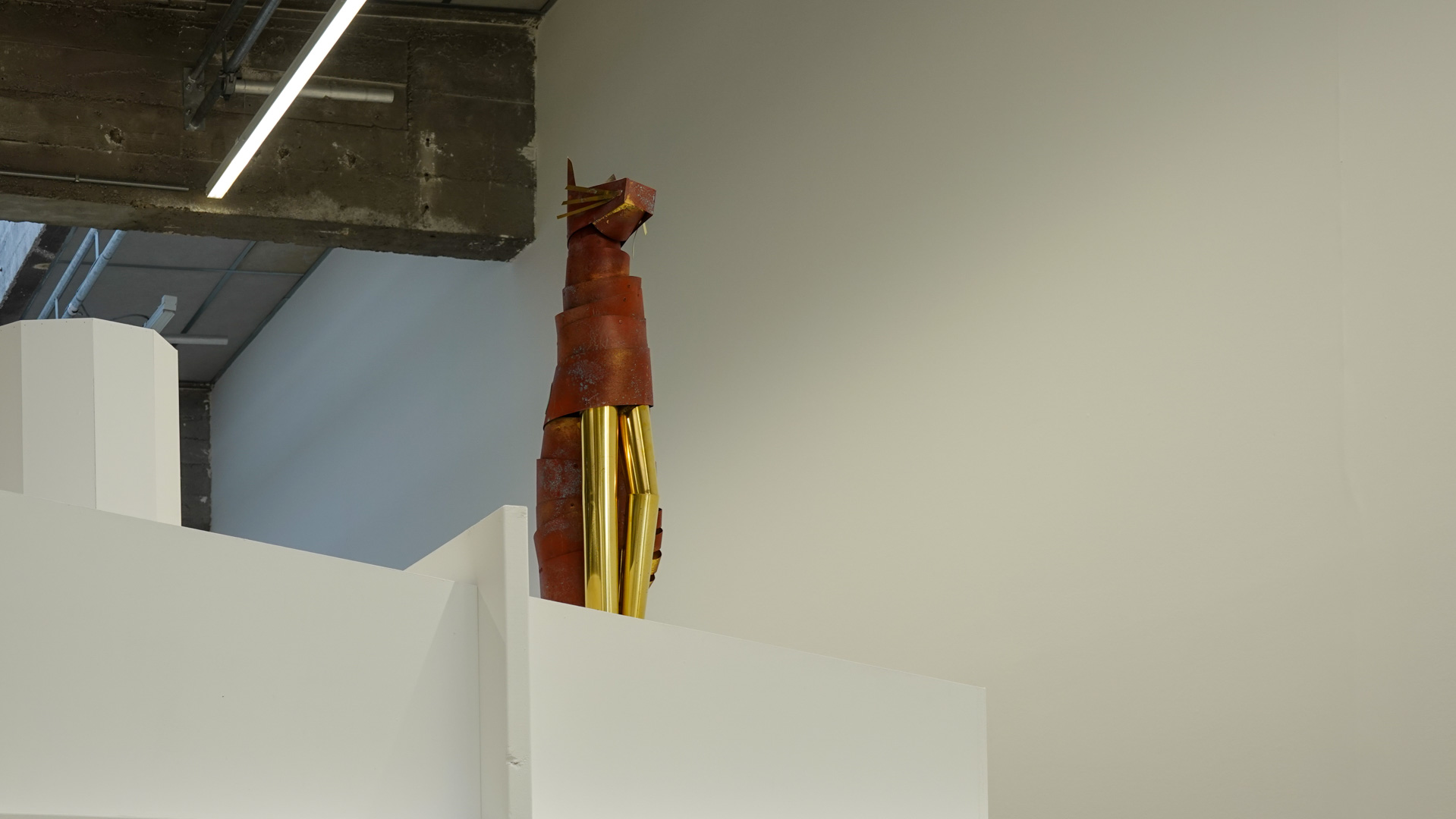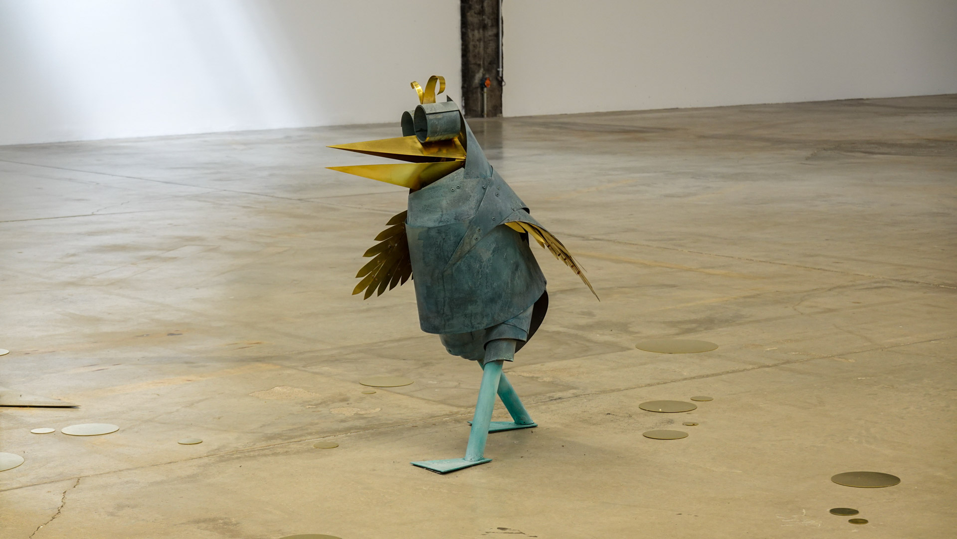 "Tel un rêve éveillé figé dans le temps, suite à un bug temporel, l’espace de la HAB Galerie se transforme en une scène aux allures de fabrique. CuCO & CO, qui évoque la formule chimique du vert-de-gris associé aux autres teintes qui colorent ce paysage, invite à explorer avec humour et poésie le cycle perpétuel de la matière et l’énigme de réalités parallèles où des sculptures prendraient vie.