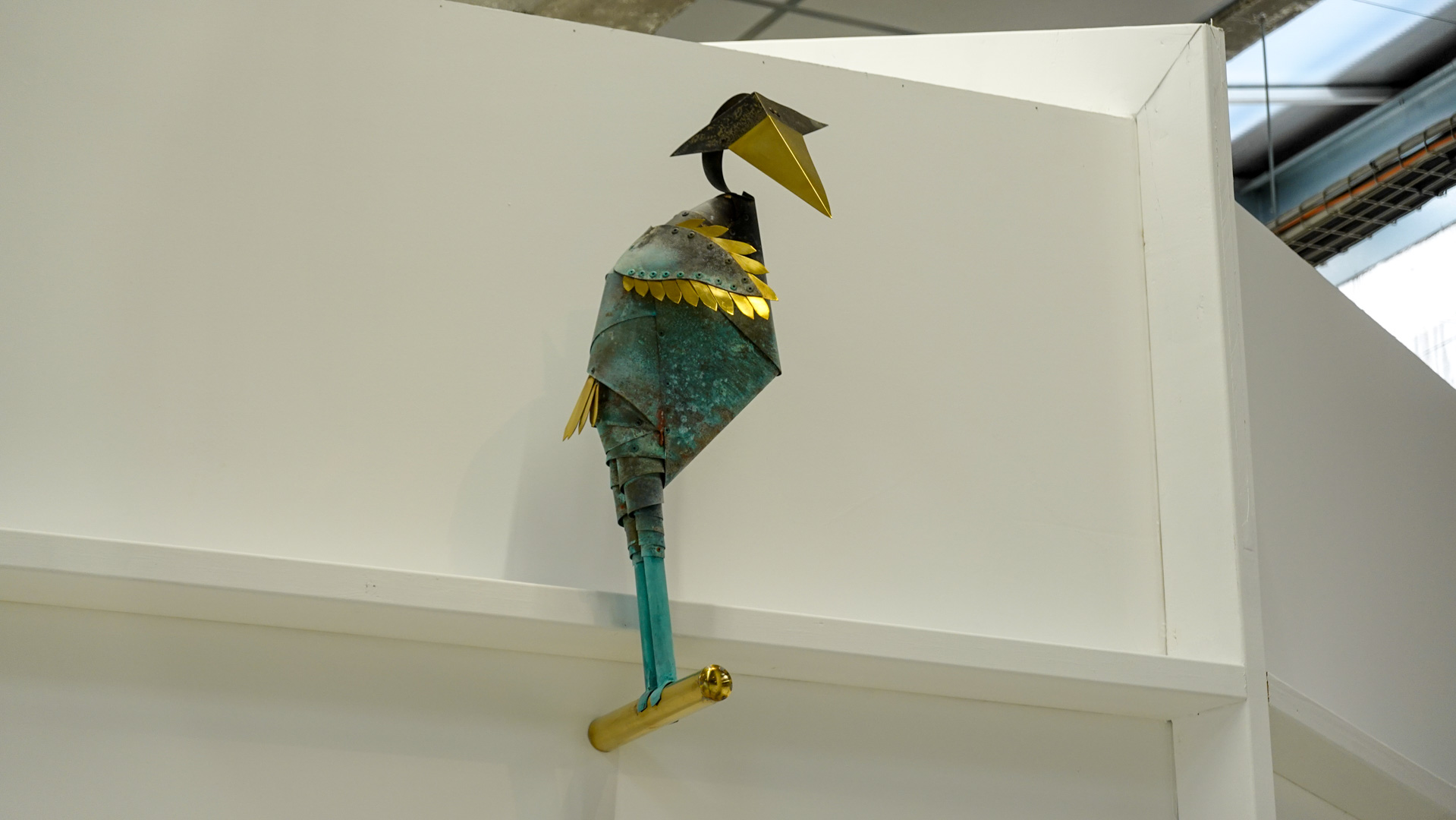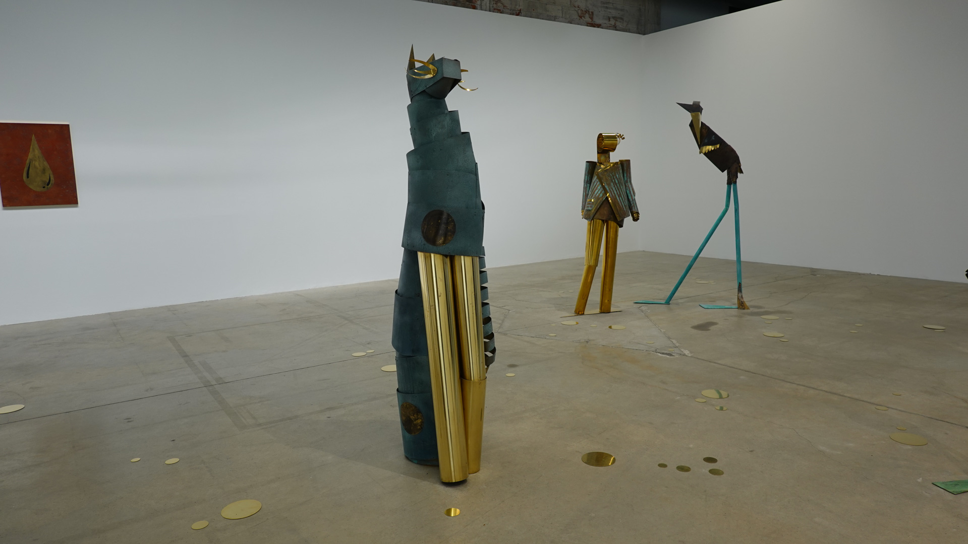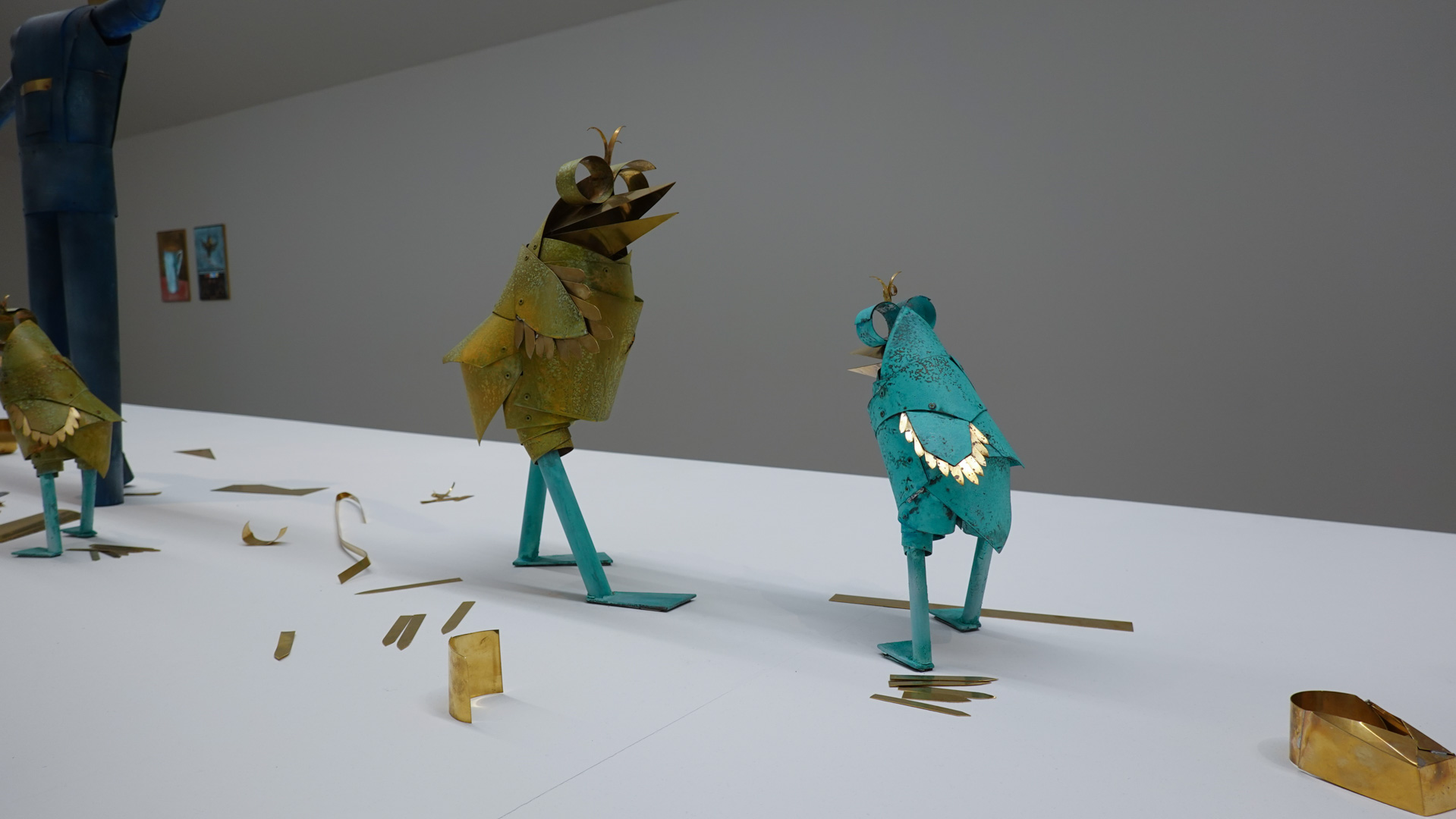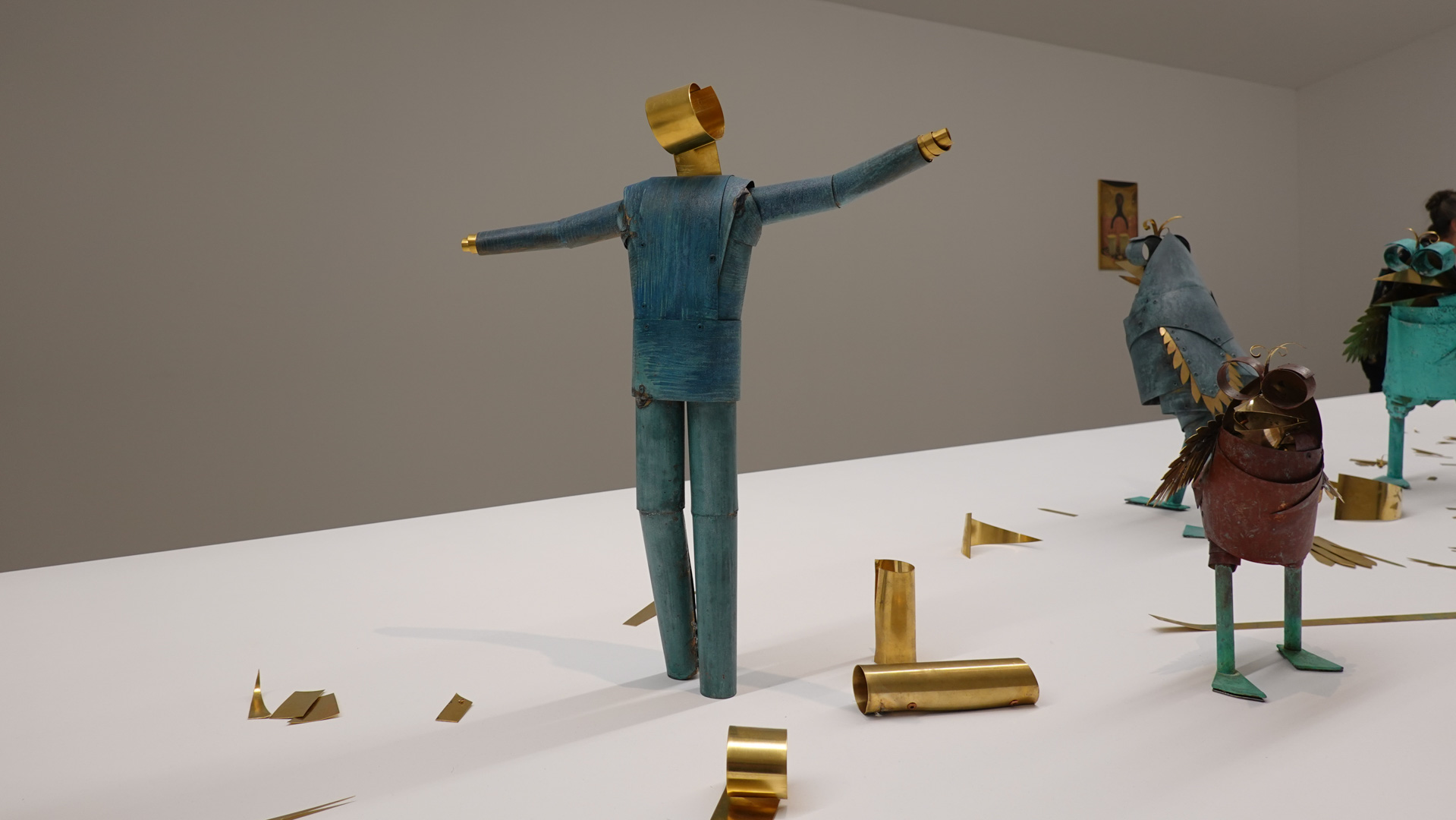 Dans une atmosphère enchantée, des animaux anthropomorphisés et des personnages métalliques vont et viennent. Des gouttes d’une matière dorée s’échappent de robinets et une architecture blanche, à priori impénétrable, se dresse comme un atelier temporairement à l’arrêt. Des tableaux de laiton donnent des indices sur l’intrigue à décoder tandis que les plus curieux découvriront des salles inaccessibles où tout un monde s’active."