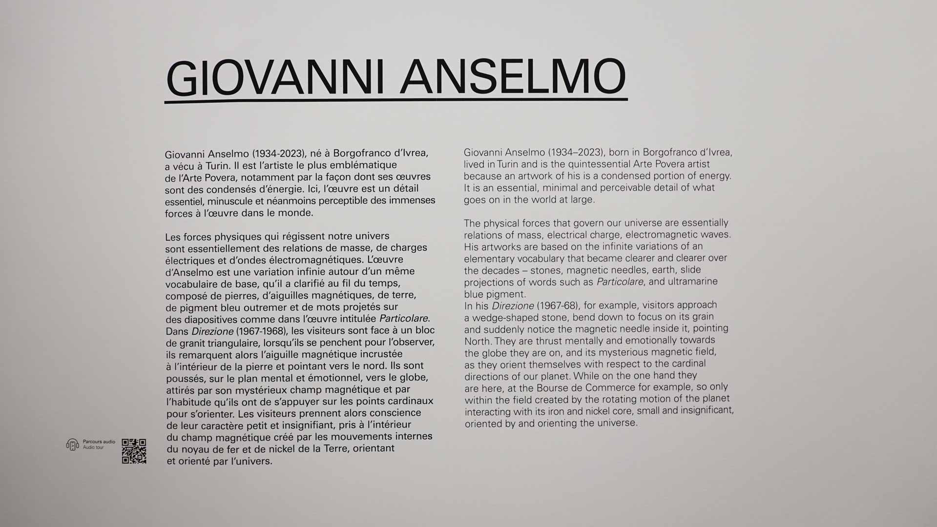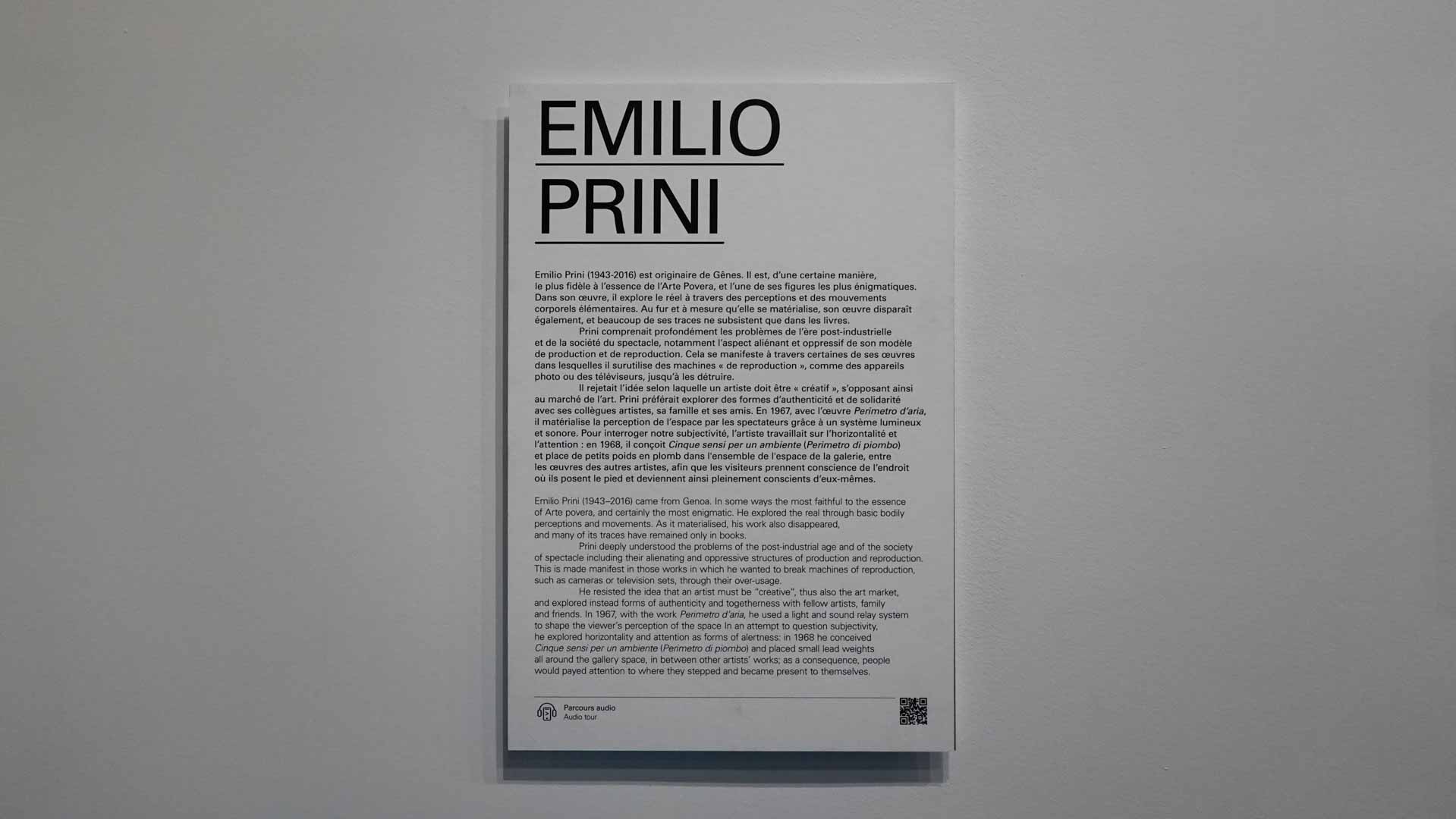 “Au milieu des années 1960, un certain nombre d’artistes italiens – essentiellement originaires de Turin, Gênes, Bologne, Milan et Rome – ont initié un corpus d’œuvres original, libre d’esprit, totalement non conventionnel et non dogmatique, élargissant ainsi les domaines de la peinture, de la sculpture, du dessin et de la photographie, en créant les premières "installations" de l’histoire de l’art, ainsi que des œuvres et des actions performatives.