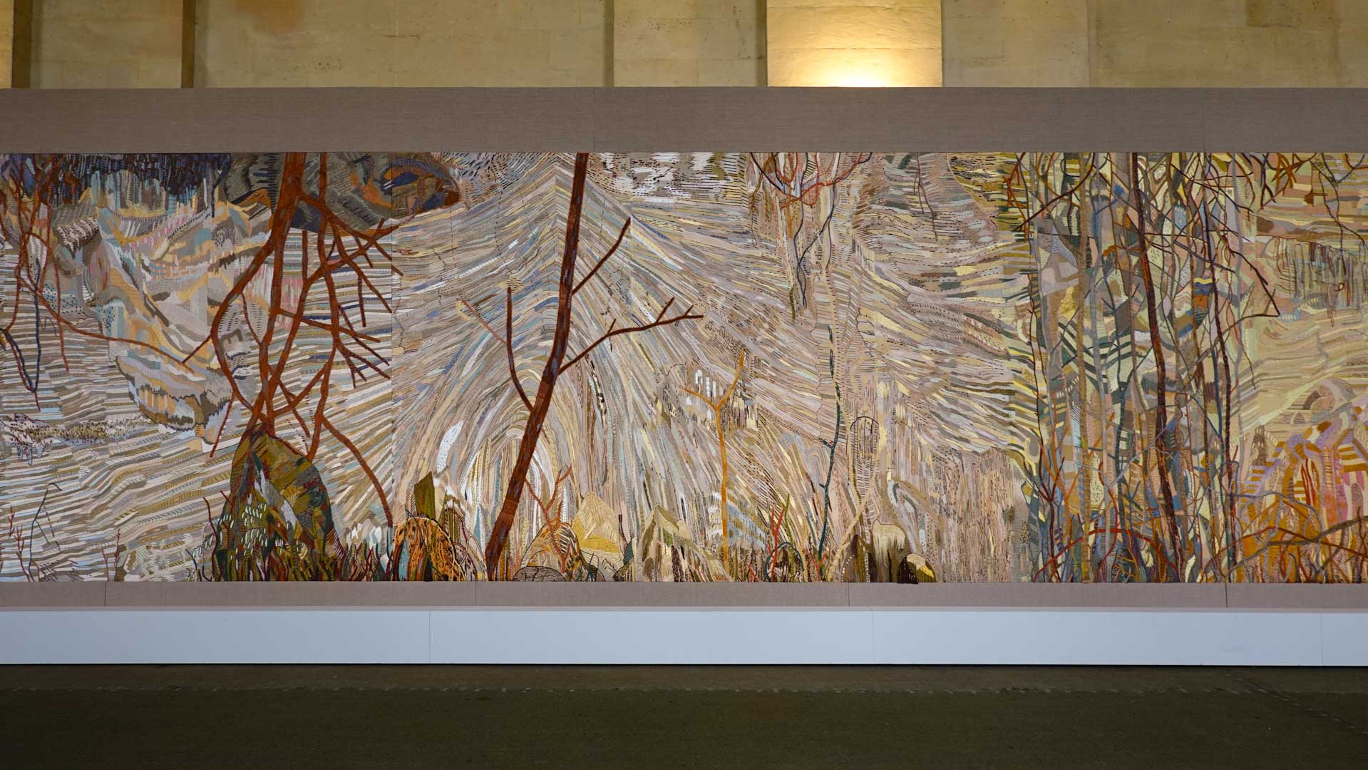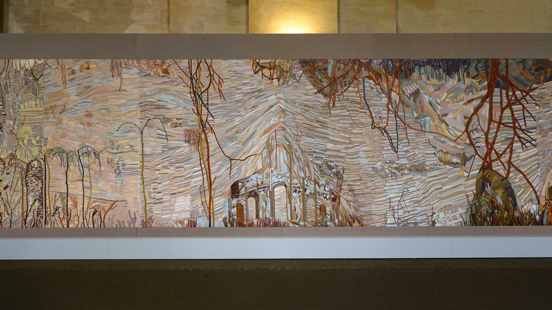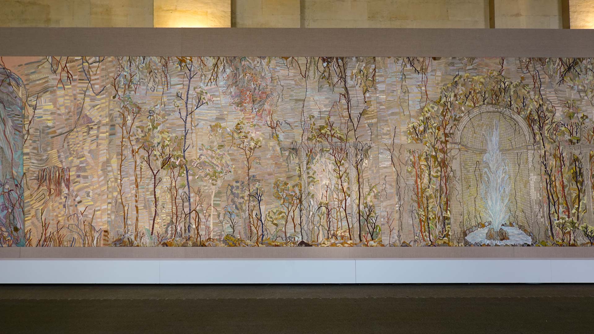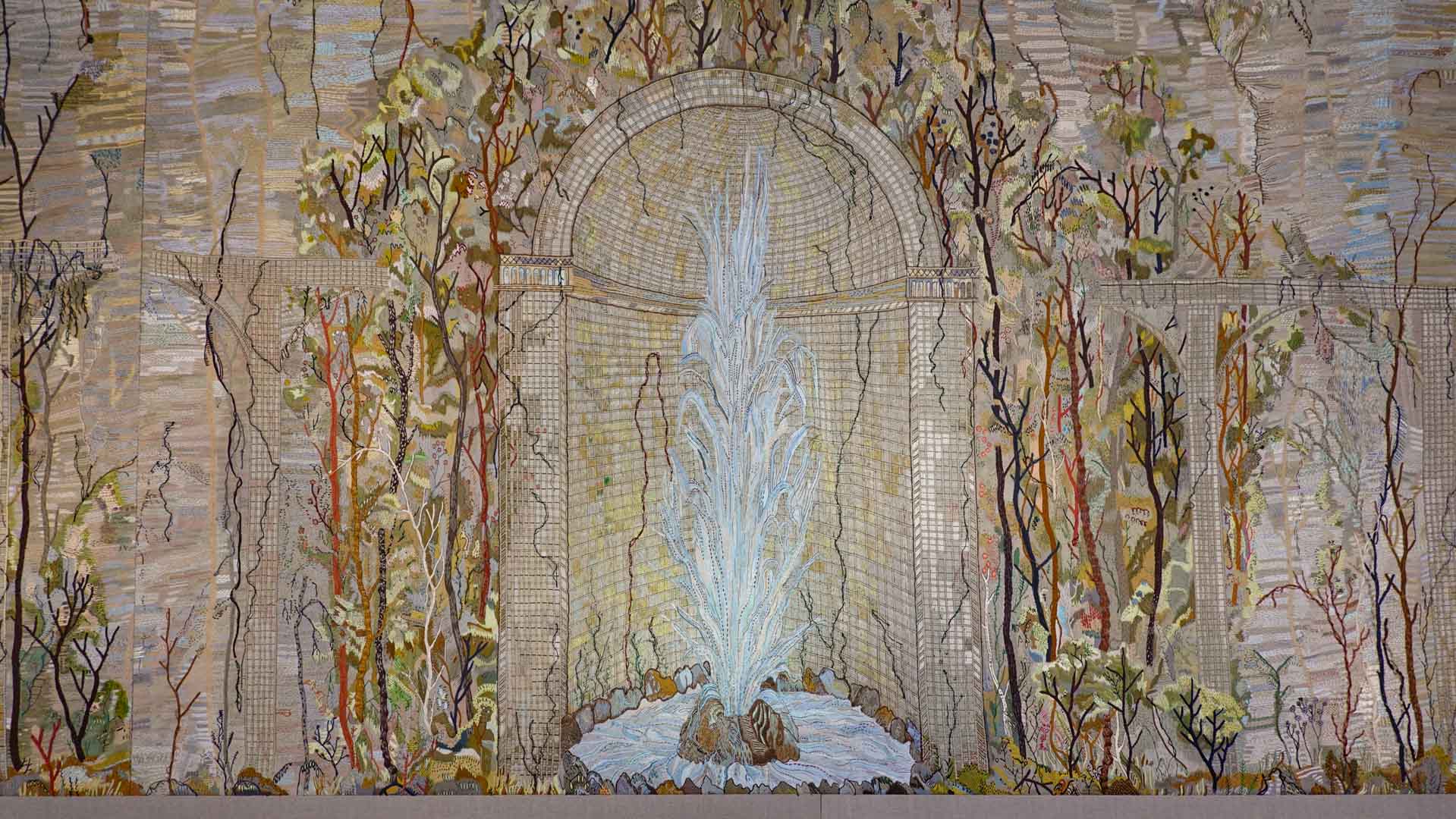 Avec l'ajout d'un panneau brodé inspiré des bosquets versaillais, notamment les Bains d'Apollon, Eva Jospin établit un dialogue entre l'art du jardin et la broderie.