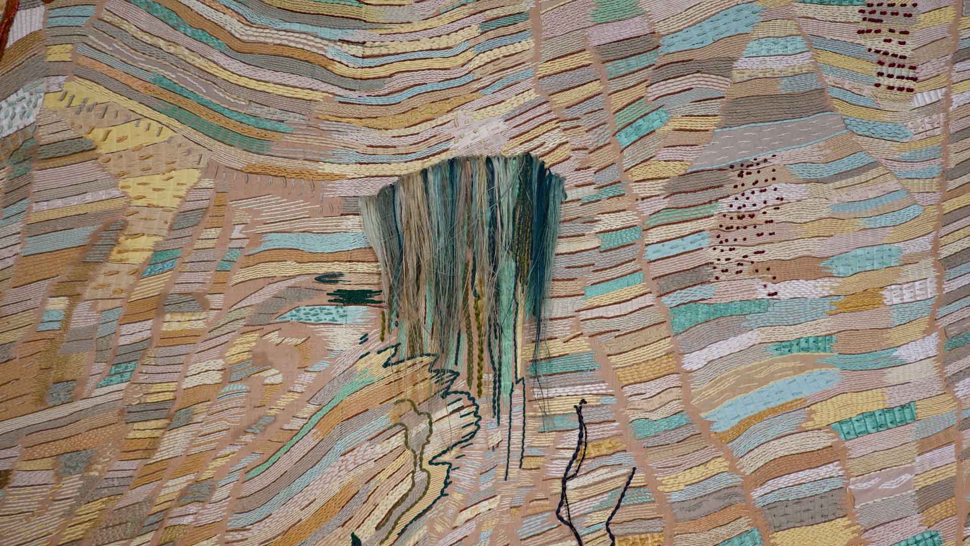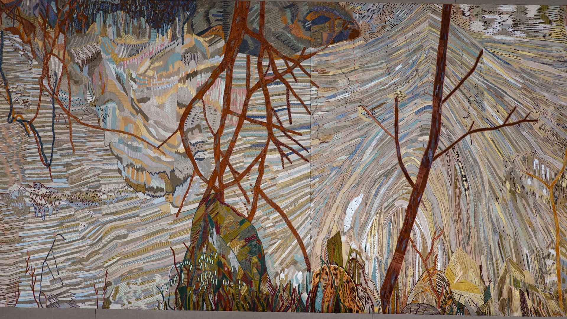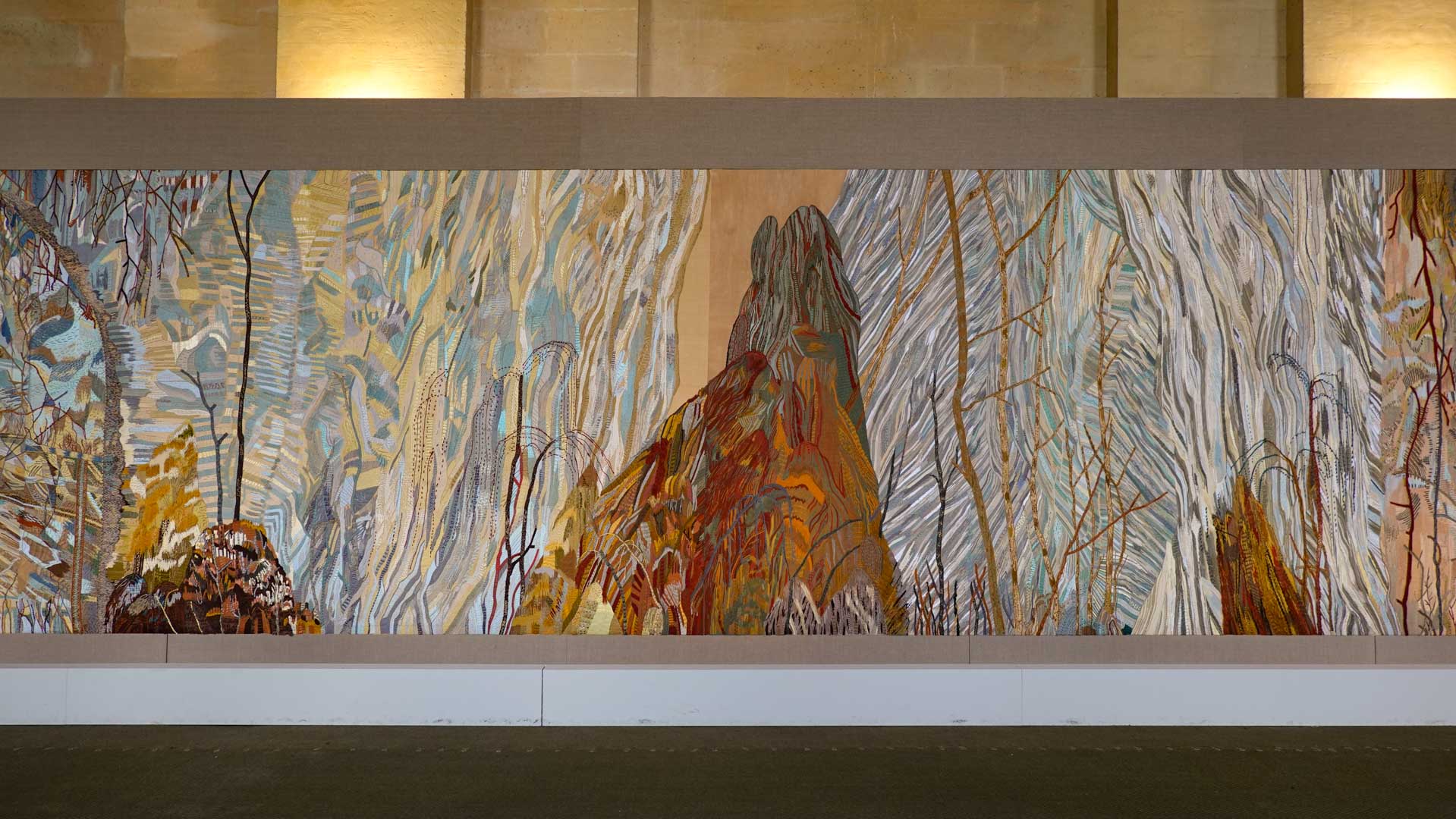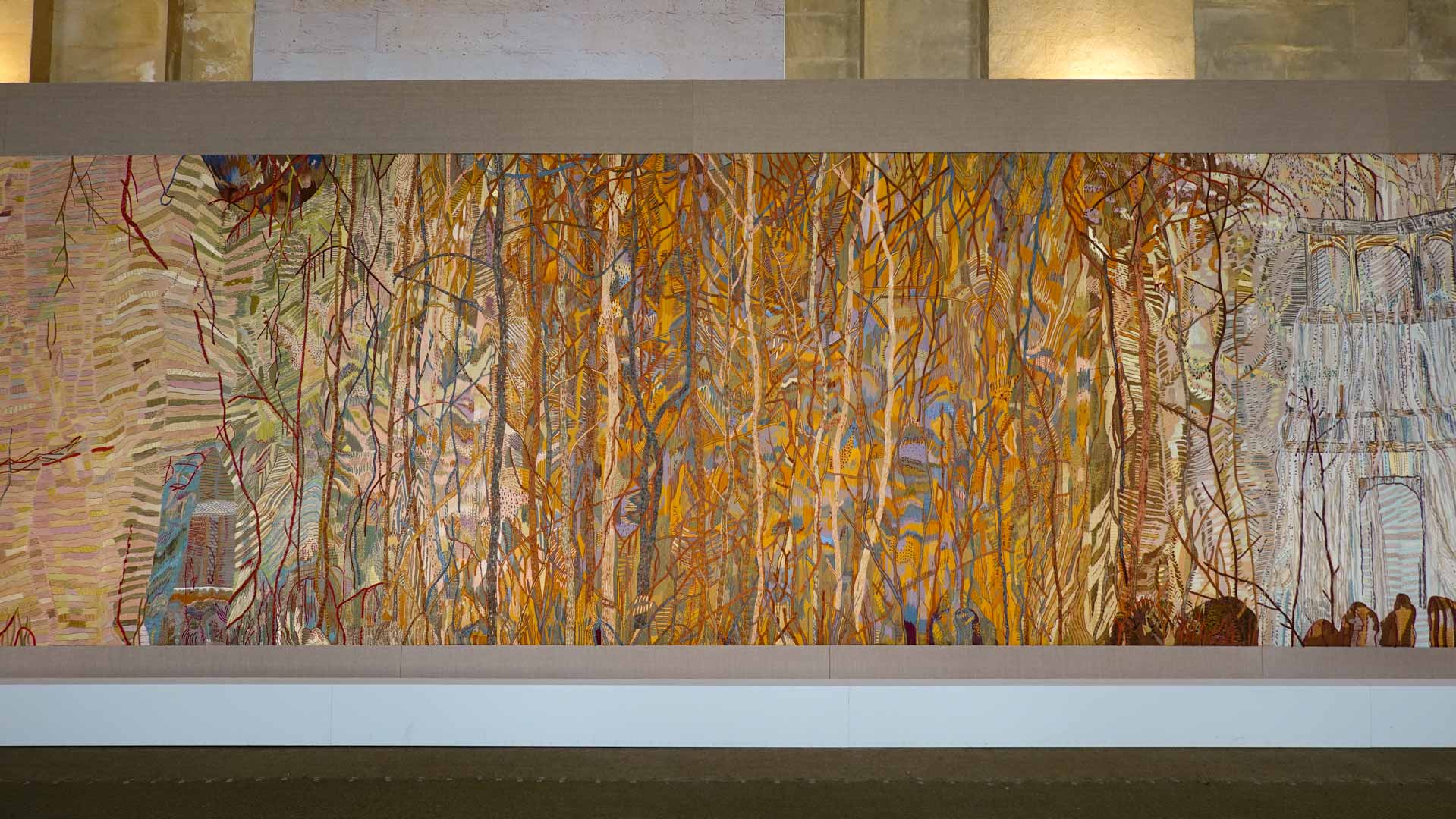 Avec l'ajout d'un panneau brodé inspiré des bosquets versaillais, notamment les Bains d'Apollon, Eva Jospin établit un dialogue entre l'art du jardin et la broderie.