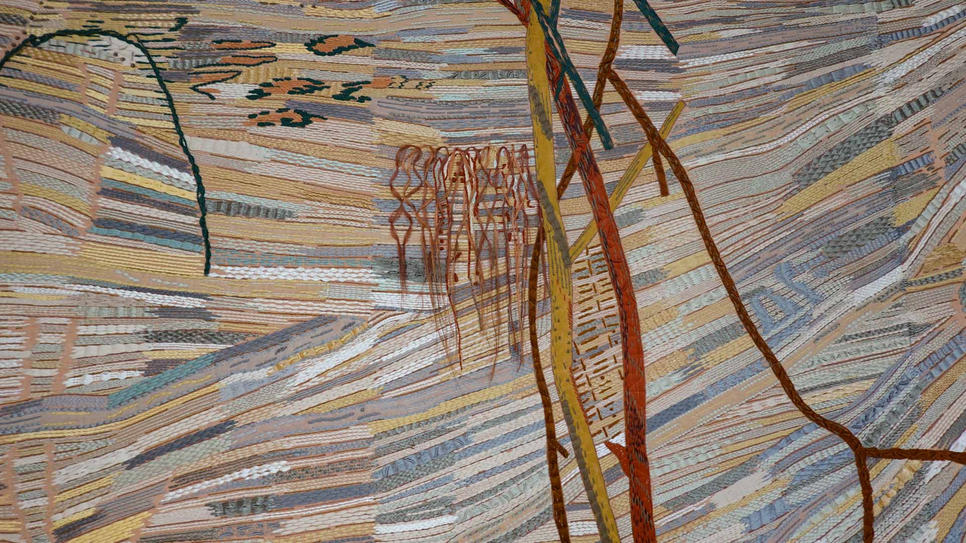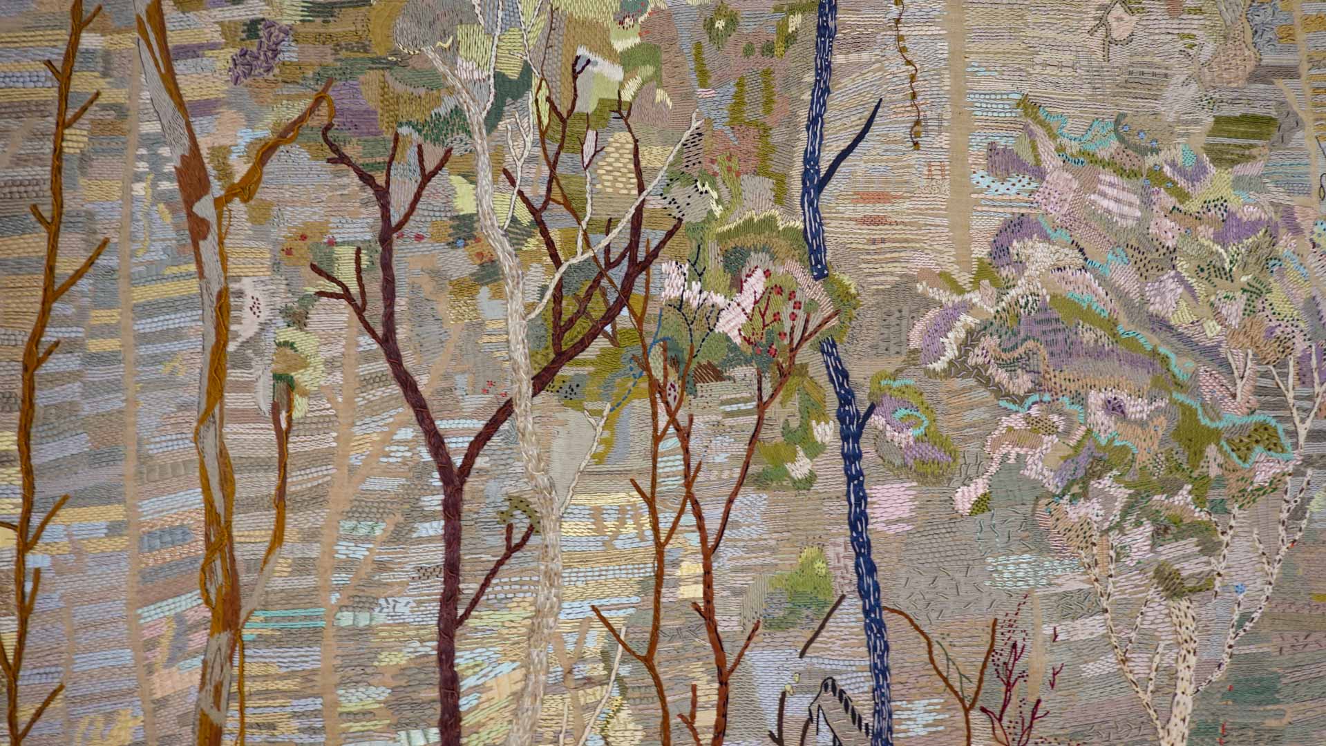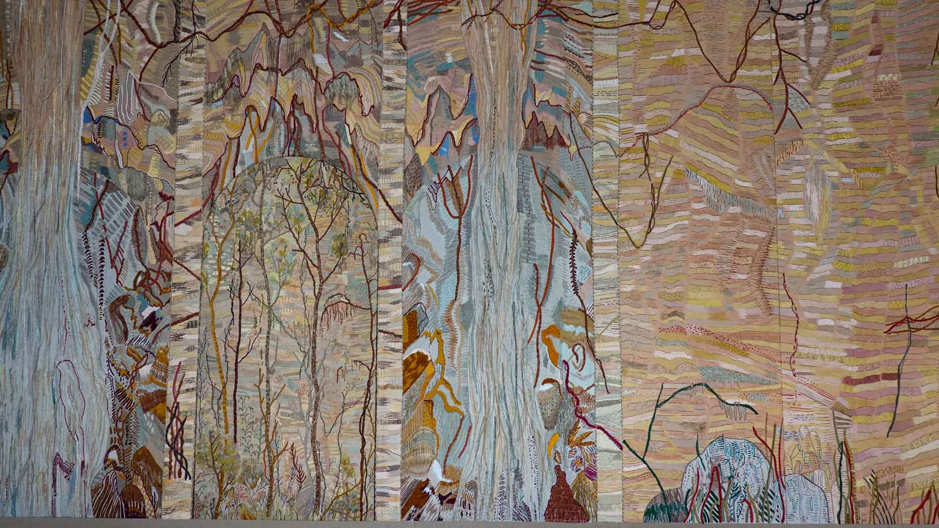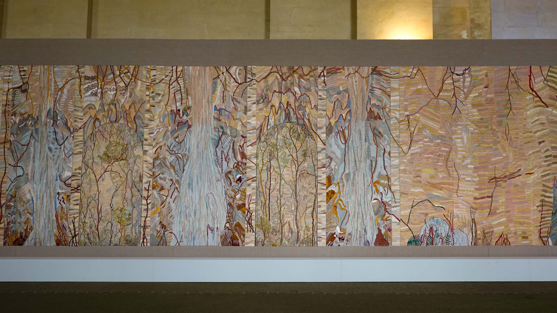 Avec l'ajout d'un panneau brodé inspiré des bosquets versaillais, notamment les Bains d'Apollon, Eva Jospin établit un dialogue entre l'art du jardin et la broderie.