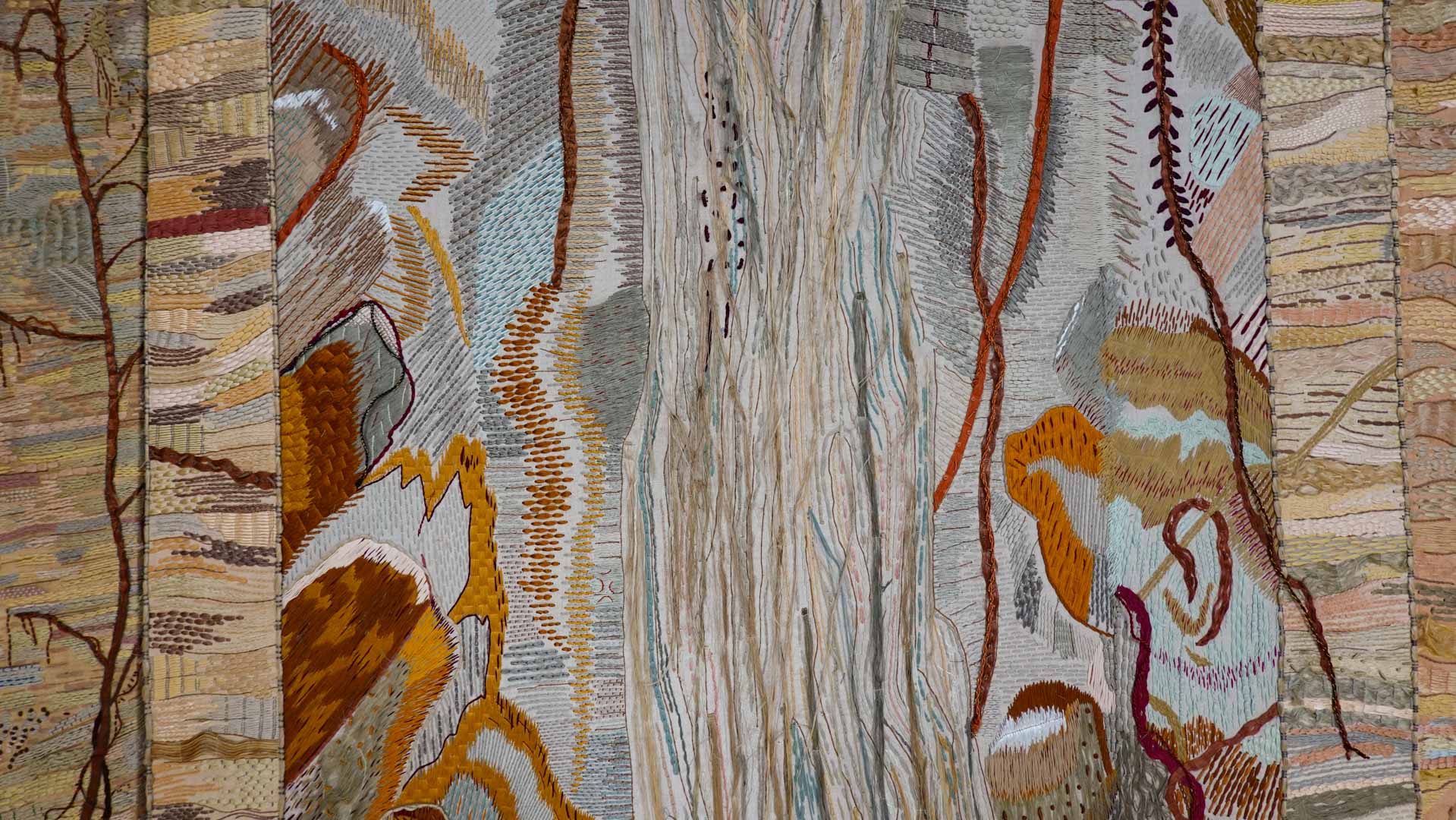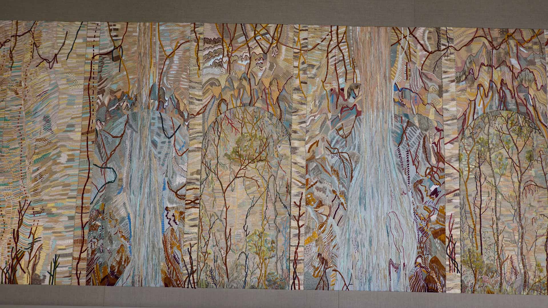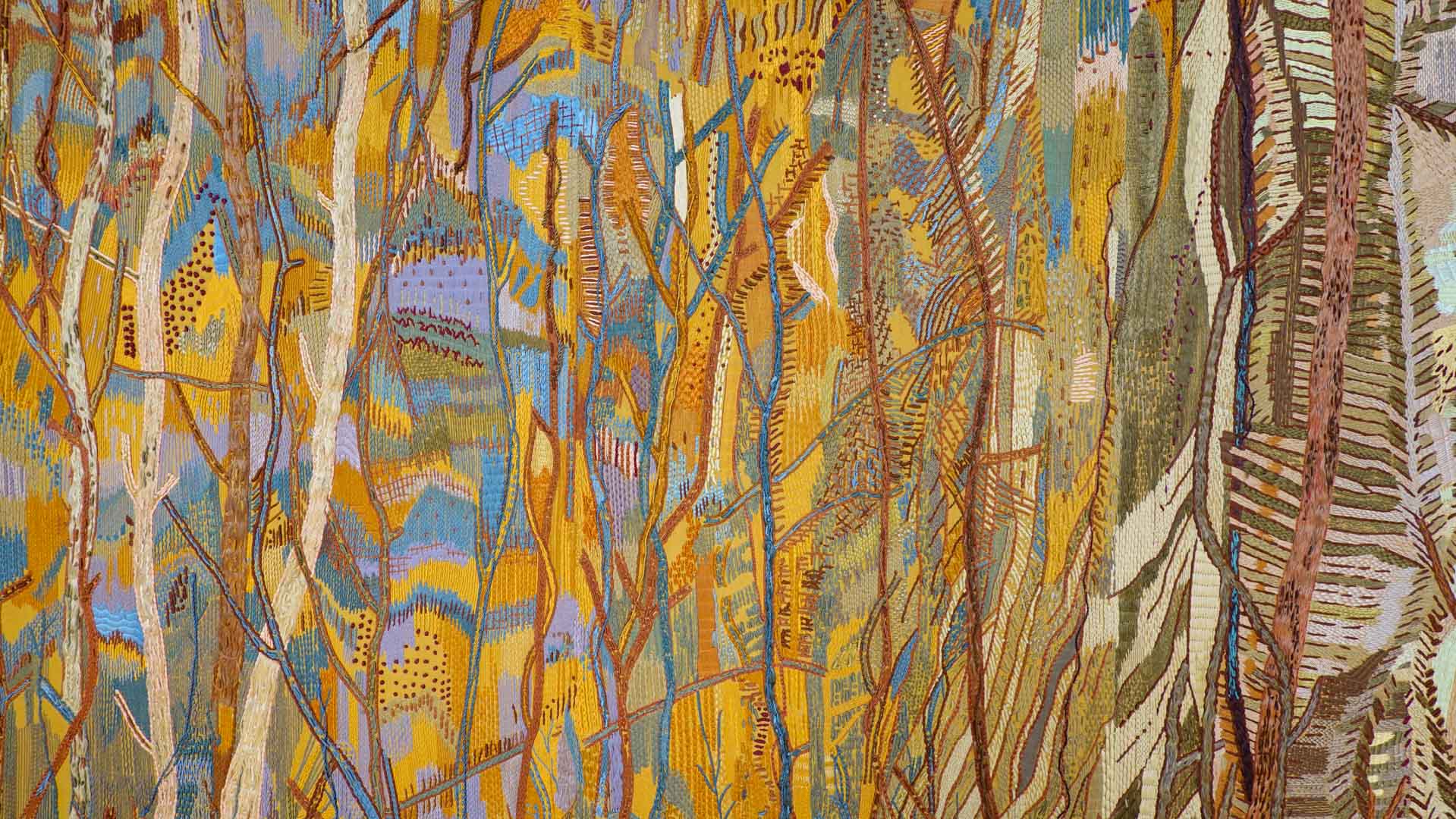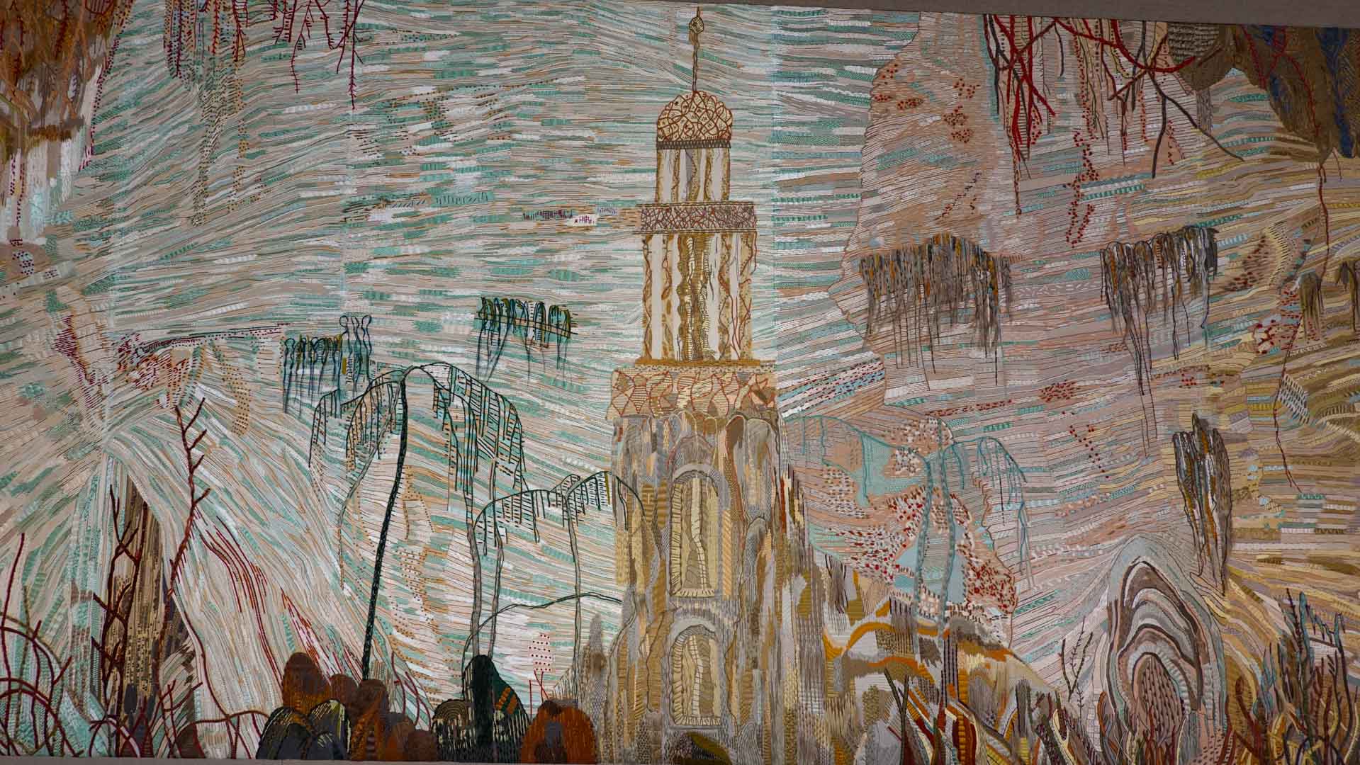 Avec l'ajout d'un panneau brodé inspiré des bosquets versaillais, notamment les Bains d'Apollon, Eva Jospin établit un dialogue entre l'art du jardin et la broderie.