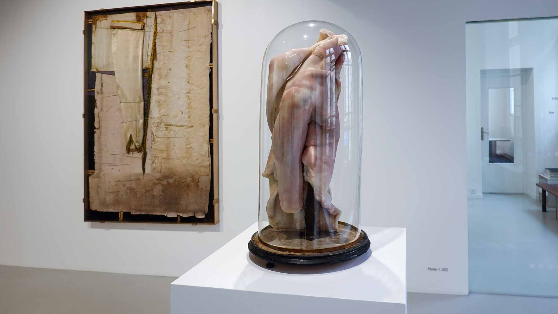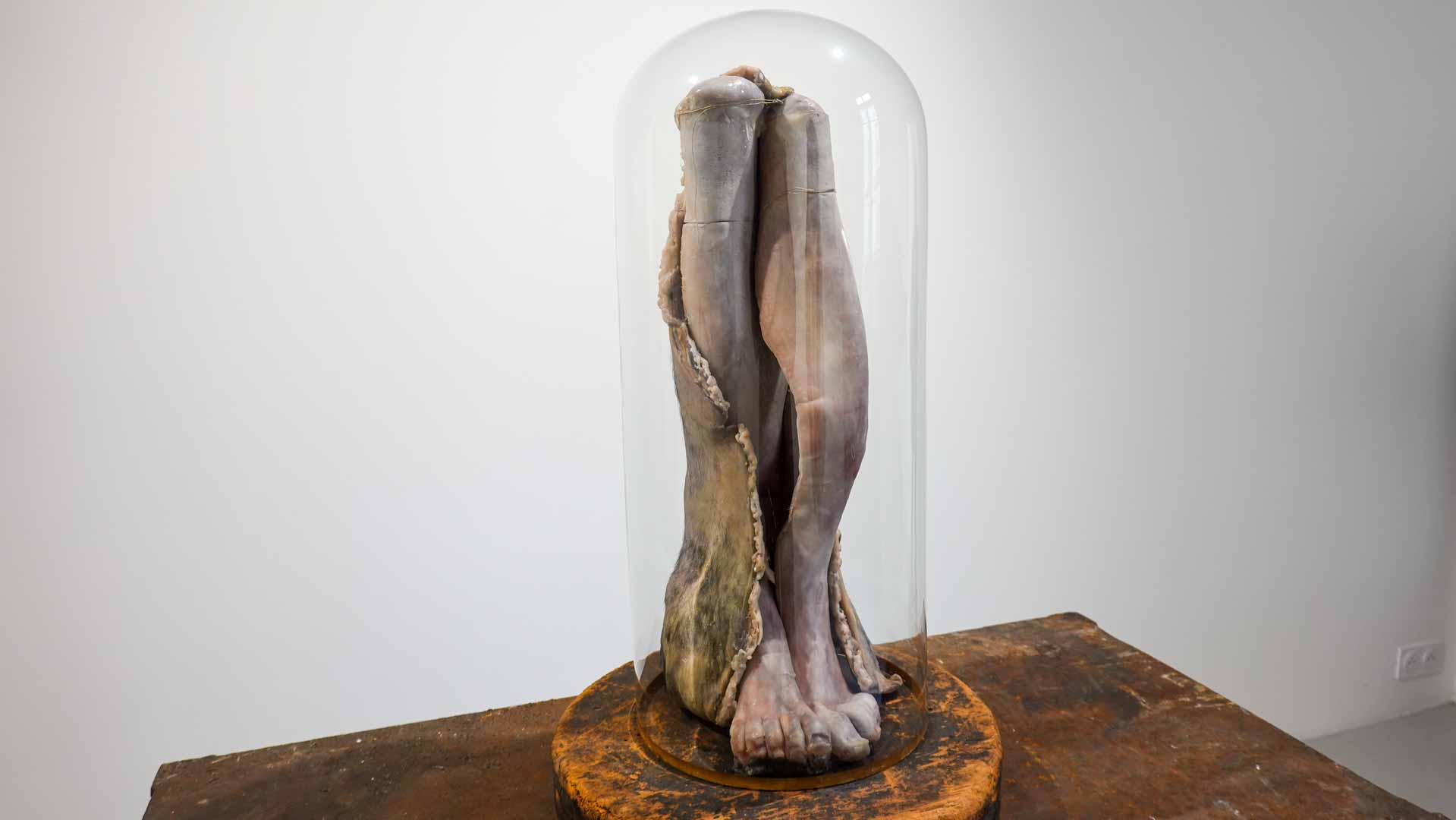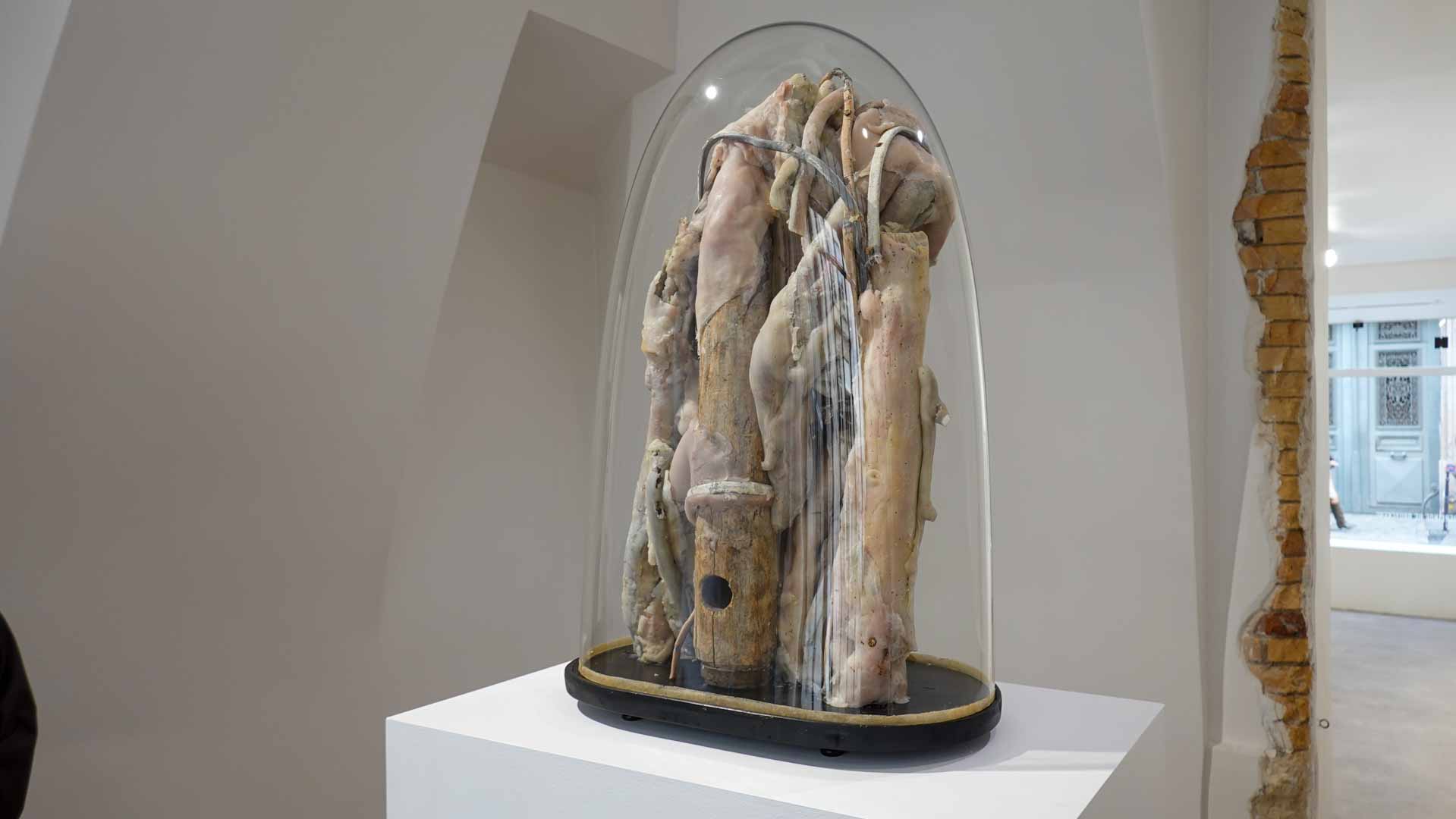 Les œuvres exposées utilisent des matériaux comme la cire, peaux animales, bois, textiles usés, rappelant la chair et l’organique. Parmi les pièces marquantes : les vitrines *Need VI* et *Need VII*, qui associent branches, peaux et corps en cire, ainsi que la sculpture *Madonna del Parto*. Ces œuvres oscillent entre attirance et répulsion, vie et mort, sacré et violence, en s’inspirant de l’iconographie religieuse, mythologique et de la nature.