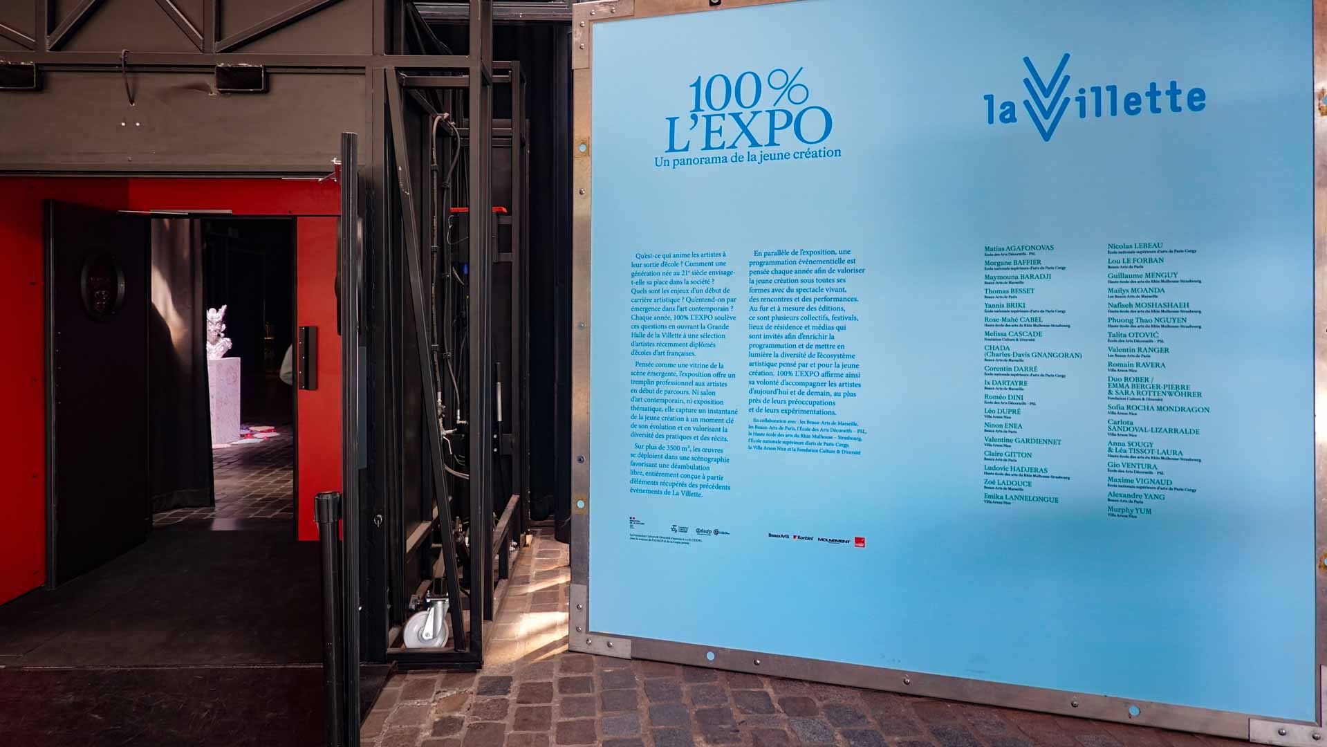 Qu’est-ce qui anime les artistes à leur sortie d’école et comment se frayent-ils un chemin dans la société et dans le monde de l’art ? Ces questions traversent la programmation de 100% L’EXPO, qui propose depuis plusieurs années un panorama éclectique d’une jeune scène artistique où formes, techniques, supports et expériences se plient à de nouveaux récits et manières de voir le monde. Établie en collaboration avec une sélection d’écoles françaises en partie renouvelée à chaque édition, la sélection présente les œuvres d’artistes diplômés ces cinq dernières années, au fil d’une scénographie inédite, elle aussi en prise avec des enjeux contemporains : sur plus de 3500 m2, elle est entièrement composée d’éléments de récupération (cimaises, socles, vitrines) d’anciens événements de La Villette. Lieu de découverte libre et stimulant pour le public, 100% L’EXPO est également pensée comme un tremplin professionnel pour ces artistes en début de carrière, l’opportunité de s’inscrire dans un réseau. Elle est aussi accompagnée d’un programme de performances et de rencontres.