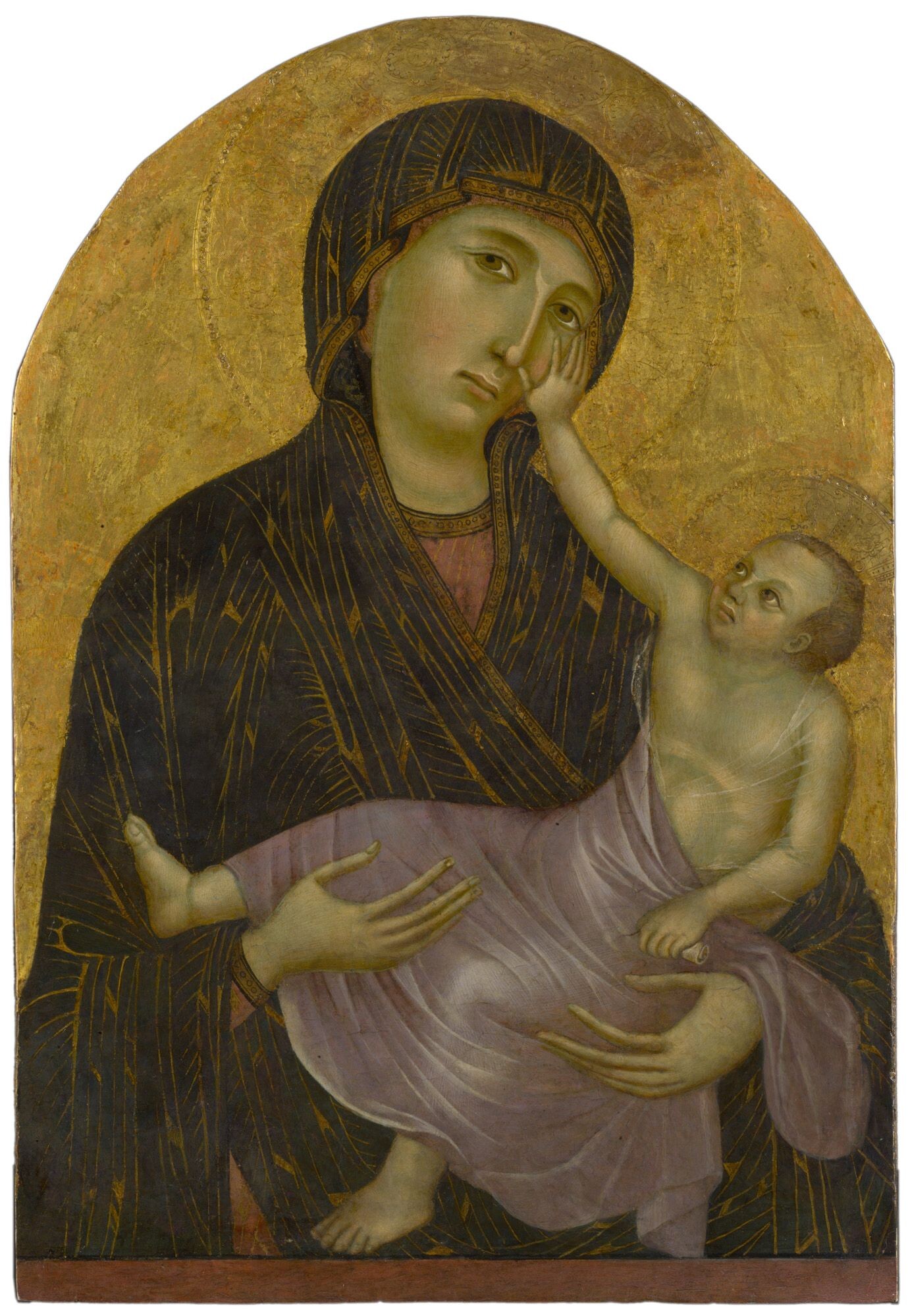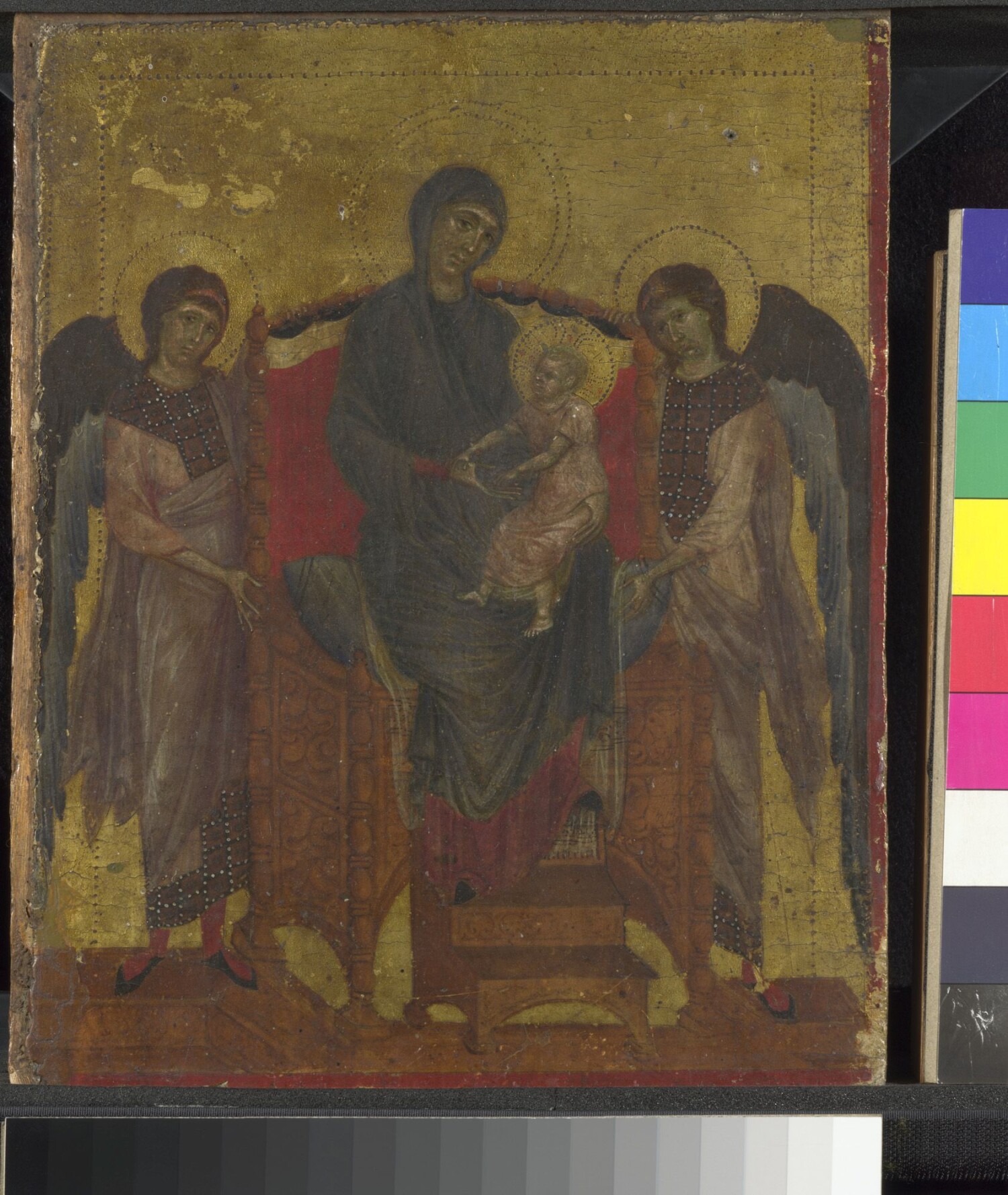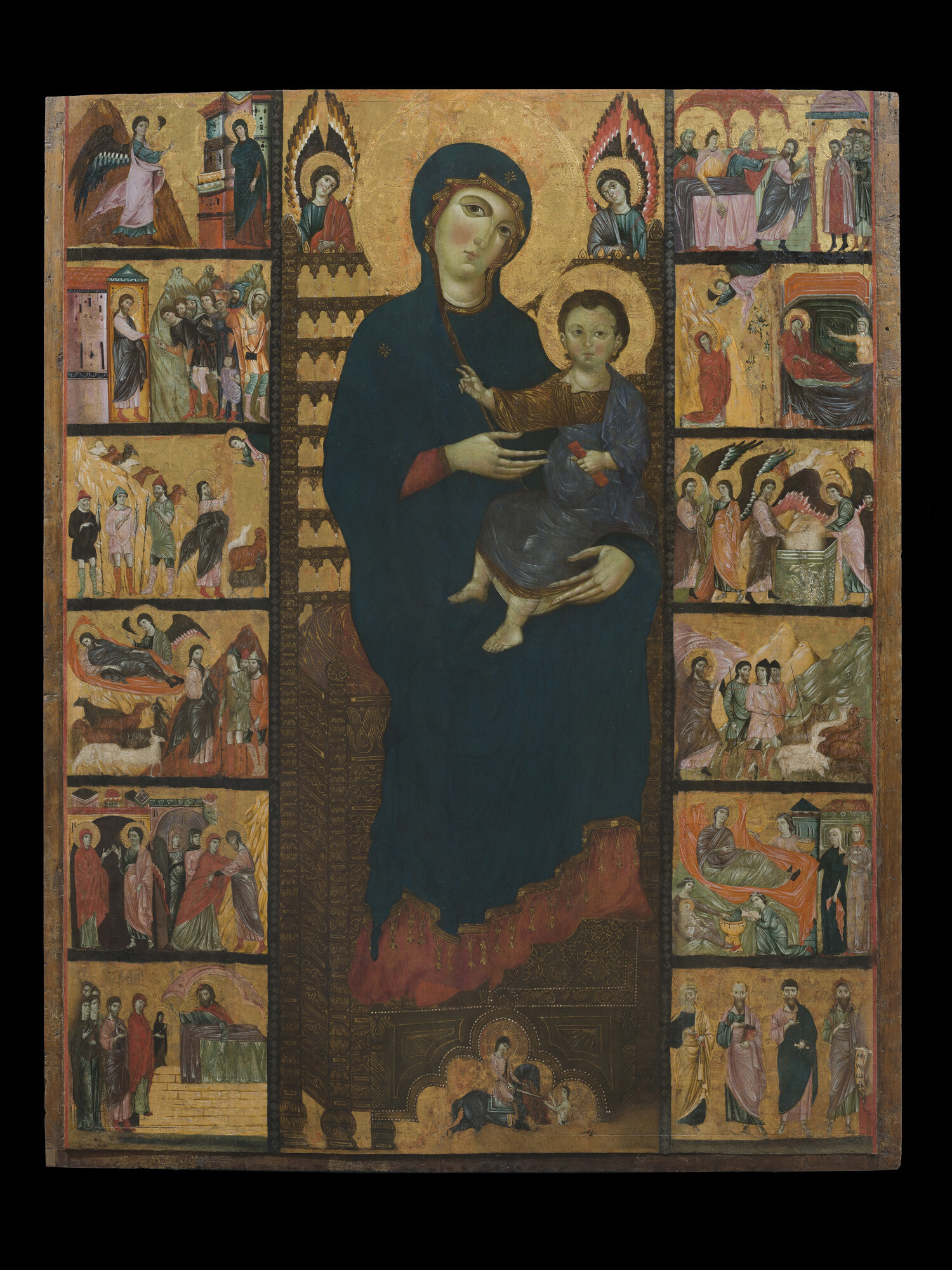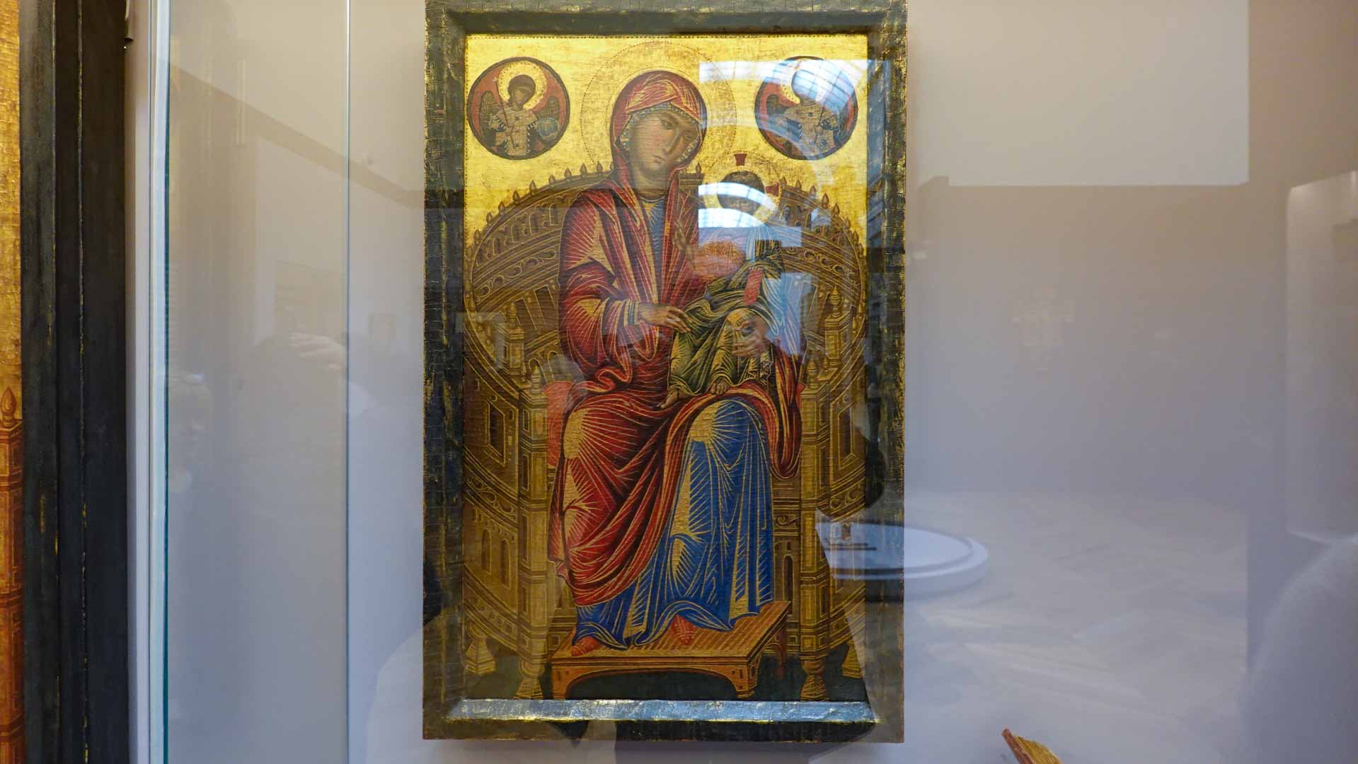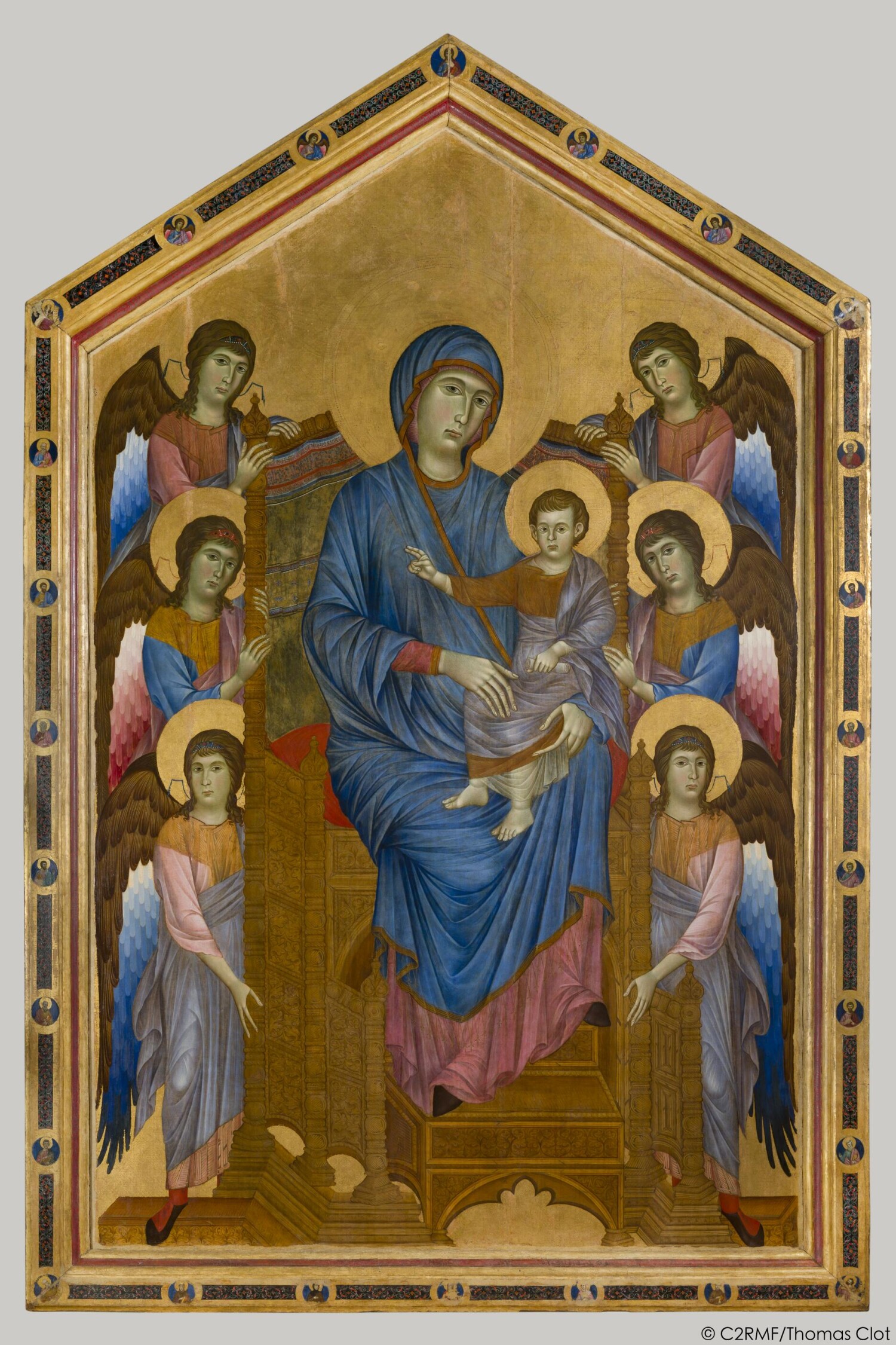 Parmi les œuvres majeures de Cimabue, la "Maestà" (ou "Vierge en majesté") est remarquable. Cette peinture, réalisée vers 1280, représente la Vierge Marie trônant avec l'Enfant Jésus, entourée d'anges et de saints. Elle illustre la transition vers un style plus humaniste, avec des figures plus expressives et une composition plus dynamique.