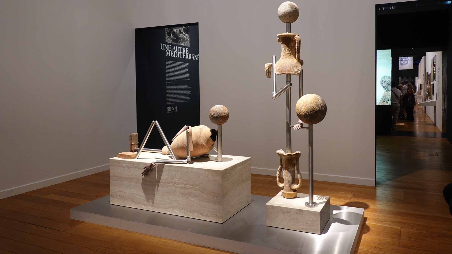 La distinction entre musées de beaux-arts et musées d’ethnographie a créé des frontières entre les objets qu’ils conservent et les disciplines qui les étudient. Le Mucem souhaite aujourd’hui dépasser ces frontières et mettre en évidence les parallèles et les influences mutuelles qui existent entre ces deux types de musée. Suivant cette idée, "Méditerranées" mêle différents modèles muséographiques historiques, de l’accrochage dense des musées de beaux-arts de la fin du XVIIIe et du XIXe siècles, aux différentes formes de présentation utilisées au cours de l’histoire par les musées d’ethnographie."
