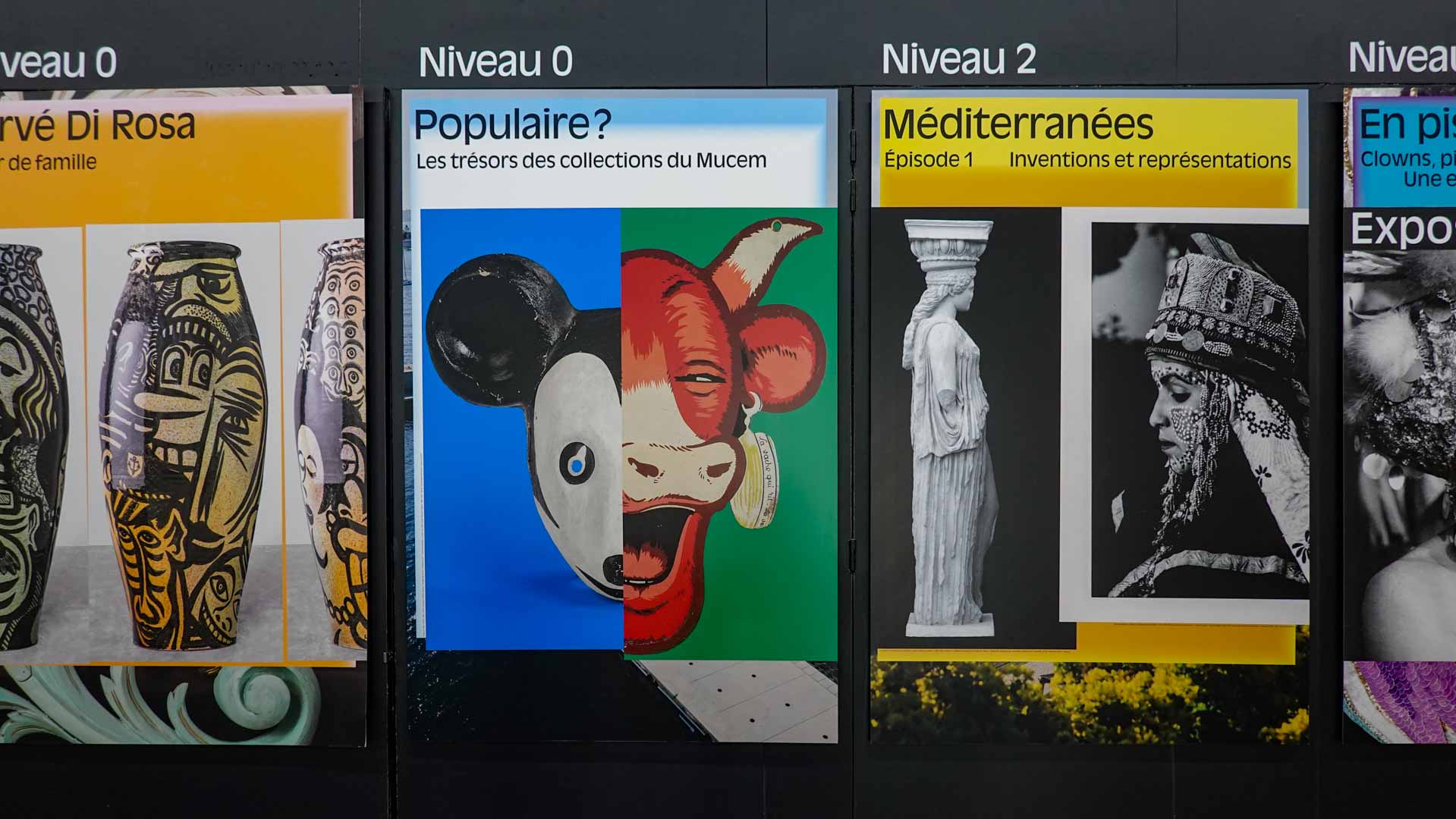 Le parcours général propose un cheminement au gré de grandes catégories empruntées au vocabulaire de l’histoire des arts et des techniques ("peinture", "sculpture", "arts du métal", "céramique", etc.). Un parcours qui fait émerger les particularités de la collection du Mucem en rompant avec la hiérarchisation habituelle entre beaux-arts et arts populaires. On passe ainsi d’objets attendus dans un musée (par exemple des tableaux, des ex-voto, des icônes, etc.) à des éléments plus surprenants (comme des portes de ruche décorées) et d’objets familiers du grand public à des éléments plus inattendus voire mystérieux de prime abord.