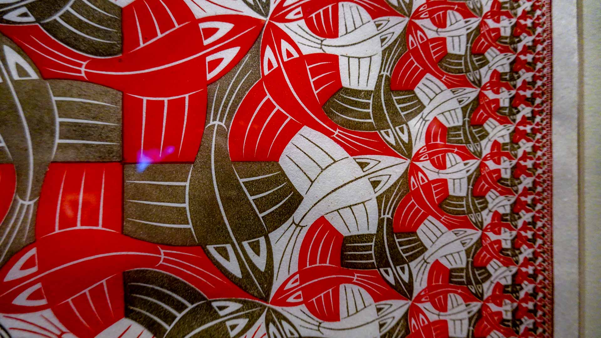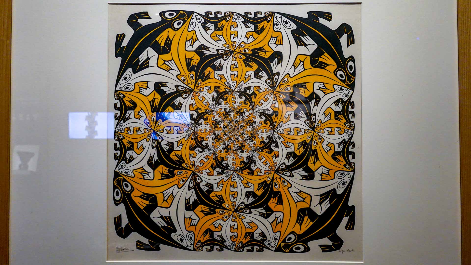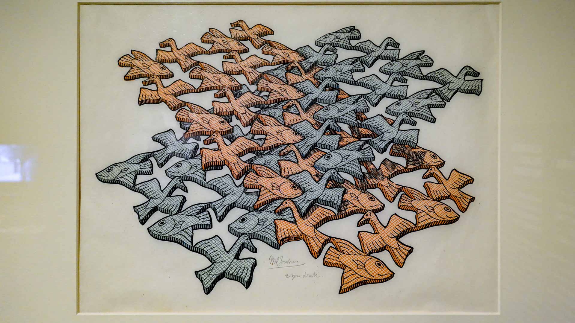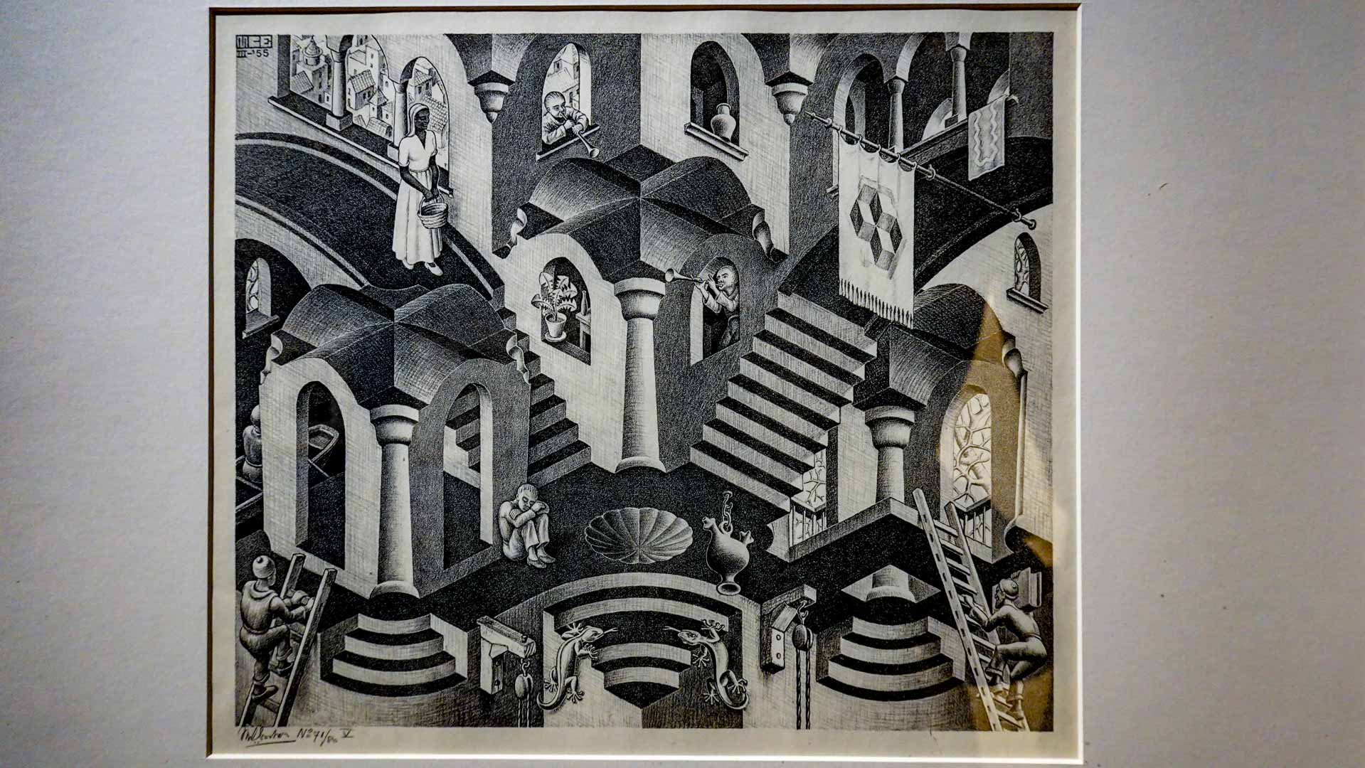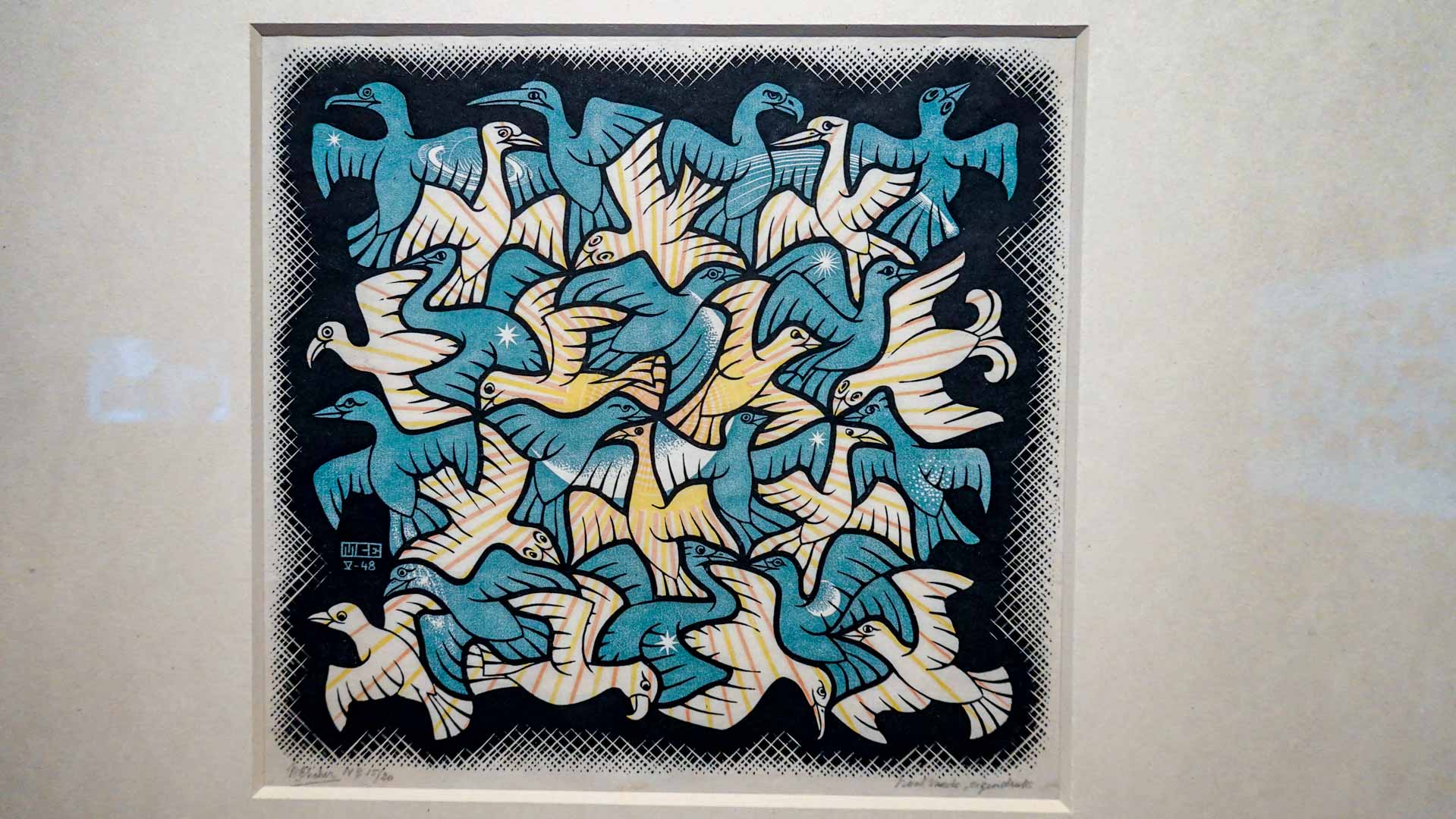 Son œuvre explore des mécanismes spatiaux et mathématiques complexes : perspective classique mais aussi perspective inversée, multiples points de fuite et perspectives impossibles comme dans Relativity, où les repères de gravité se contredisent. Il utilise les tessellations avec une rigueur quasi scientifique, transformant des motifs décoratifs hérités de l’art islamique en créatures qui se métamorphosent et s’emboîtent sans lacune, comme dans Ciel et Eau ou Reptiles. Les séries Circle Limit témoignent de son intérêt pour la géométrie hyperbolique, qu’il rend visible grâce à des transformations continues qui évoquent l’infini.