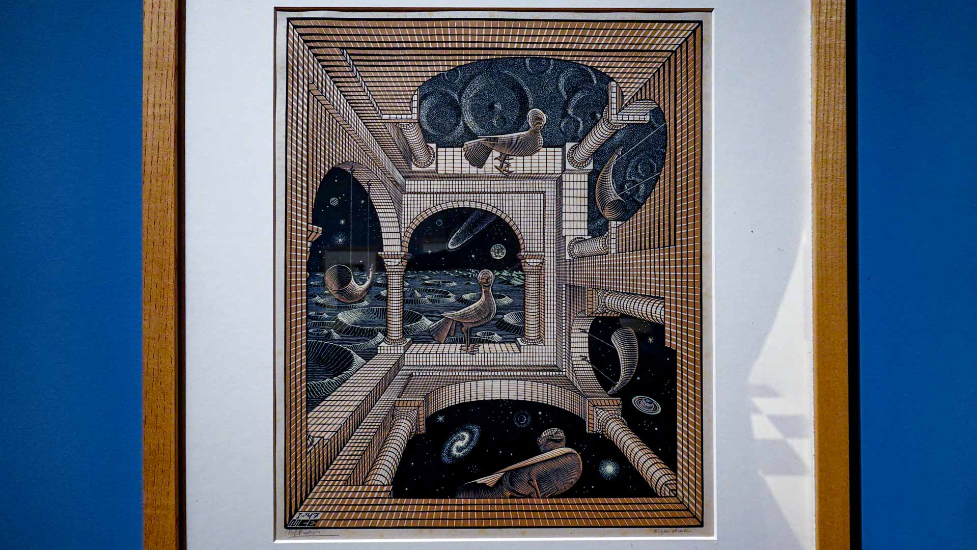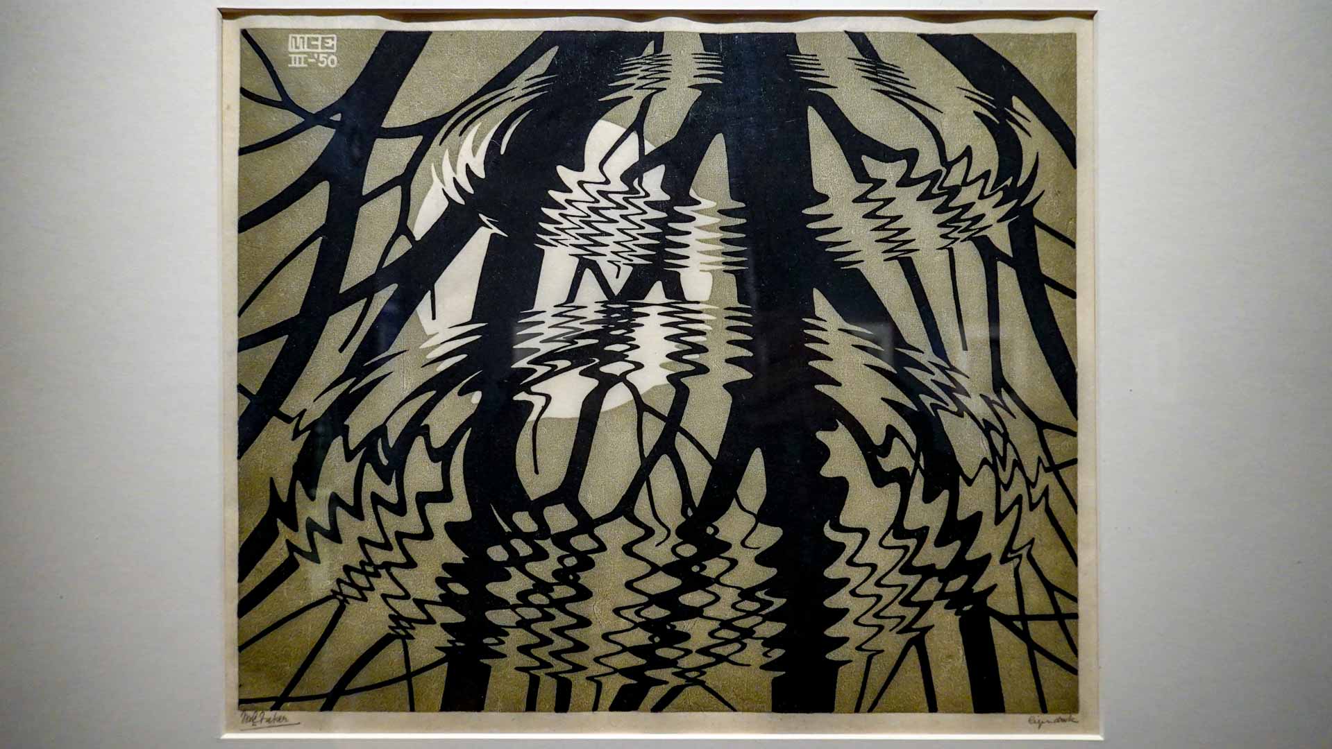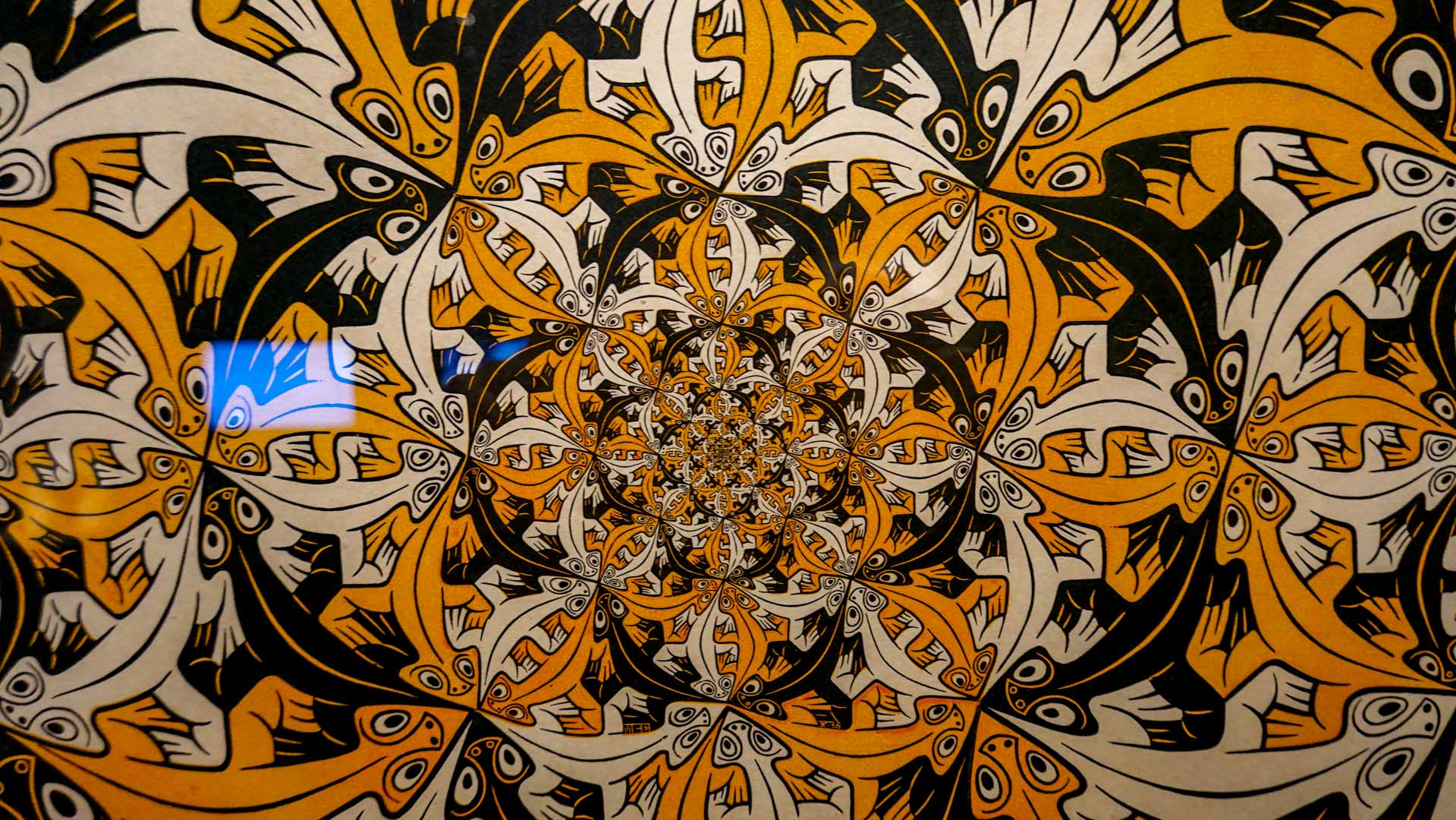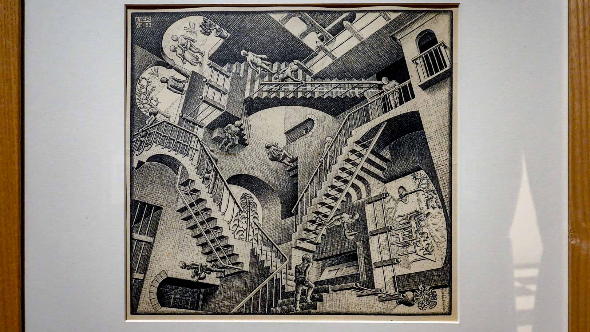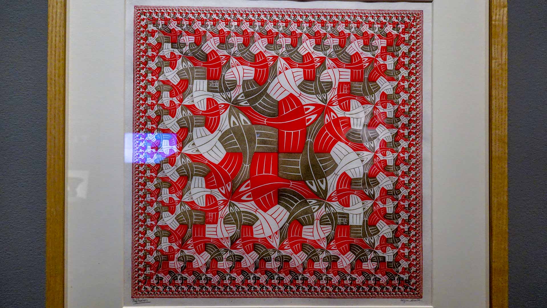 Son œuvre explore des mécanismes spatiaux et mathématiques complexes : perspective classique mais aussi perspective inversée, multiples points de fuite et perspectives impossibles comme dans Relativity, où les repères de gravité se contredisent. Il utilise les tessellations avec une rigueur quasi scientifique, transformant des motifs décoratifs hérités de l’art islamique en créatures qui se métamorphosent et s’emboîtent sans lacune, comme dans Ciel et Eau ou Reptiles. Les séries Circle Limit témoignent de son intérêt pour la géométrie hyperbolique, qu’il rend visible grâce à des transformations continues qui évoquent l’infini.