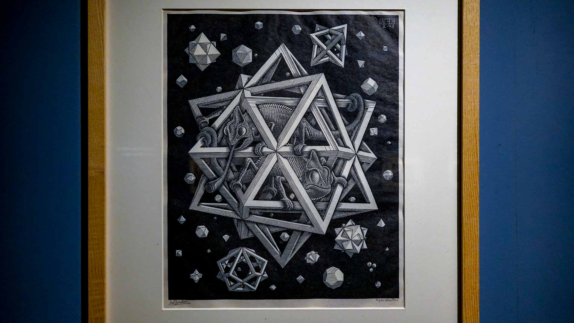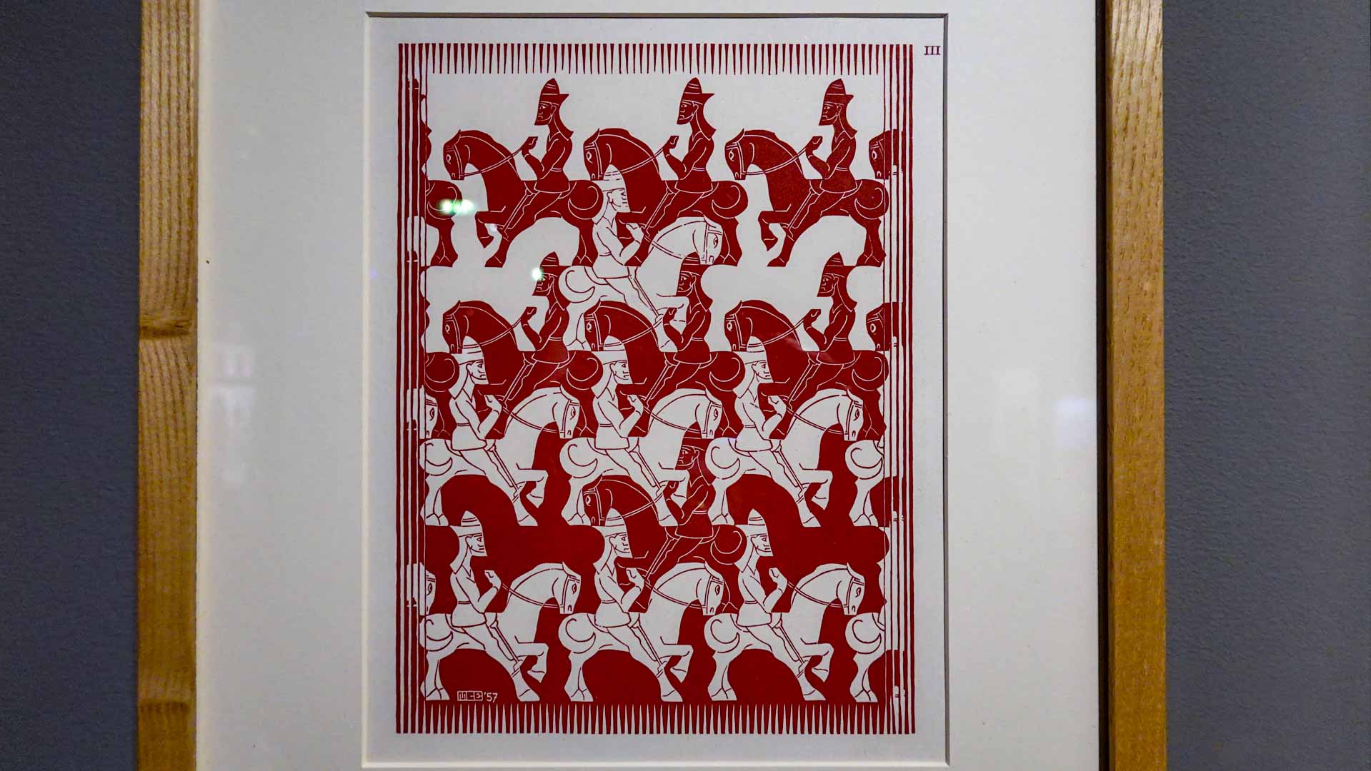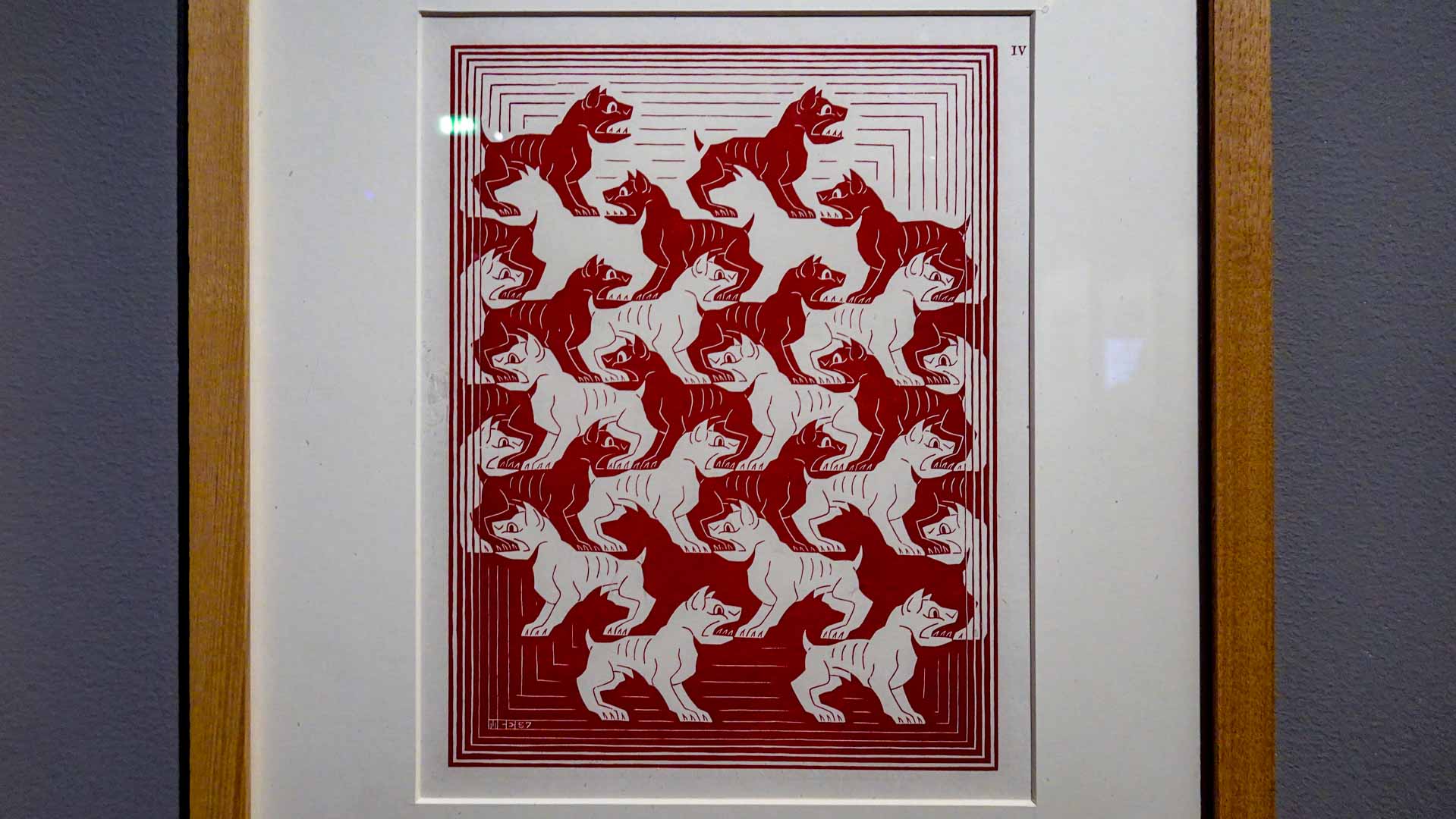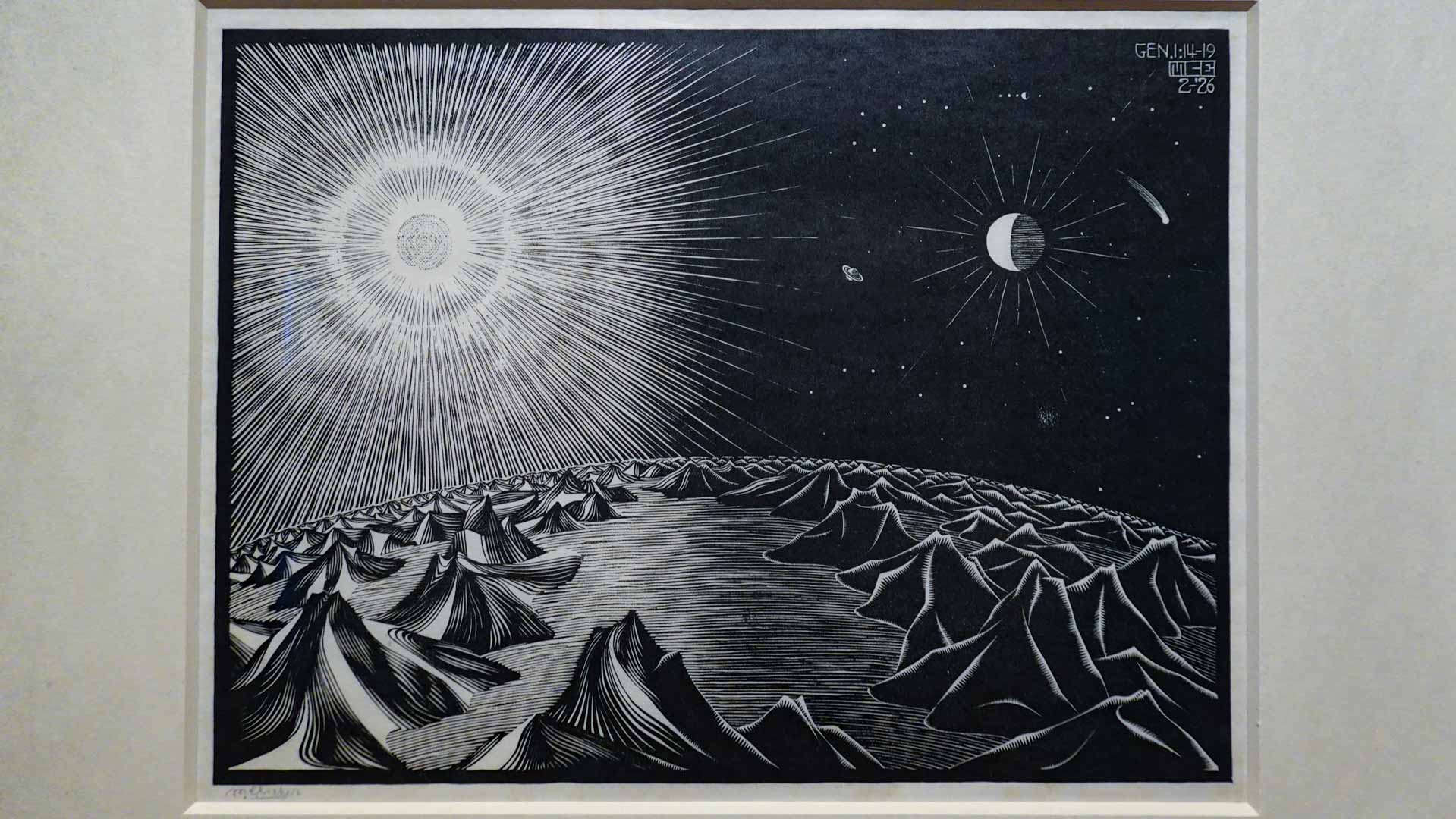 Son œuvre explore des mécanismes spatiaux et mathématiques complexes : perspective classique mais aussi perspective inversée, multiples points de fuite et perspectives impossibles comme dans Relativity, où les repères de gravité se contredisent. Il utilise les tessellations avec une rigueur quasi scientifique, transformant des motifs décoratifs hérités de l’art islamique en créatures qui se métamorphosent et s’emboîtent sans lacune, comme dans Ciel et Eau ou Reptiles. Les séries Circle Limit témoignent de son intérêt pour la géométrie hyperbolique, qu’il rend visible grâce à des transformations continues qui évoquent l’infini.