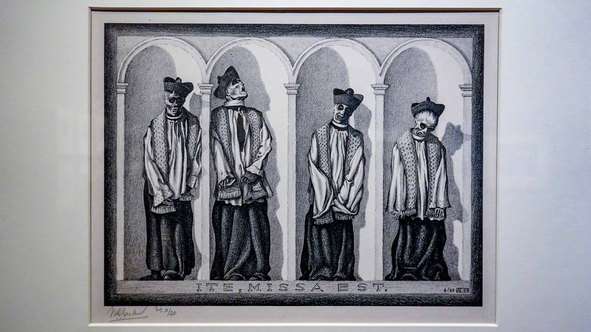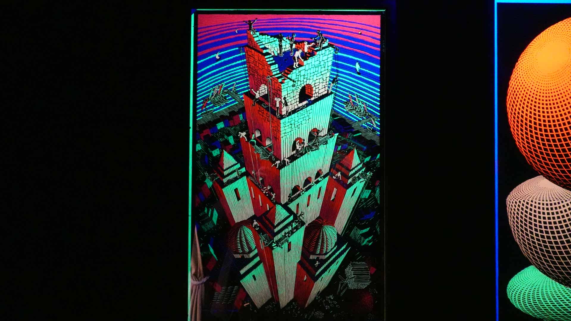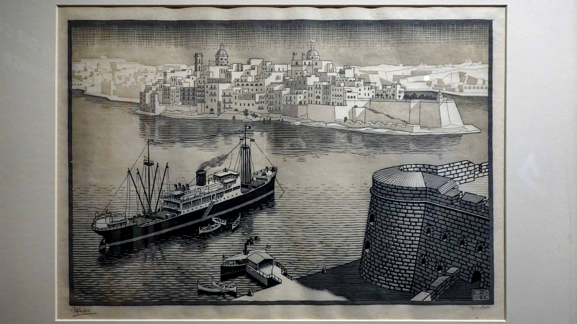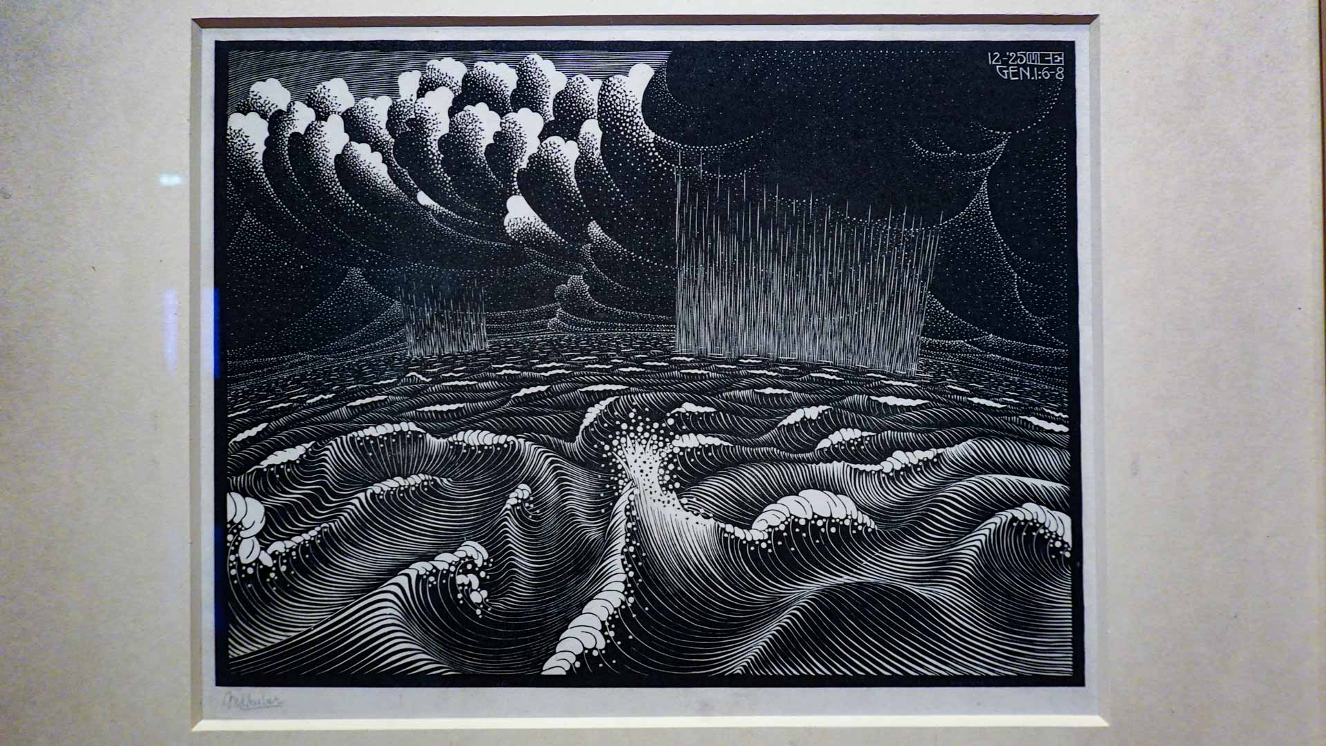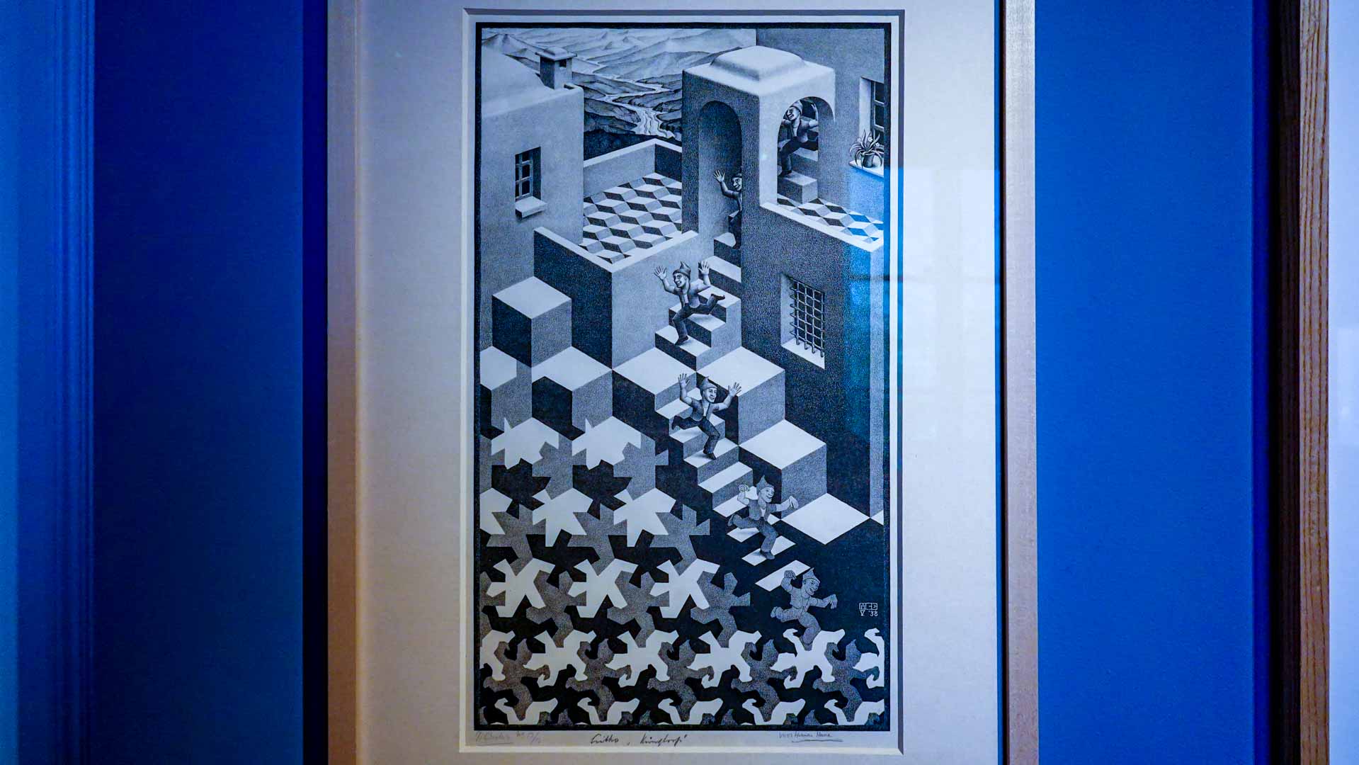 Son œuvre explore des mécanismes spatiaux et mathématiques complexes : perspective classique mais aussi perspective inversée, multiples points de fuite et perspectives impossibles comme dans Relativity, où les repères de gravité se contredisent. Il utilise les tessellations avec une rigueur quasi scientifique, transformant des motifs décoratifs hérités de l’art islamique en créatures qui se métamorphosent et s’emboîtent sans lacune, comme dans Ciel et Eau ou Reptiles. Les séries Circle Limit témoignent de son intérêt pour la géométrie hyperbolique, qu’il rend visible grâce à des transformations continues qui évoquent l’infini.