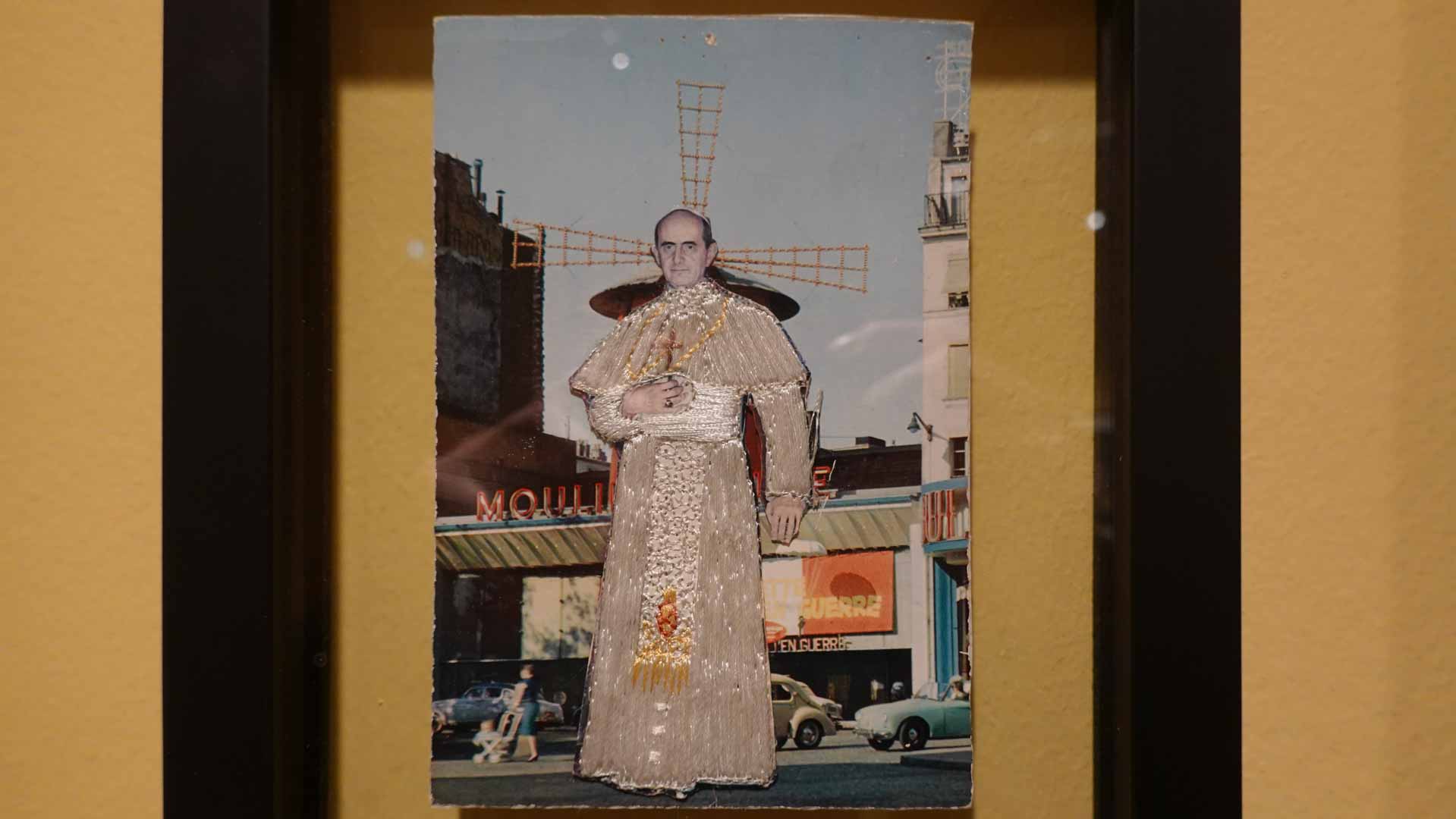 À partir de matériaux simples, illustrations de magazines, gravures anciennes, photographies ou affiches, il compose des œuvres pleines de contrastes et d'ironie, reflétant son esprit libre et son sens aigu du détournement.
