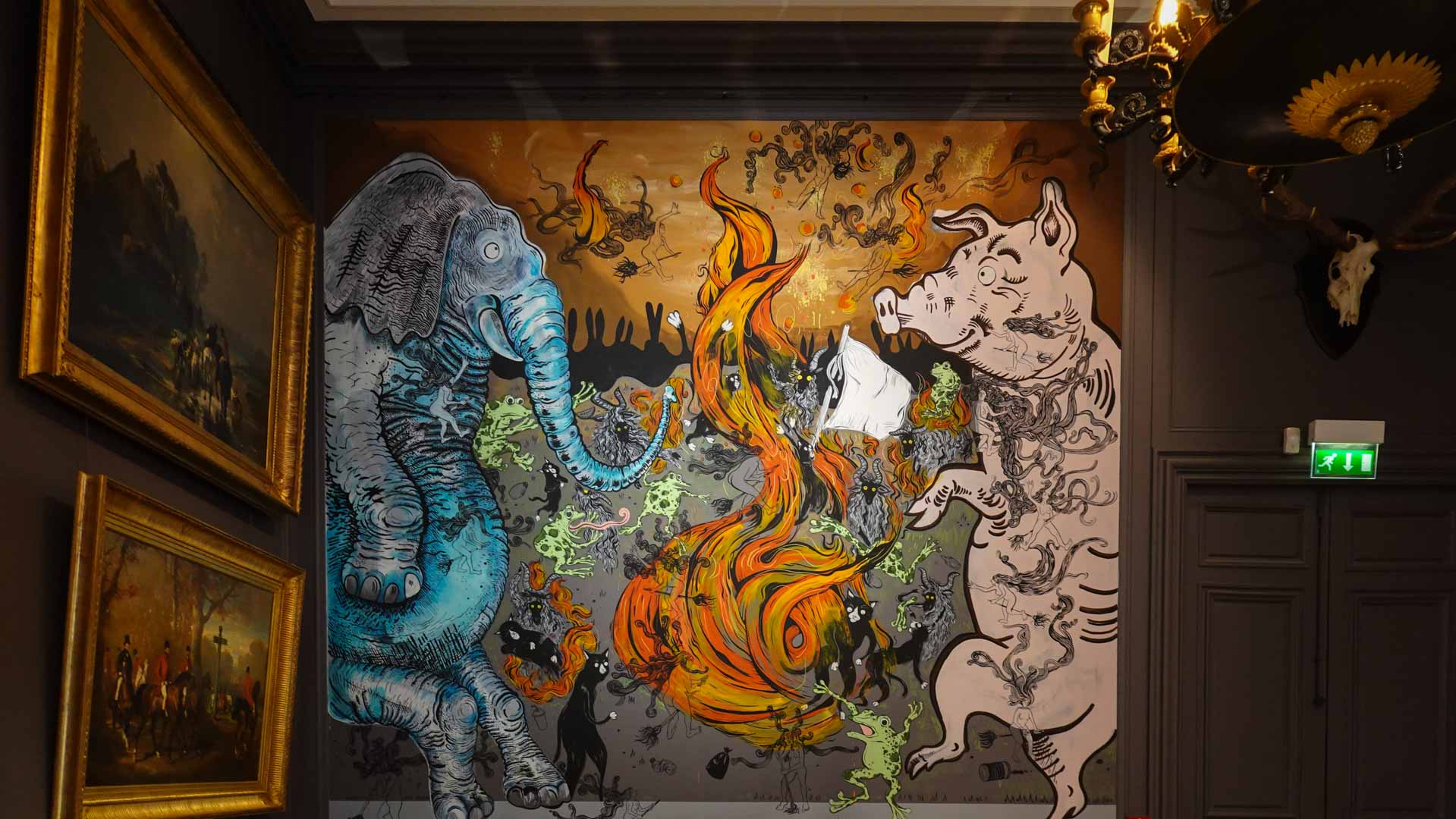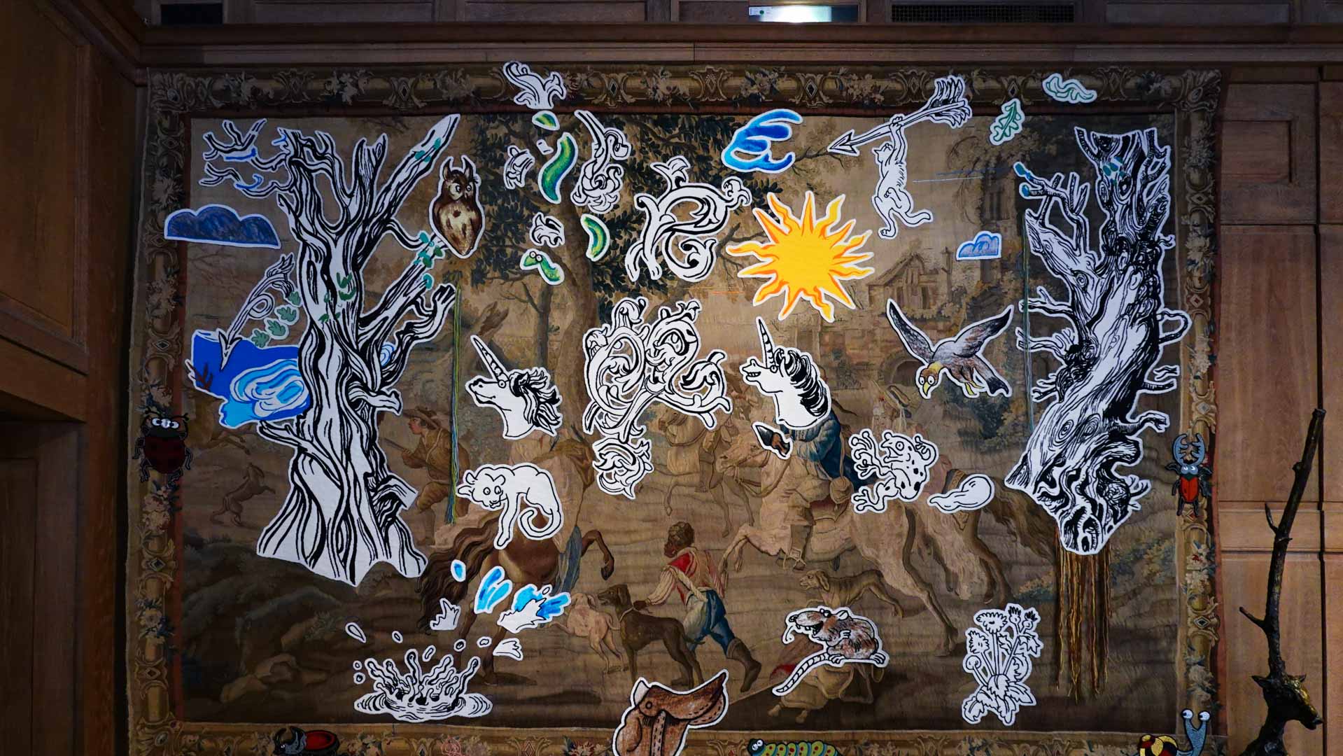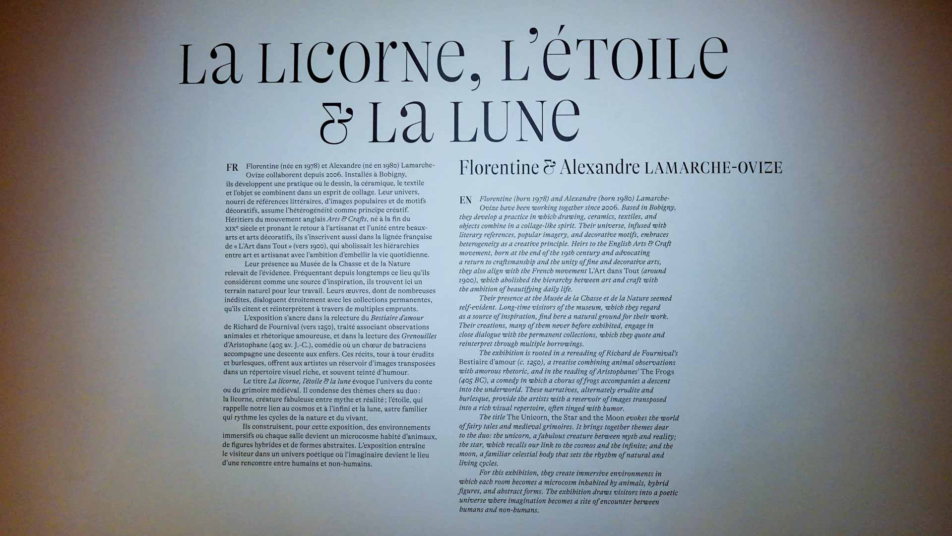 Conçue par le duo d’artistes Florentine et Alexandre Lamarche-Ovize, elle s’articule autour de trois motifs symboliques — la licorne, l’étoile et la lune — qui deviennent les fils narratifs d’un parcours poétique au sein du Musée de la Chasse et de la Nature.