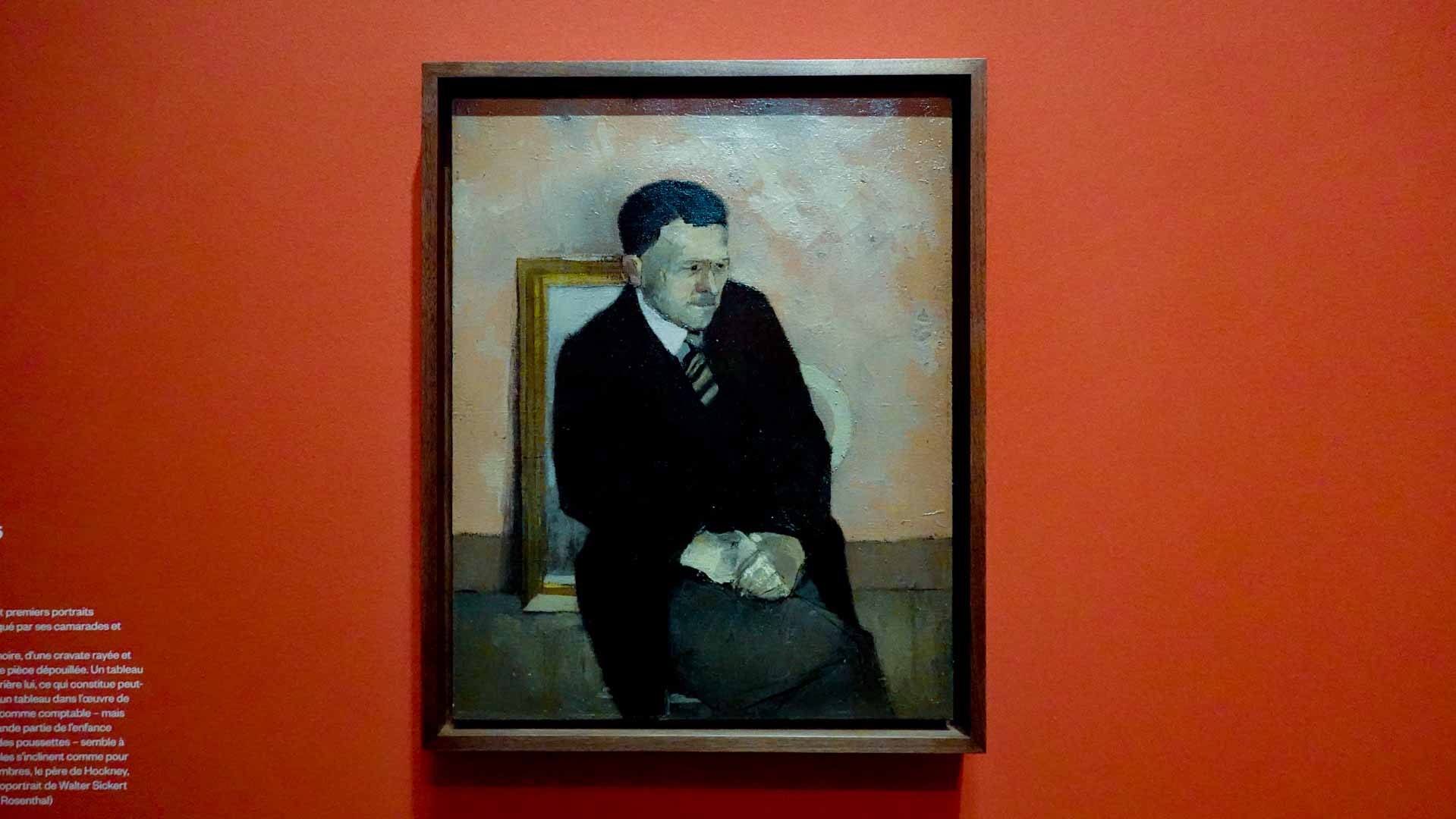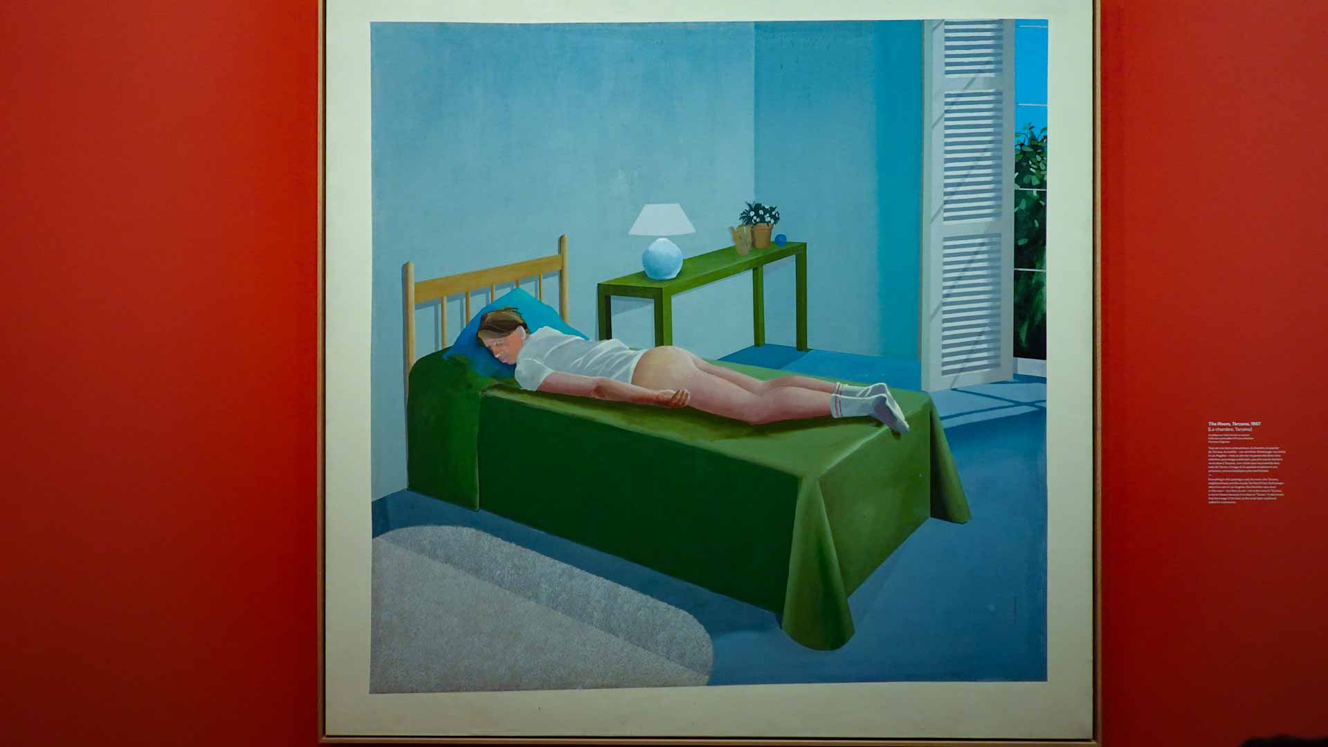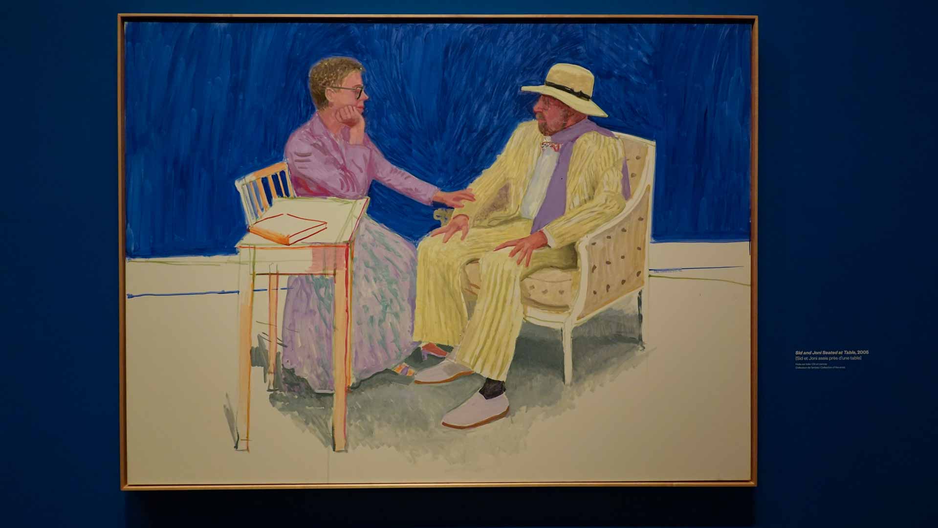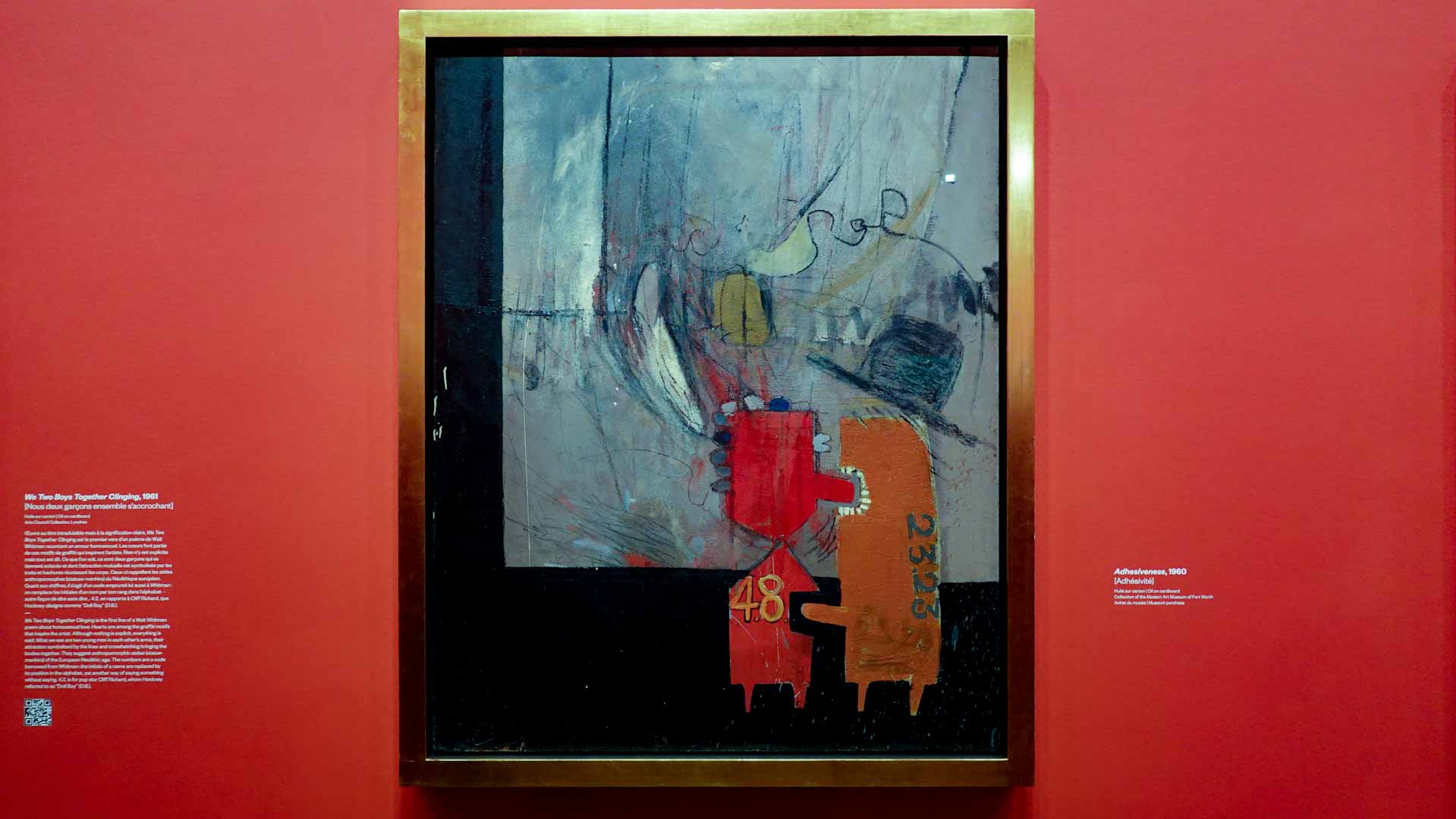 L'exposition débute avec des œuvres de jeunesse, telles que le portrait de son père réalisé en 1955, et des toiles emblématiques des années 1960 abordant l'homosexualité, comme We Two Boys Together Clinging (1961) et Two Men in a Shower (1963). Elle met également en lumière ses célèbres scènes californiennes, notamment A Bigger Splash (1967) et Portrait of an Artist (Pool with Two Figures) (1972), capturant l'esthétique ensoleillée de Los Angeles.