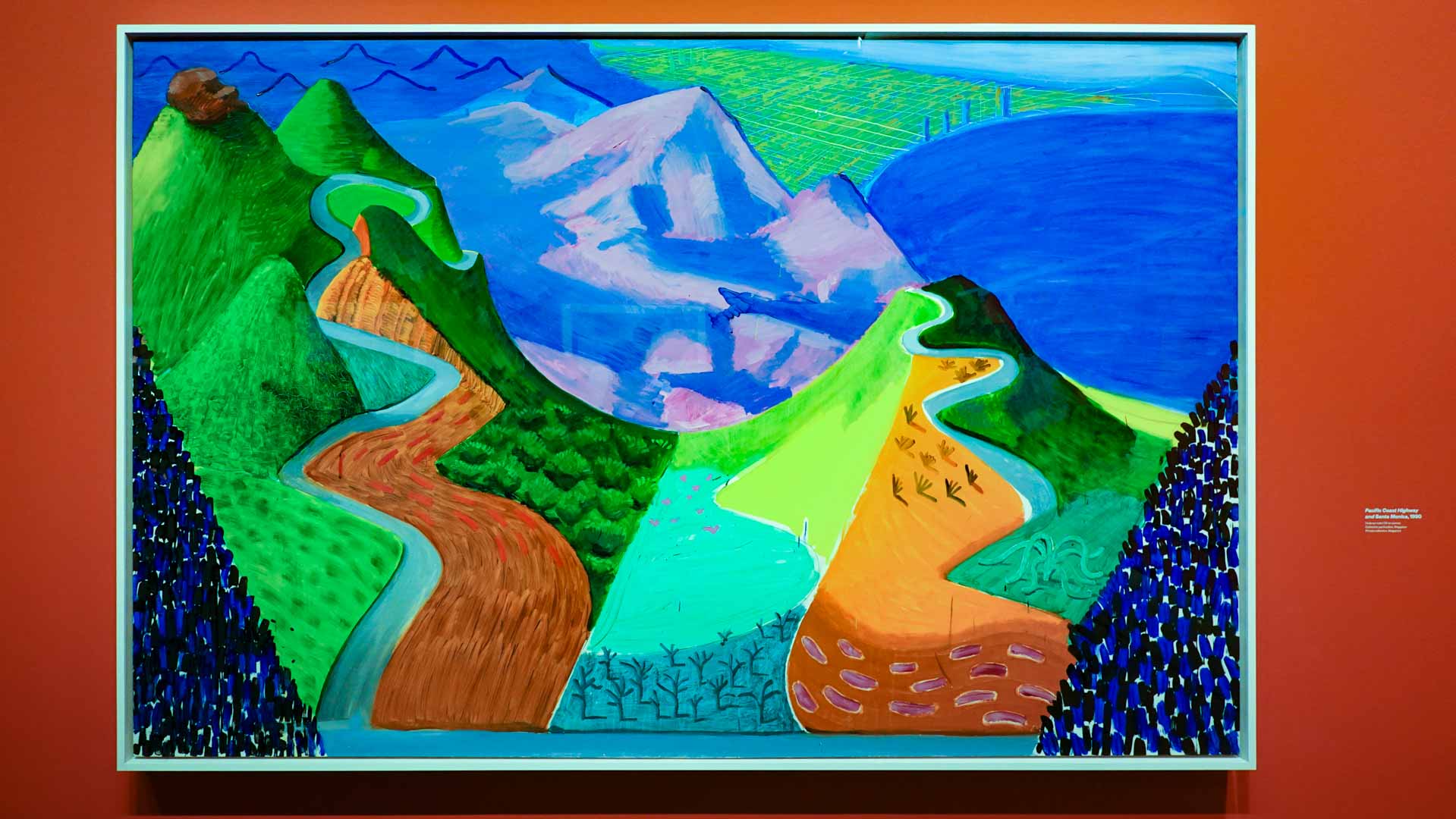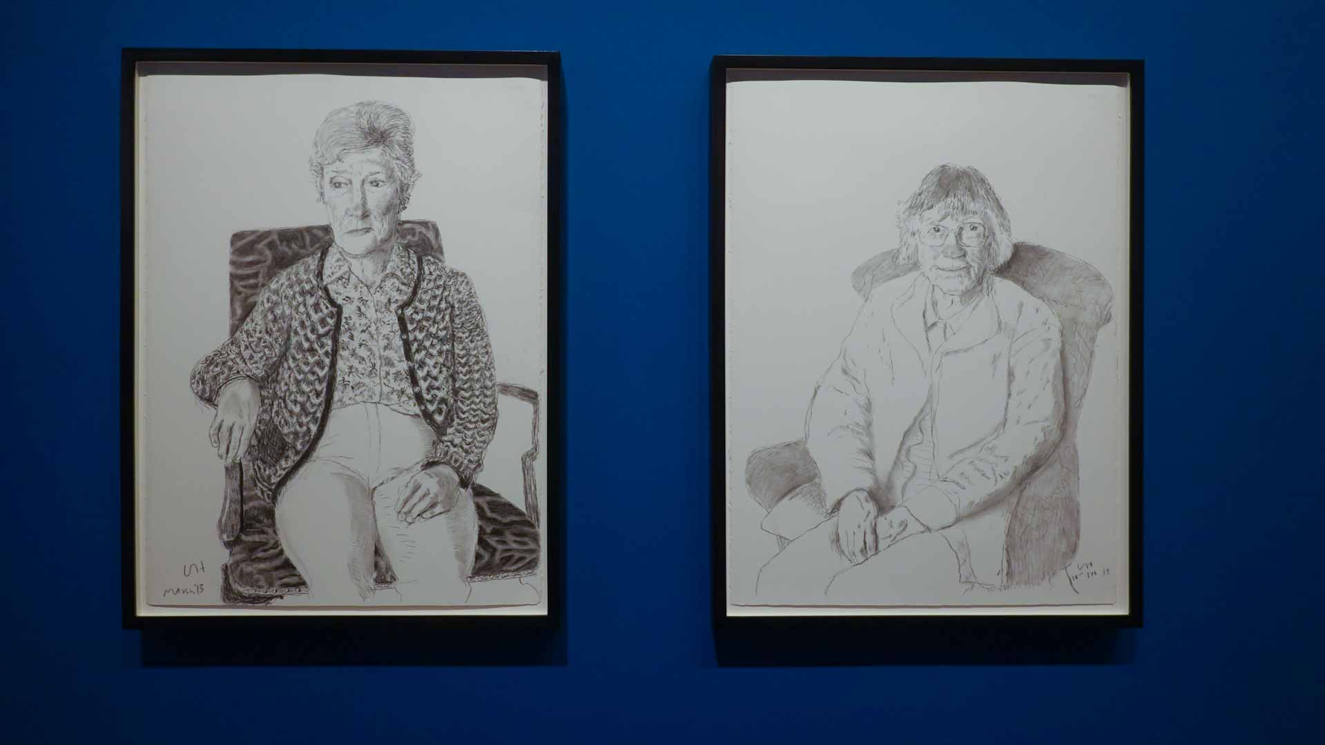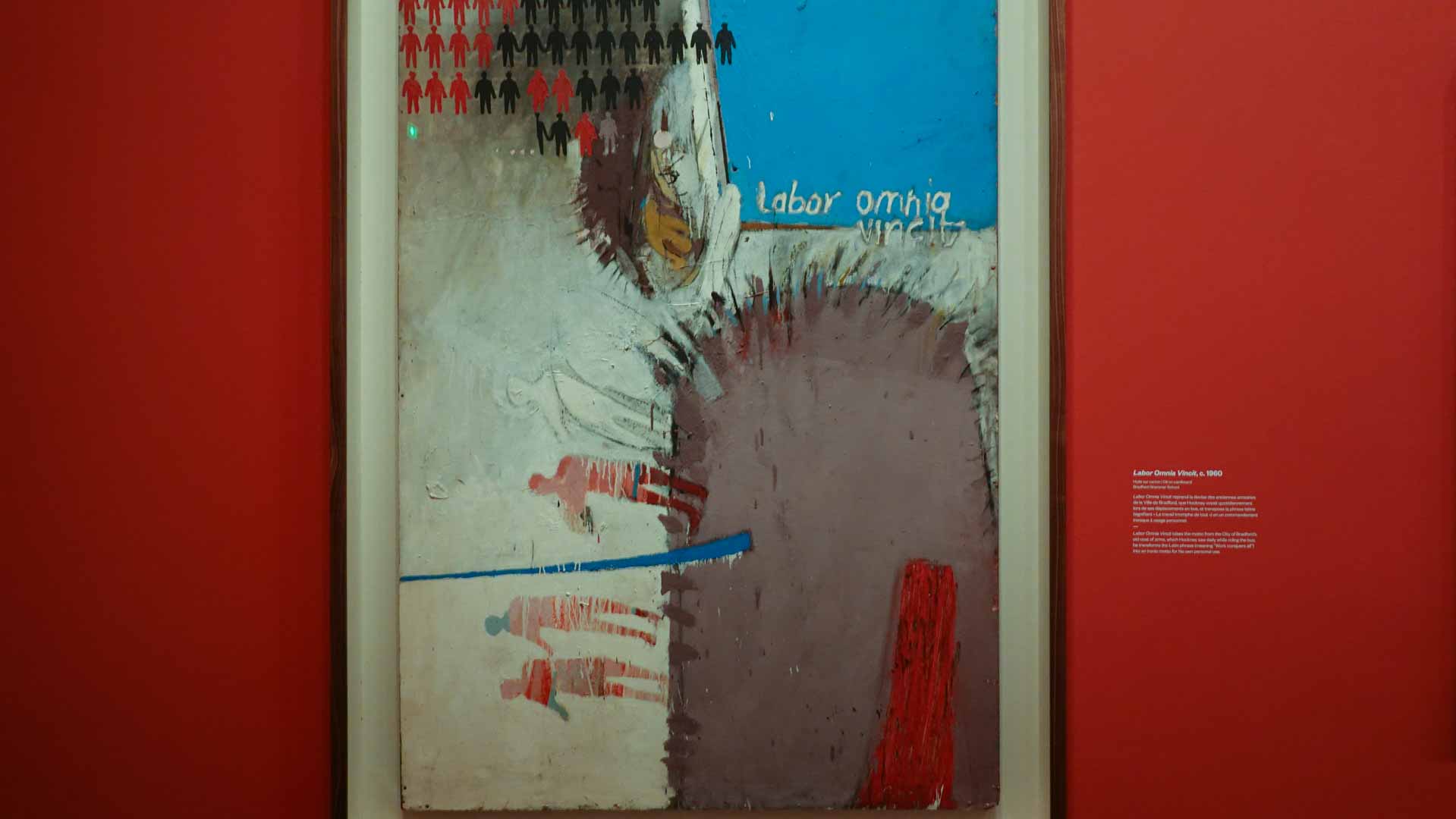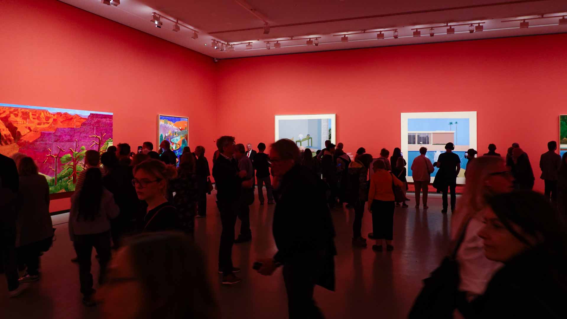 L'exposition débute avec des œuvres de jeunesse, telles que le portrait de son père réalisé en 1955, et des toiles emblématiques des années 1960 abordant l'homosexualité, comme We Two Boys Together Clinging (1961) et Two Men in a Shower (1963). Elle met également en lumière ses célèbres scènes californiennes, notamment A Bigger Splash (1967) et Portrait of an Artist (Pool with Two Figures) (1972), capturant l'esthétique ensoleillée de Los Angeles.