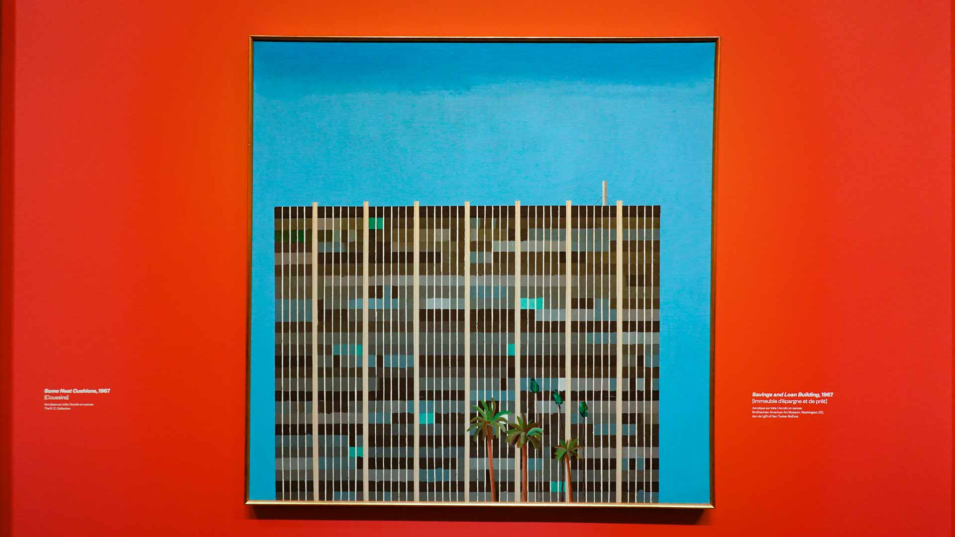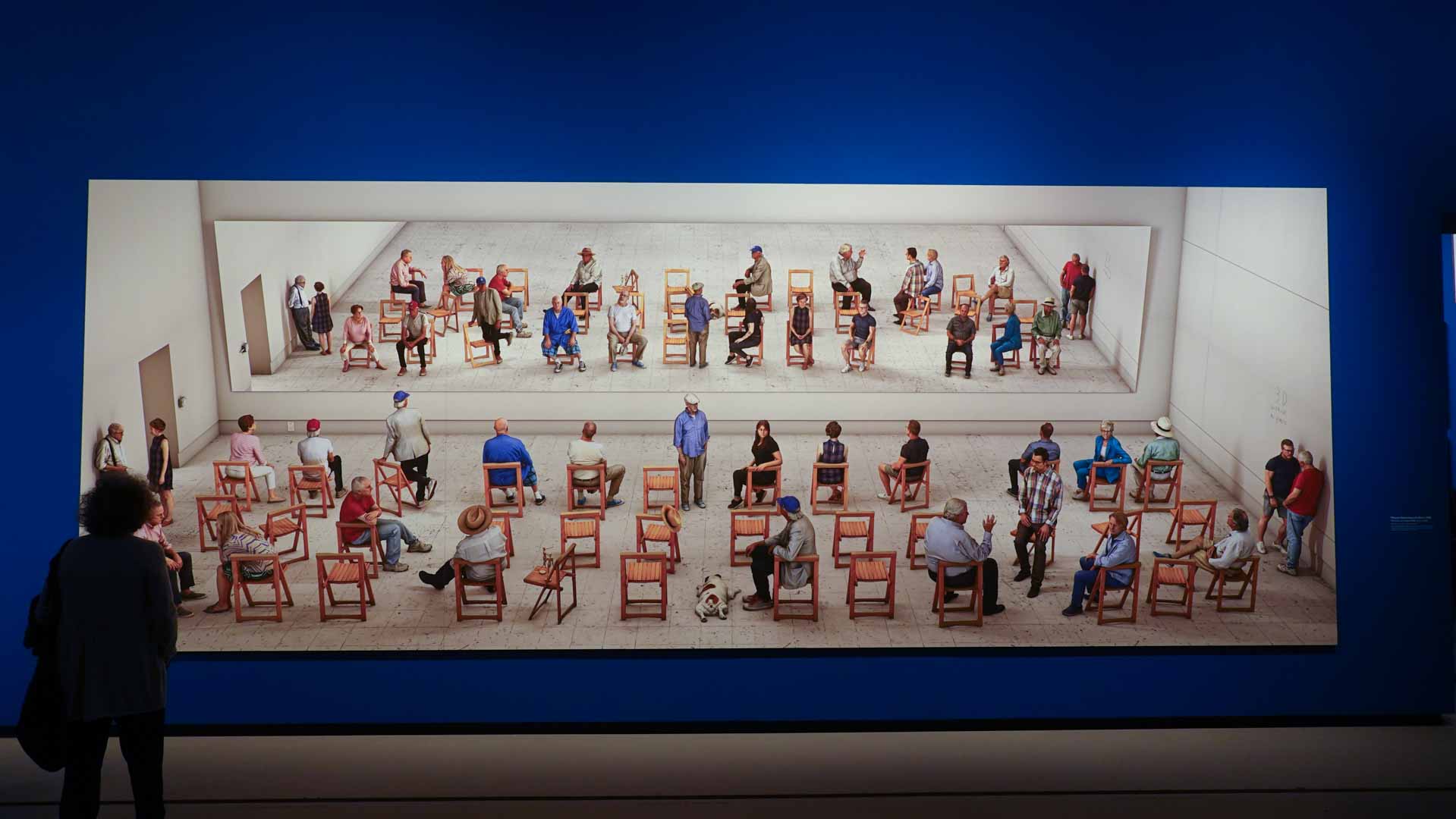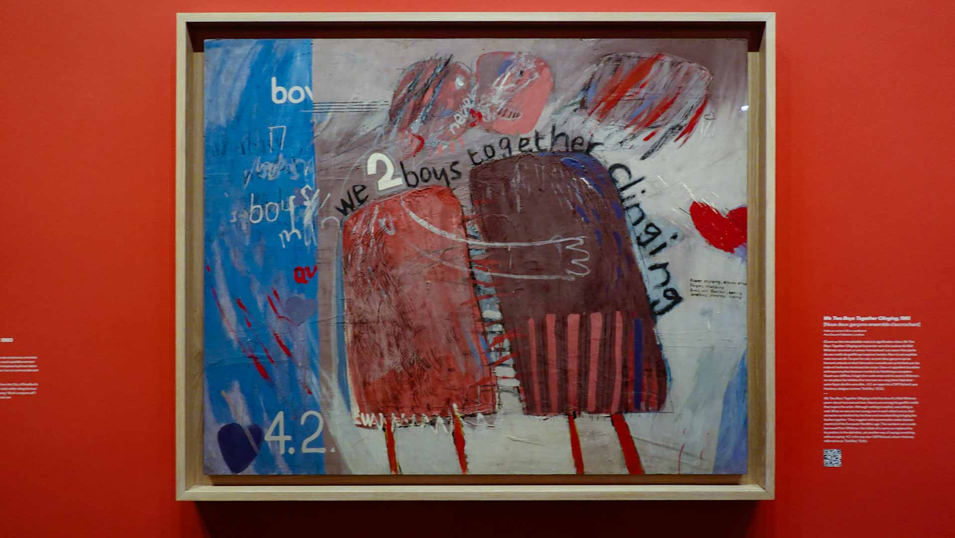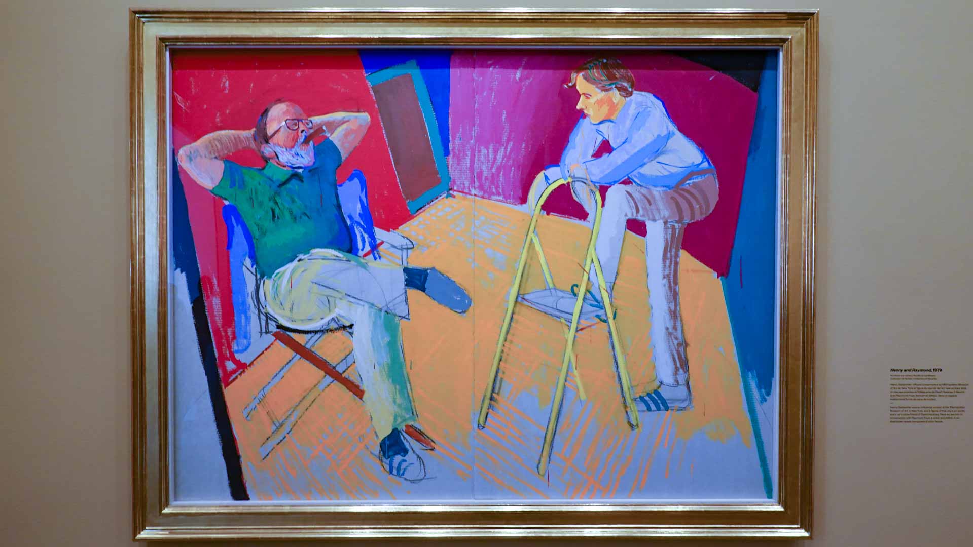 L'exposition débute avec des œuvres de jeunesse, telles que le portrait de son père réalisé en 1955, et des toiles emblématiques des années 1960 abordant l'homosexualité, comme We Two Boys Together Clinging (1961) et Two Men in a Shower (1963). Elle met également en lumière ses célèbres scènes californiennes, notamment A Bigger Splash (1967) et Portrait of an Artist (Pool with Two Figures) (1972), capturant l'esthétique ensoleillée de Los Angeles.