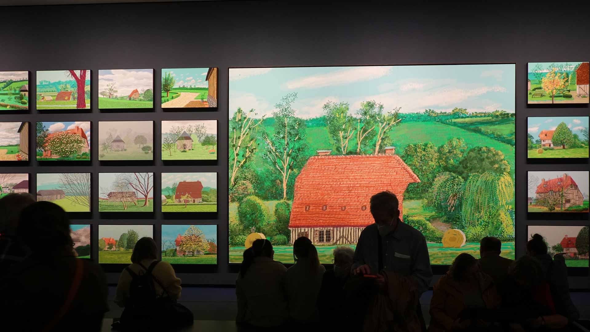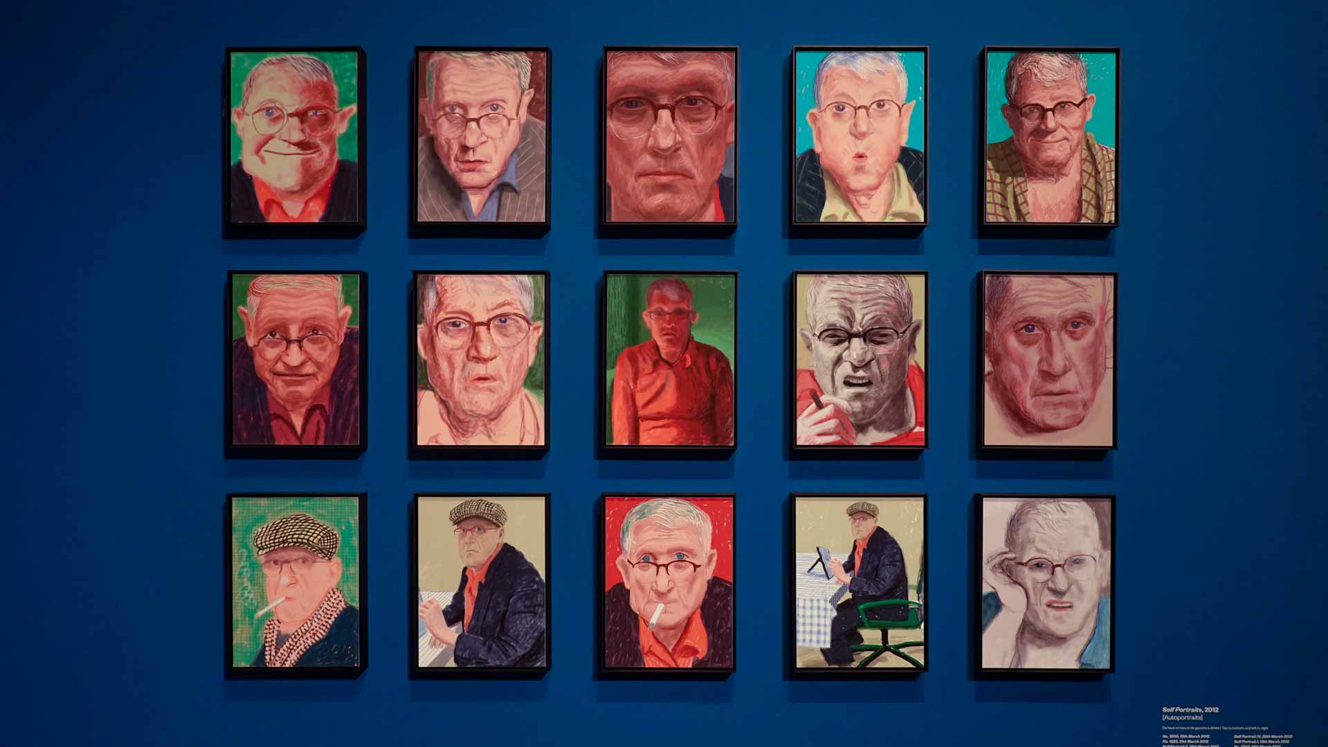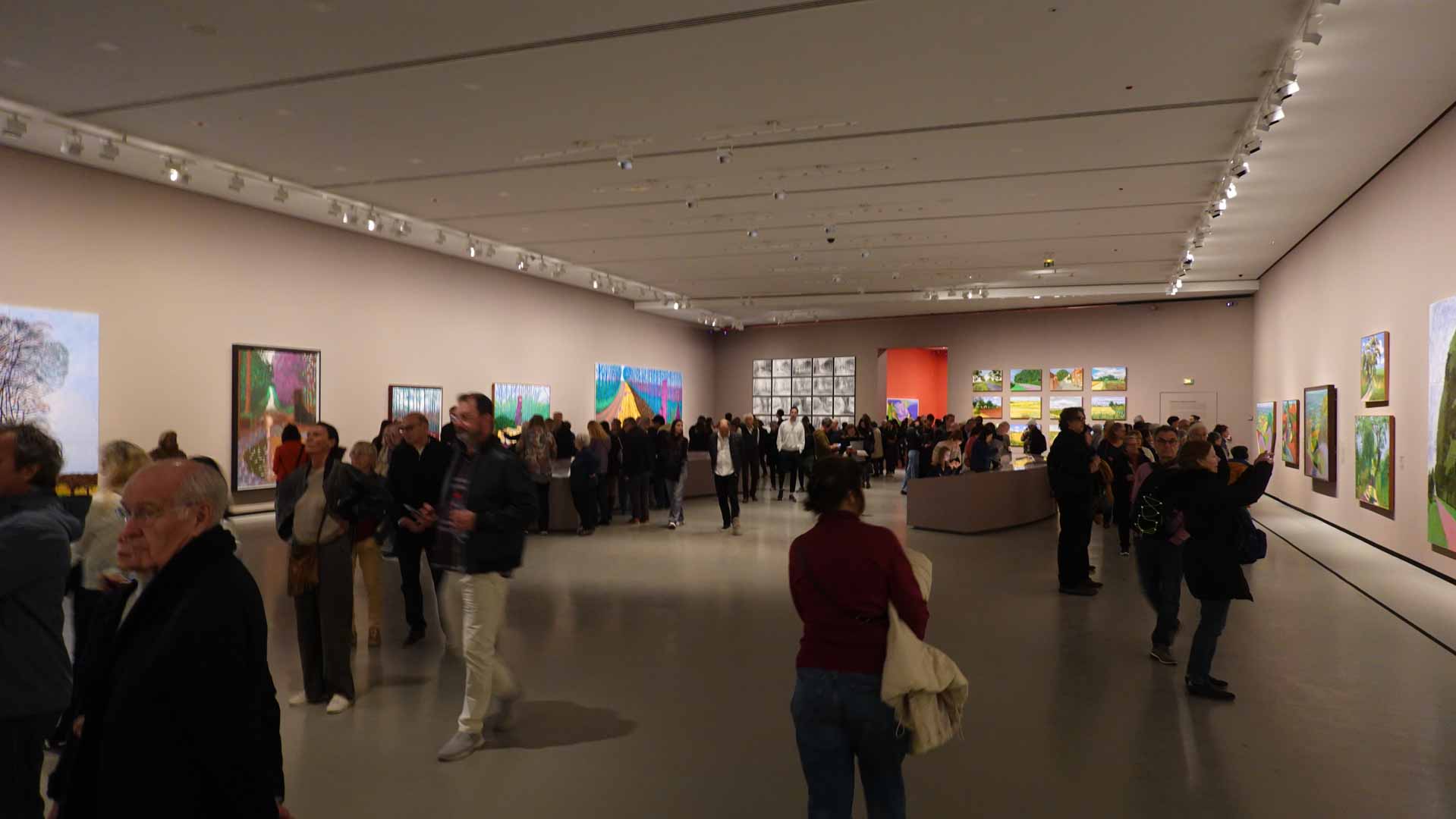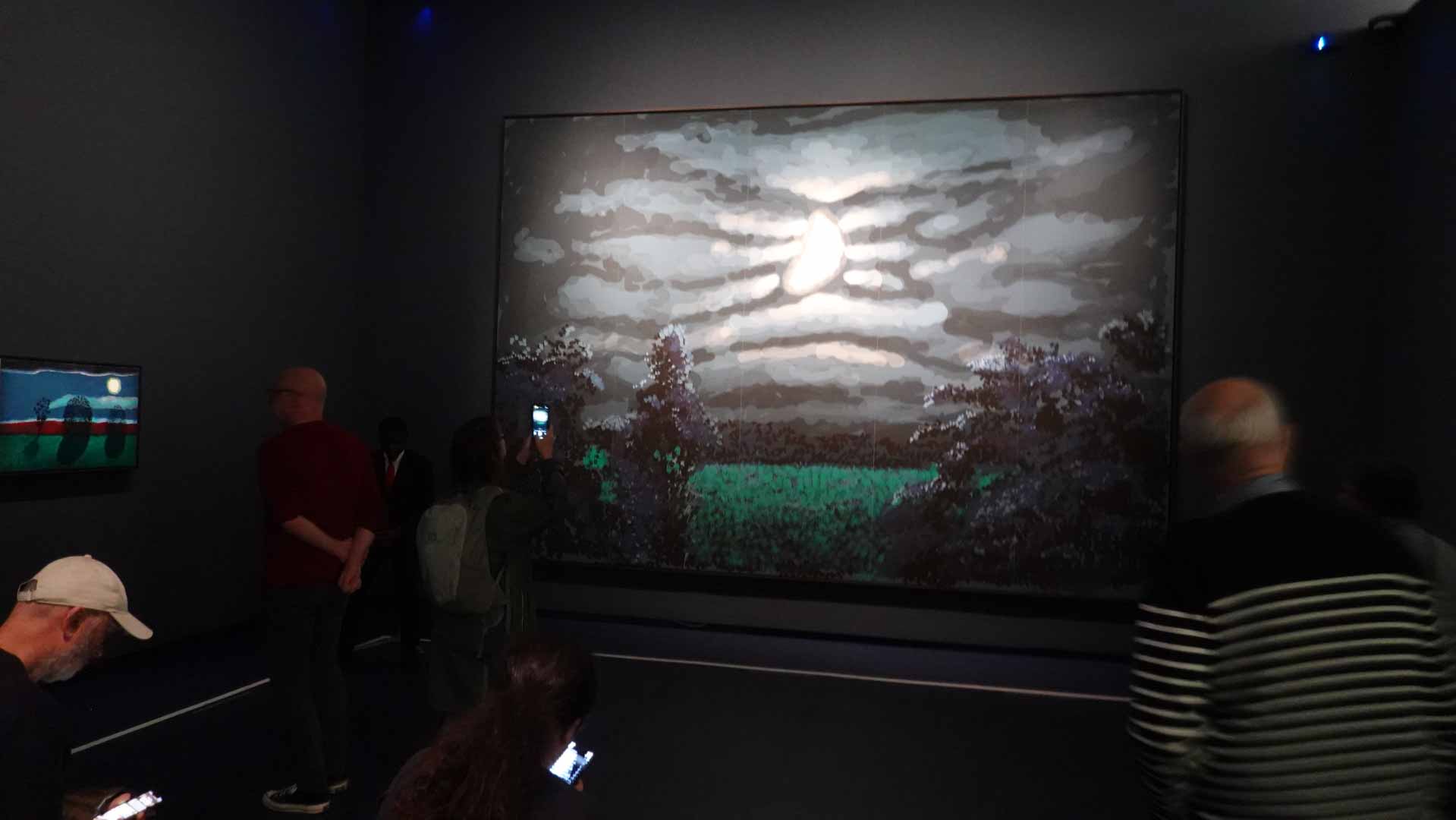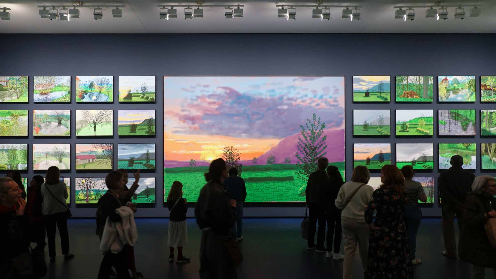La rétrospective accorde une attention particulière aux œuvres des 25 dernières années, période marquée par une exploration intense du paysage et de la technologie. Parmi les pièces majeures, on retrouve Bigger Trees Near Warter (2007), une composition monumentale de 50 toiles représentant la campagne du Yorkshire, et A Year in Normandie (2020), une frise numérique de 90 mètres inspirée de la tapisserie de Bayeux. Durant le confinement, Hockney a également réalisé plus de 200 dessins sur iPad, capturant la floraison printanière de son jardin normand.