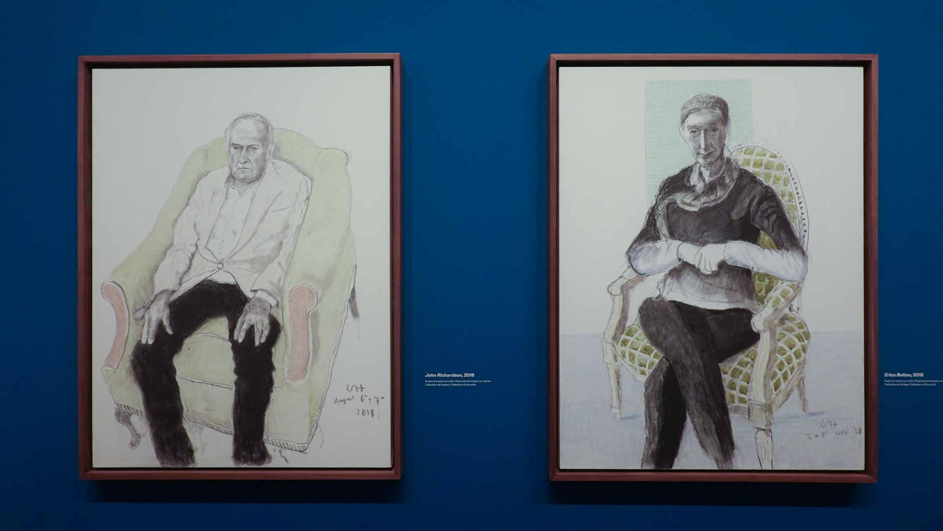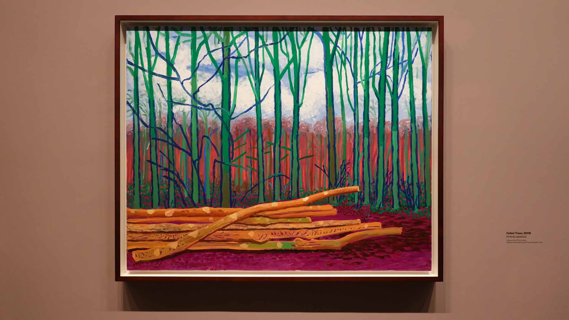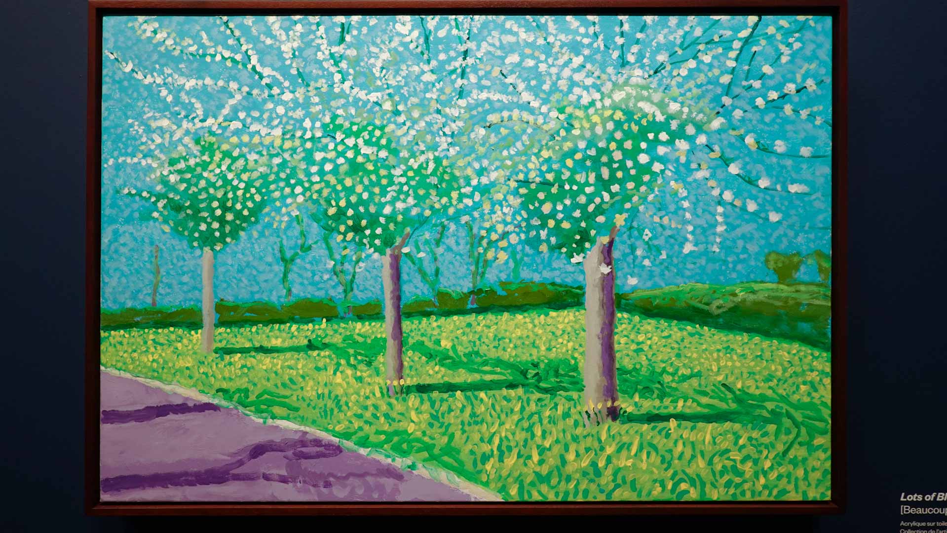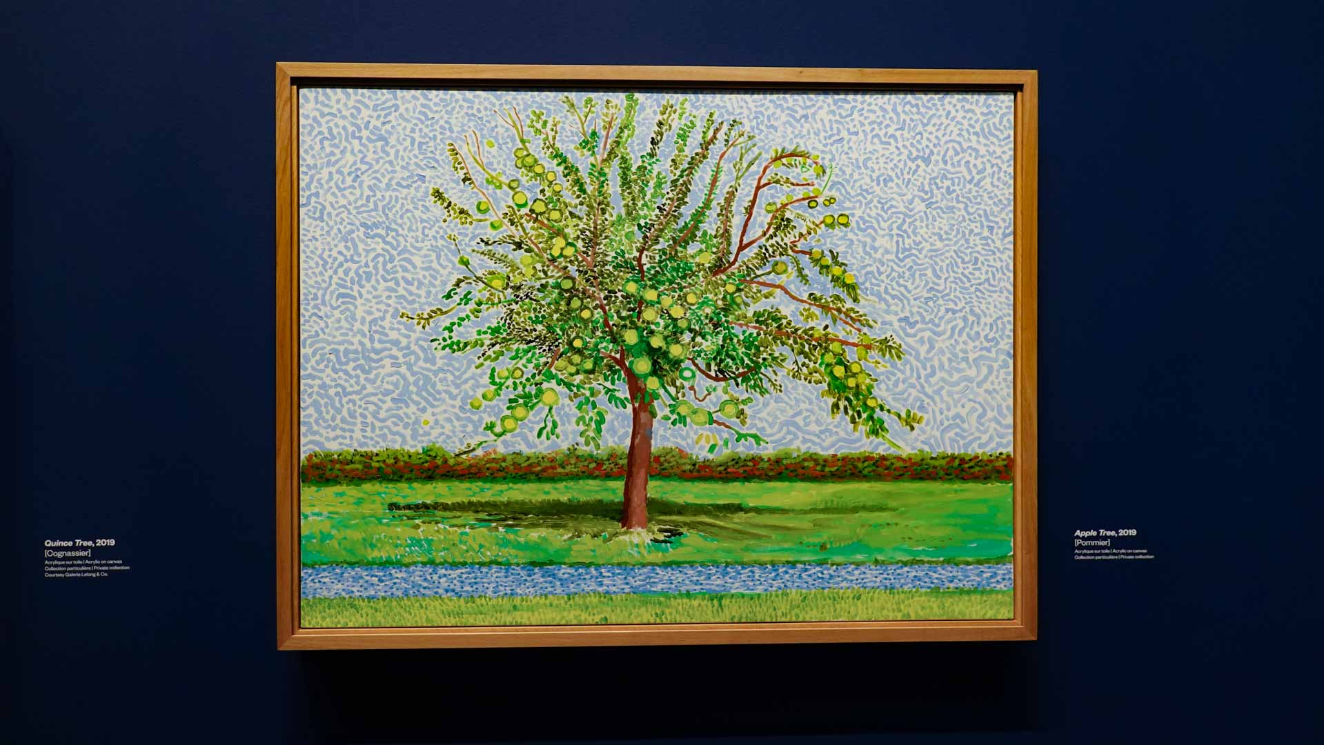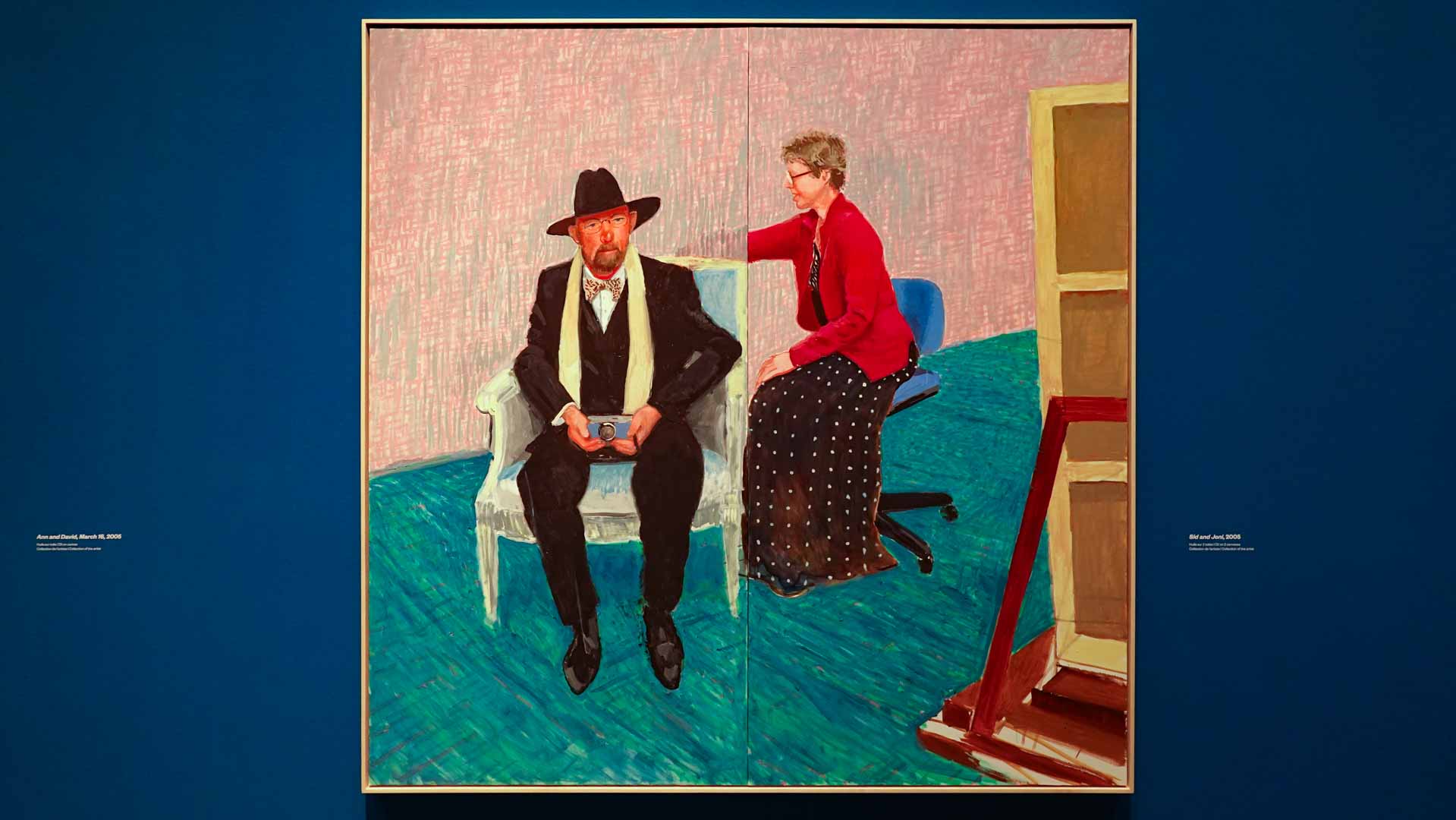 La rétrospective accorde une attention particulière aux œuvres des 25 dernières années, période marquée par une exploration intense du paysage et de la technologie. Parmi les pièces majeures, on retrouve Bigger Trees Near Warter (2007), une composition monumentale de 50 toiles représentant la campagne du Yorkshire, et A Year in Normandie (2020), une frise numérique de 90 mètres inspirée de la tapisserie de Bayeux. Durant le confinement, Hockney a également réalisé plus de 200 dessins sur iPad, capturant la floraison printanière de son jardin normand.