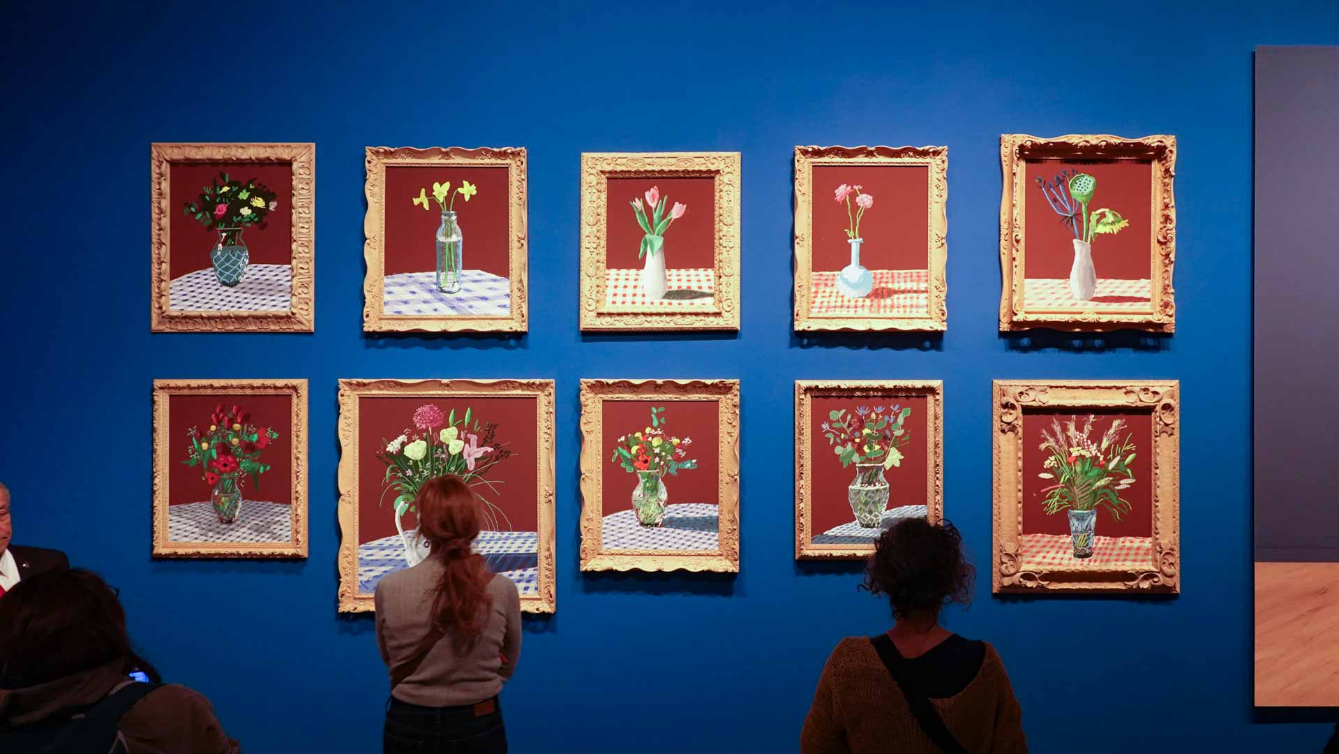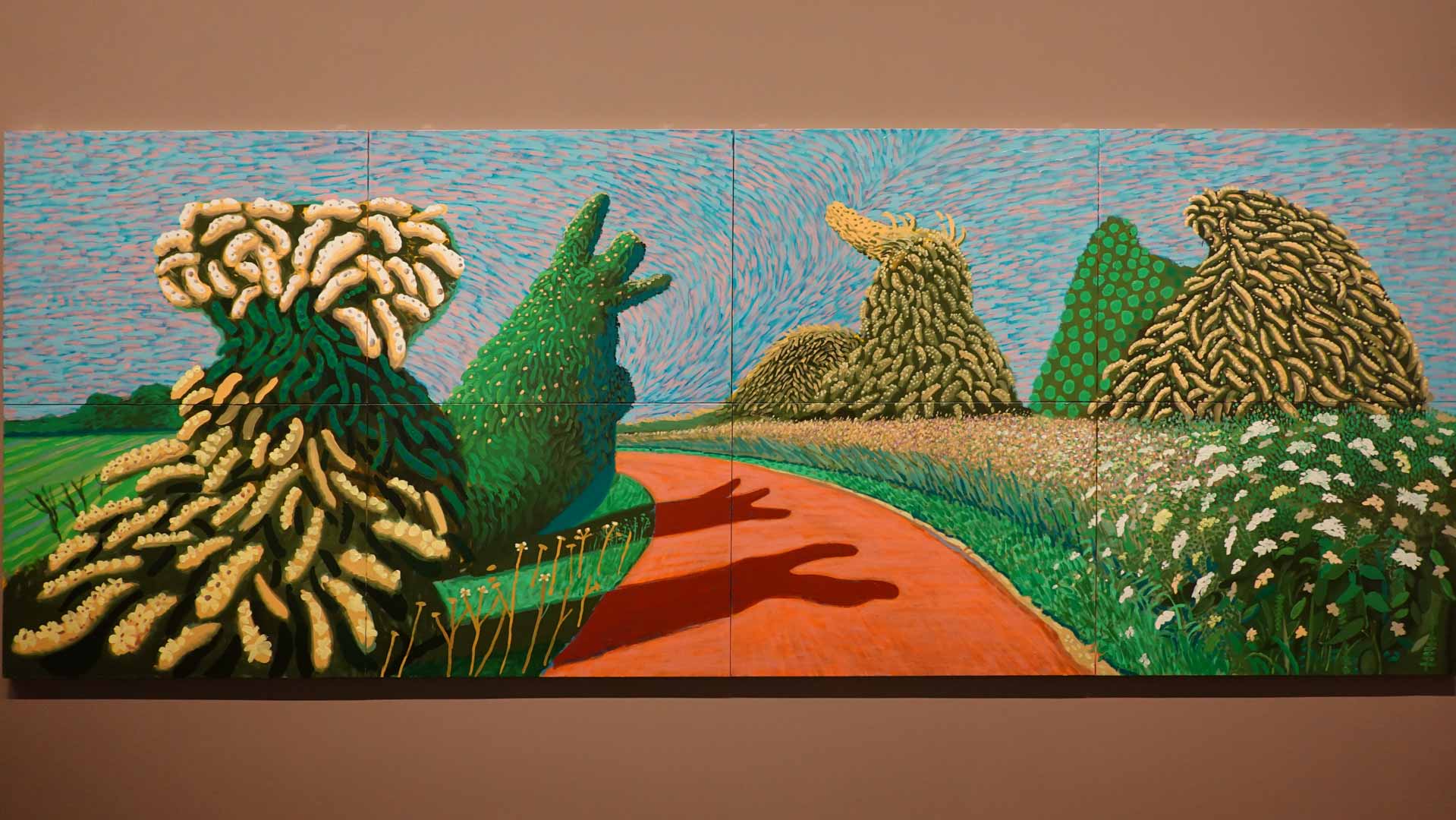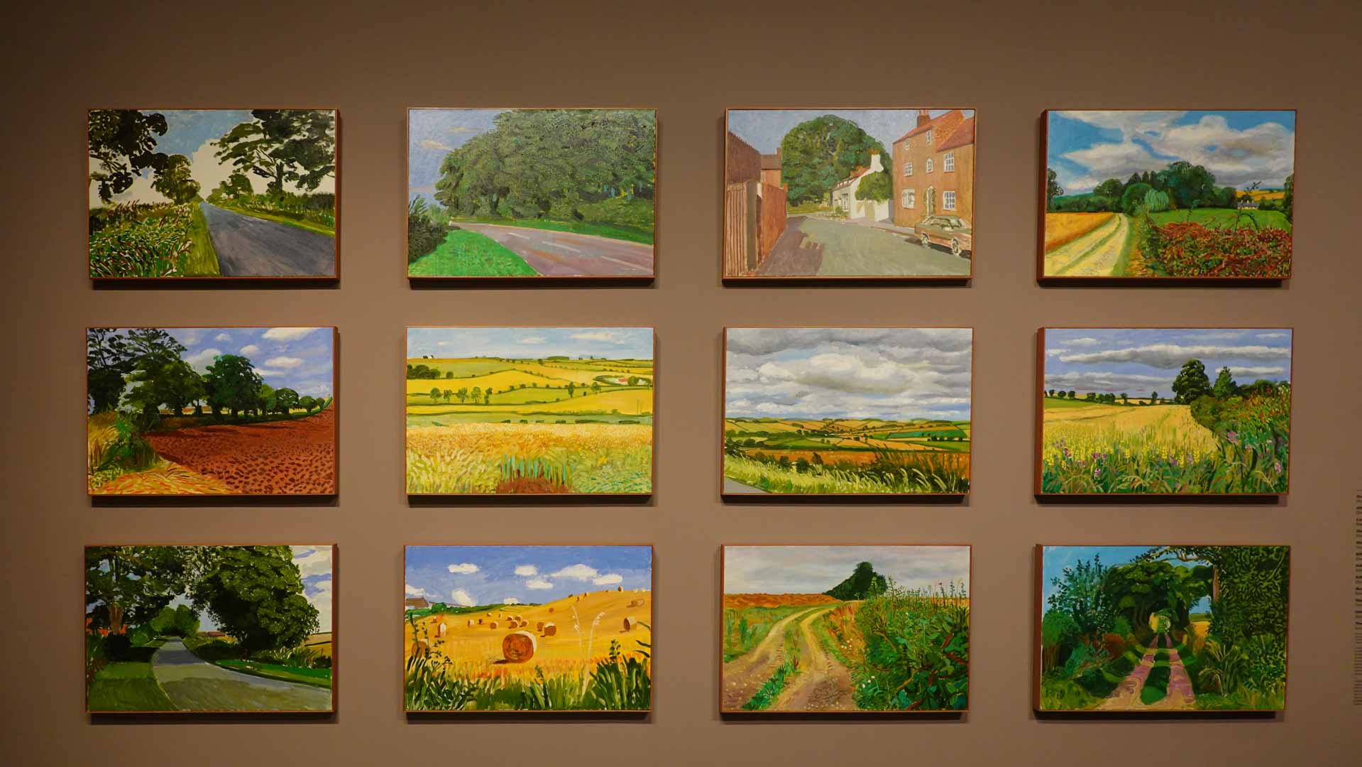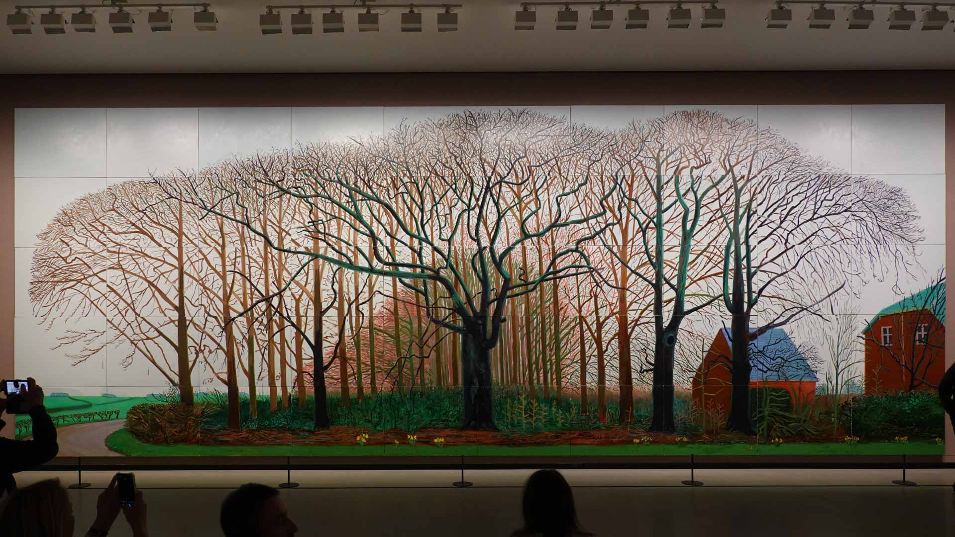 La rétrospective accorde une attention particulière aux œuvres des 25 dernières années, période marquée par une exploration intense du paysage et de la technologie. Parmi les pièces majeures, on retrouve Bigger Trees Near Warter (2007), une composition monumentale de 50 toiles représentant la campagne du Yorkshire, et A Year in Normandie (2020), une frise numérique de 90 mètres inspirée de la tapisserie de Bayeux. Durant le confinement, Hockney a également réalisé plus de 200 dessins sur iPad, capturant la floraison printanière de son jardin normand.