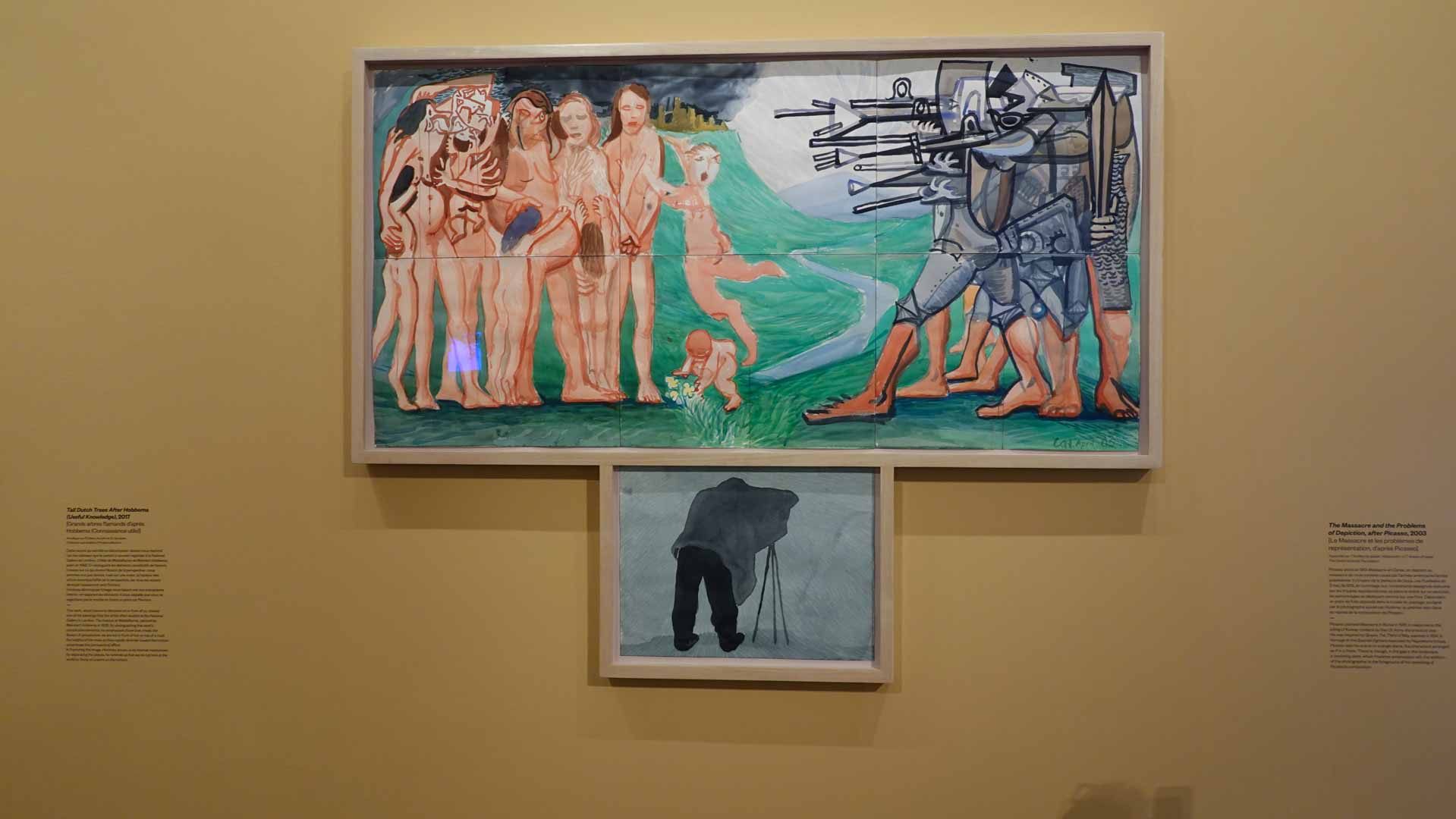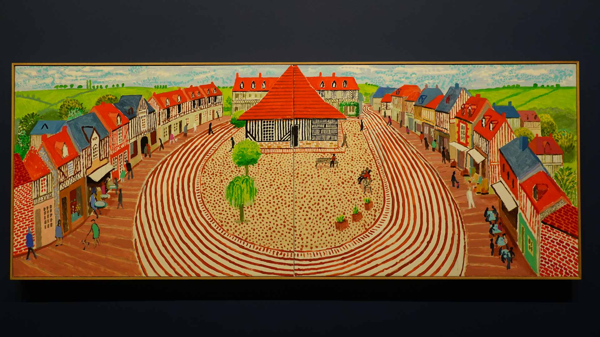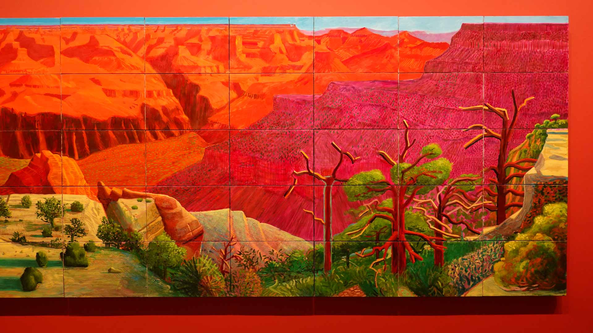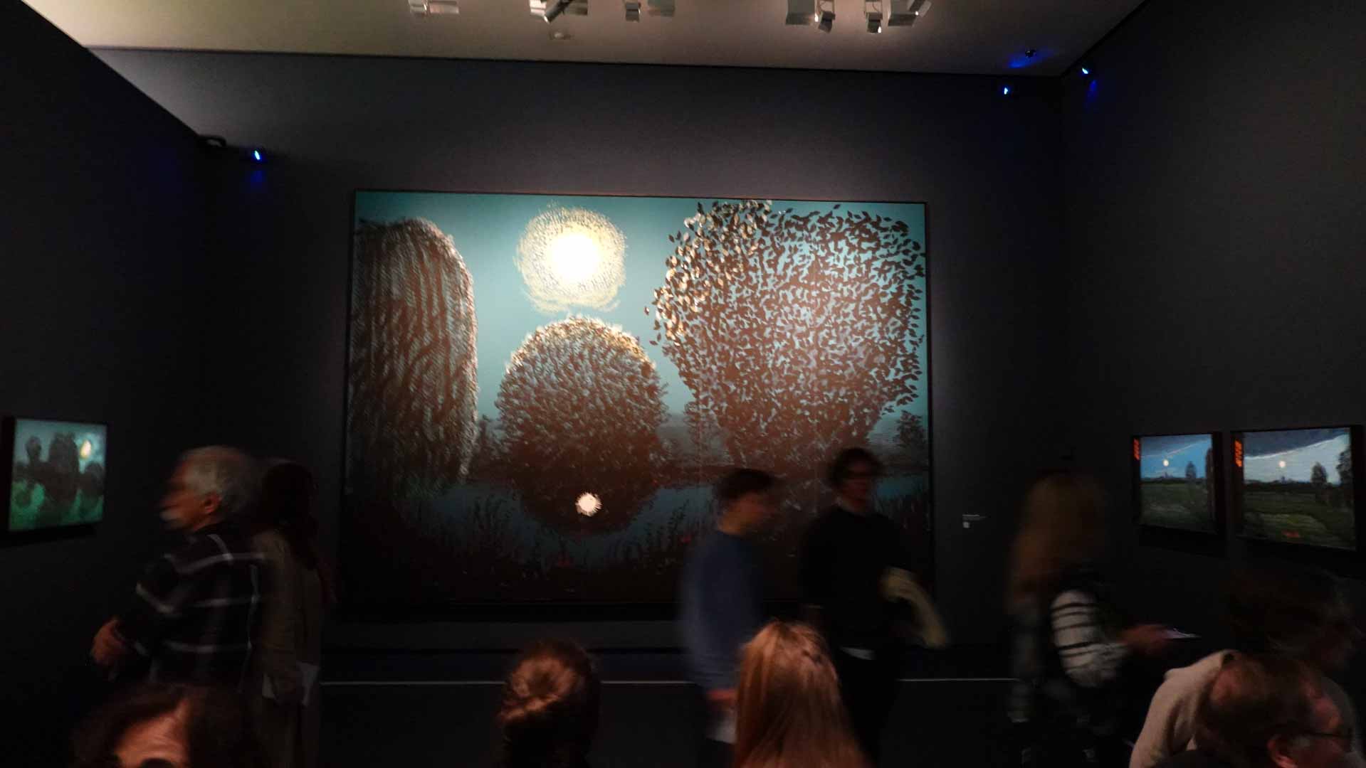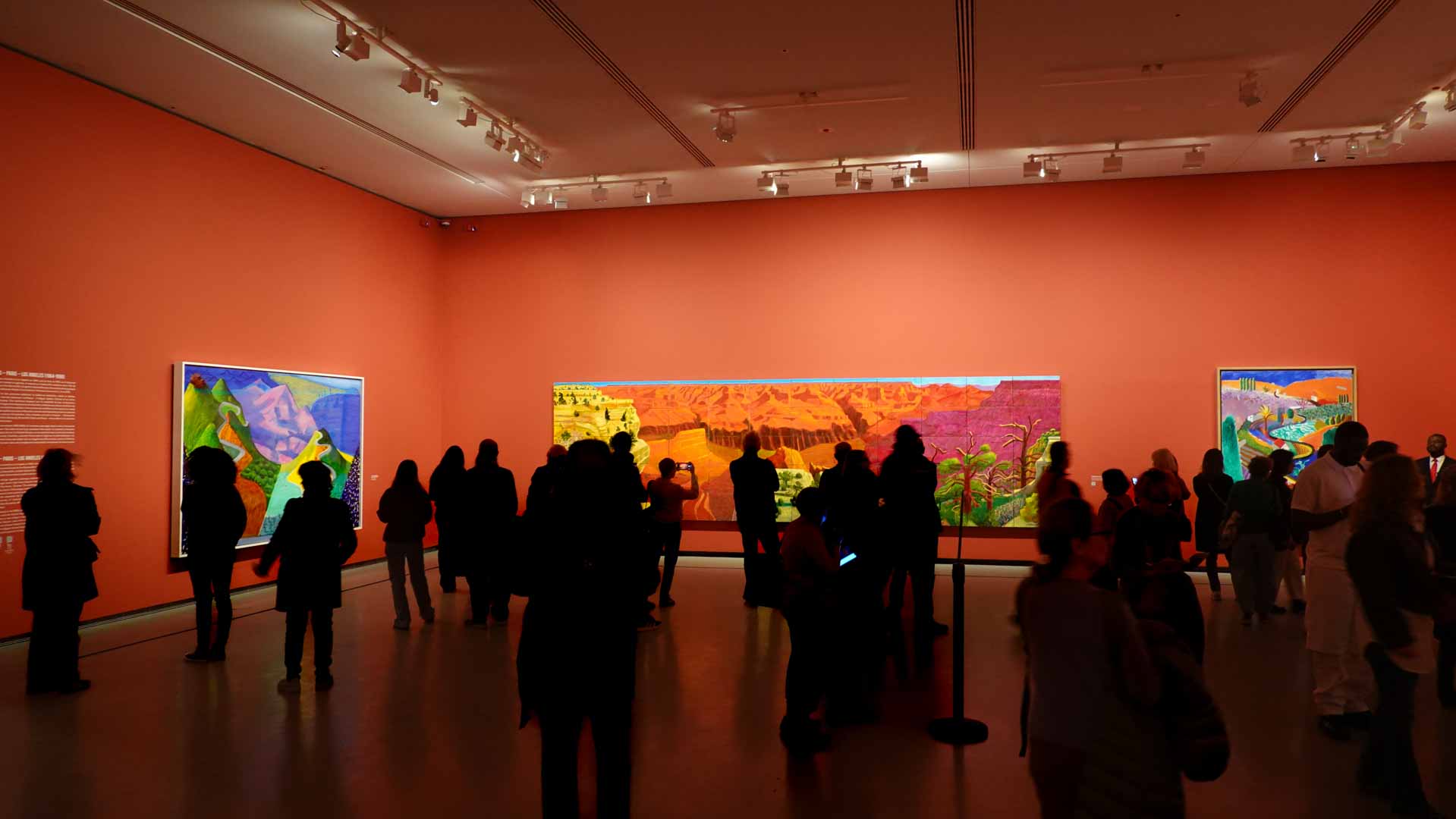 La rétrospective accorde une attention particulière aux œuvres des 25 dernières années, période marquée par une exploration intense du paysage et de la technologie. Parmi les pièces majeures, on retrouve Bigger Trees Near Warter (2007), une composition monumentale de 50 toiles représentant la campagne du Yorkshire, et A Year in Normandie (2020), une frise numérique de 90 mètres inspirée de la tapisserie de Bayeux. Durant le confinement, Hockney a également réalisé plus de 200 dessins sur iPad, capturant la floraison printanière de son jardin normand.