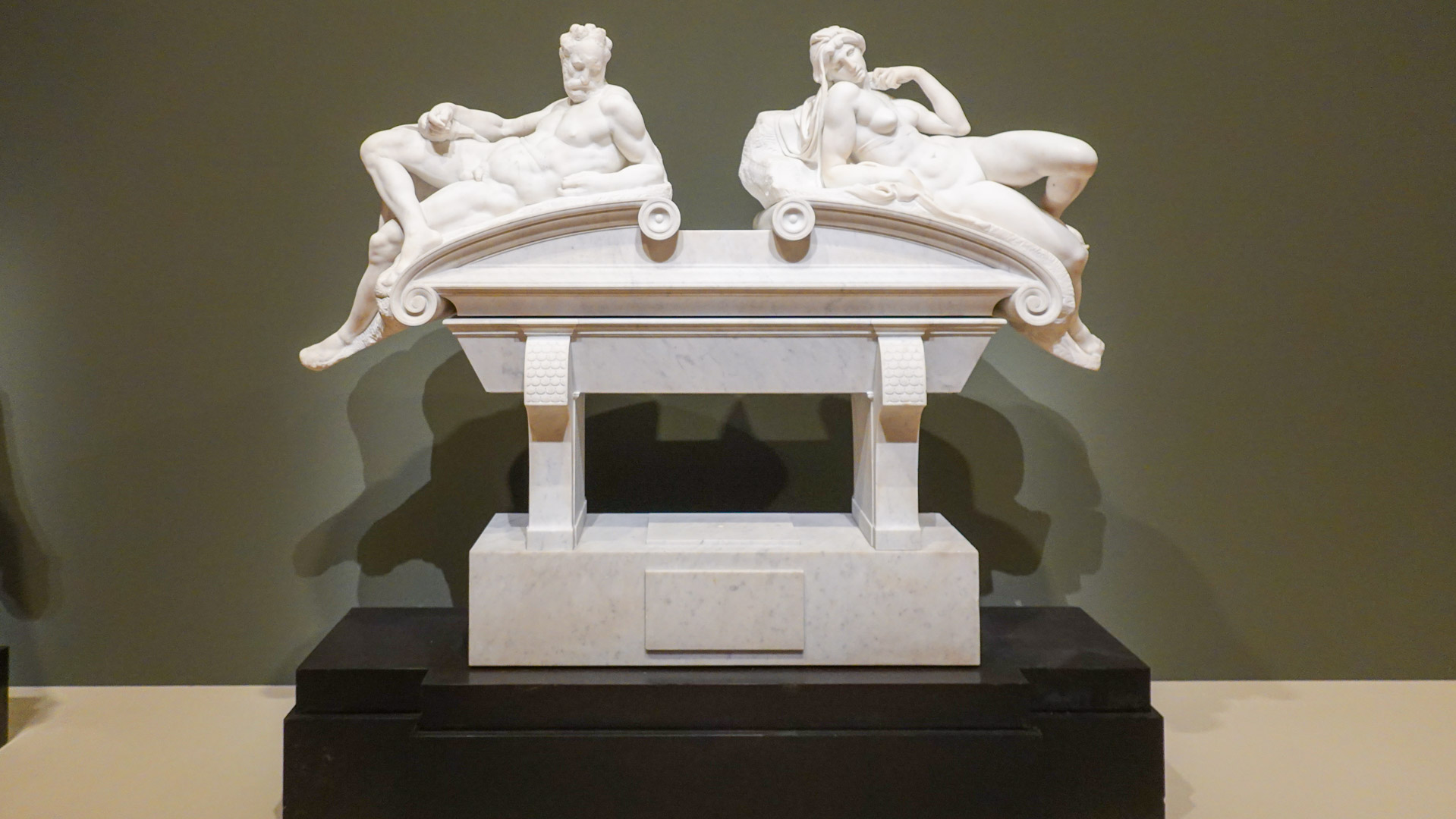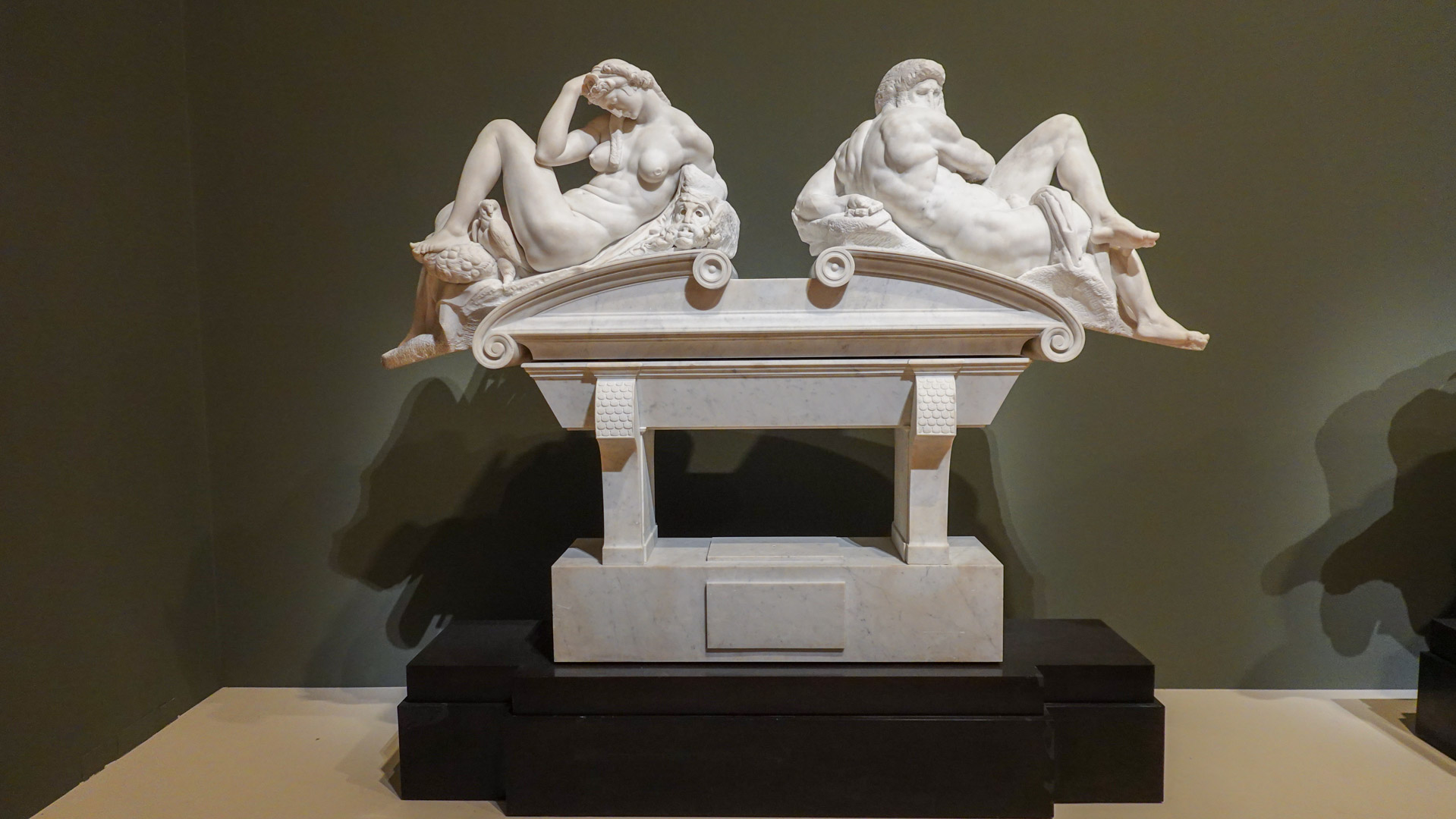 La première section propose une présentation des deux sculpteurs sous l'angle du mythe. Portraits et mises en scène posthumes, hommages artistiques et même reliques permettent d'incarner la stature artistique des deux hommes. La construction de leur généalogie respective est montrée à travers une sélection d'œuvres réalisées d'après les maîtres et, en ce qui concerne Rodin, précisément d'après Michel-Ange. L'importance des modèles michelangélesques pour le sculpteur français est également mise en perspective avec son voyage fondateur à Florence, effectué en 1876, et la découverte de la Chapelle des princes à San Lorenzo, œuvre totale de « ce magicien » qui semble lui laisser « un peu de ses secrets », comme il l'écrit alors à sa compagne Rose Beuret. Les moulages d'époque réalisés par Vincenzo Danti d'après les allégories des heures du jour des tombeaux de Julien et Laurent de Médicis permettent de convoquer dans l'exposition ces figures emblématiques du maître florentin.