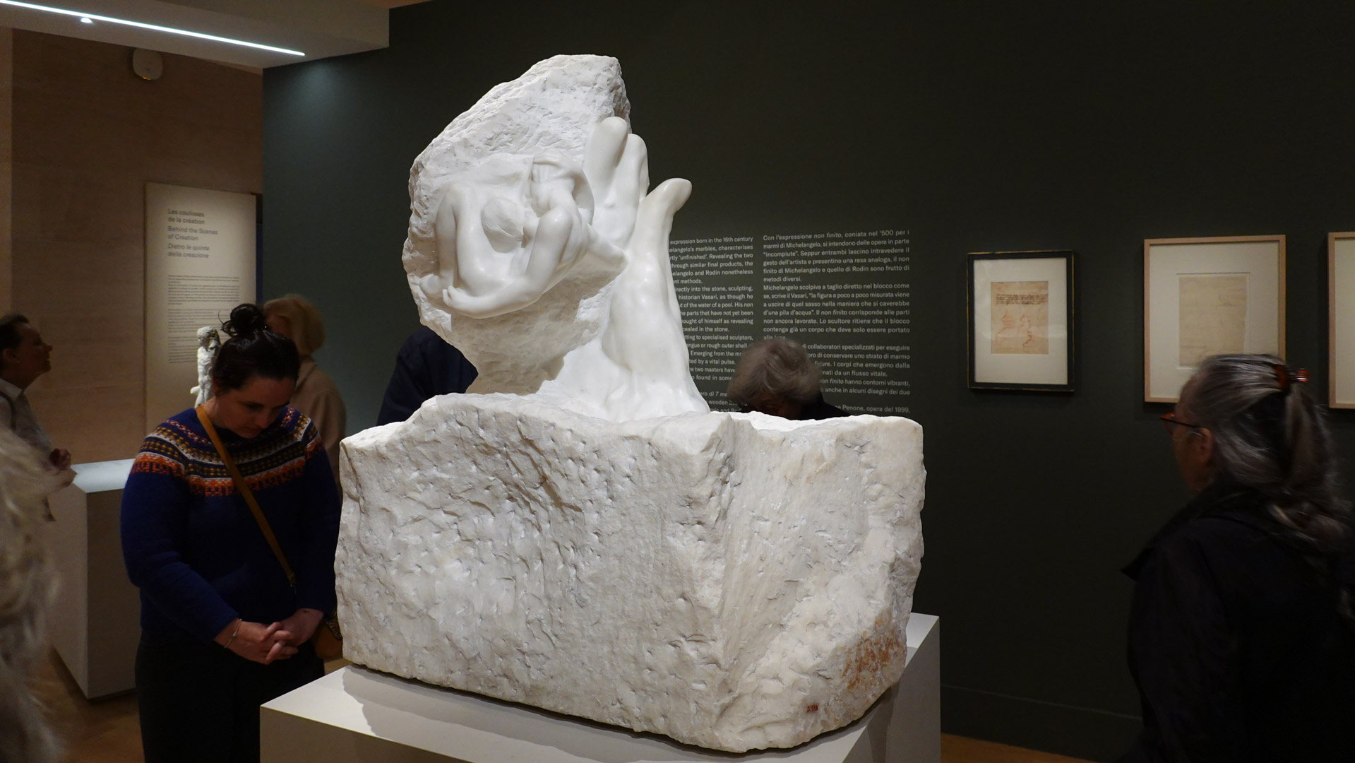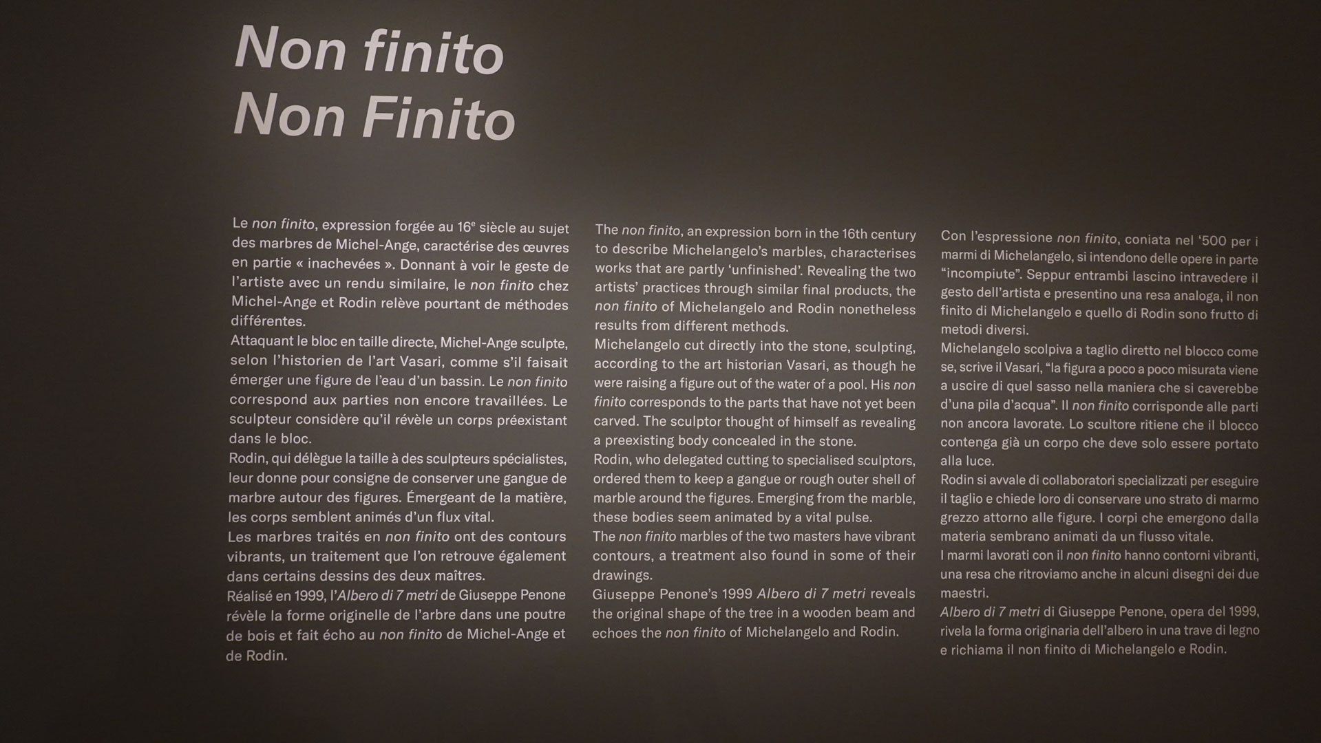 Au cœur de l'exposition prend place le non finito, esthétique emblématique des œuvres de Michel-Ange et réappropriée par Rodin : laisser perceptible les marques de l'acte créatif, démontrer que la sculpture visible n'est qu'une étape d'une forme virtuelle déjà existante, faire voir par le recours au transitoire le flux de la vie traversant les corps. Un petit Christ en croix en bois, prêt exceptionnel de la Casa Buonarroti montre, non loin des Esclaves du Louvre, toute la force du non finito michelangélesque.