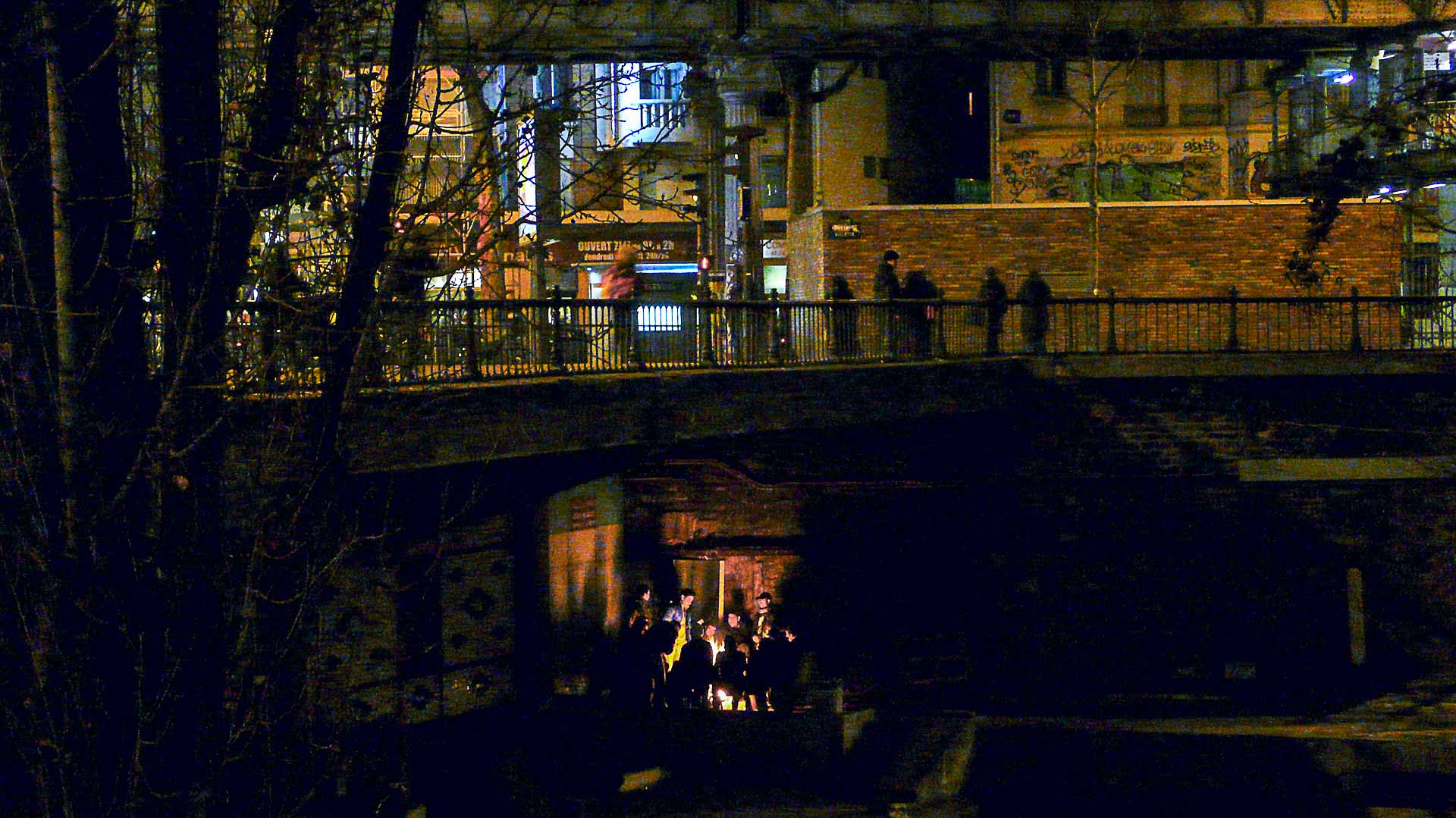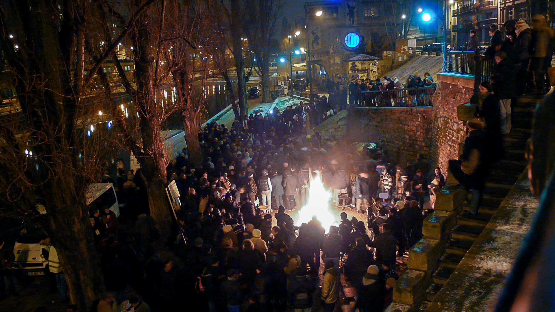 Début janvier 2010, le froid est cruel et le canal prit par la glace. La nuit, les réfugiés se regroupent sur les quais et brulent des débris glanés dans les rues. Au centre de Paris, les feux de bivouac rapprochent des réfugiés épuisés, une pause dans un voyage vers l'horizon. Des associations les ravitaillent et les accompagnent dans la nuit.