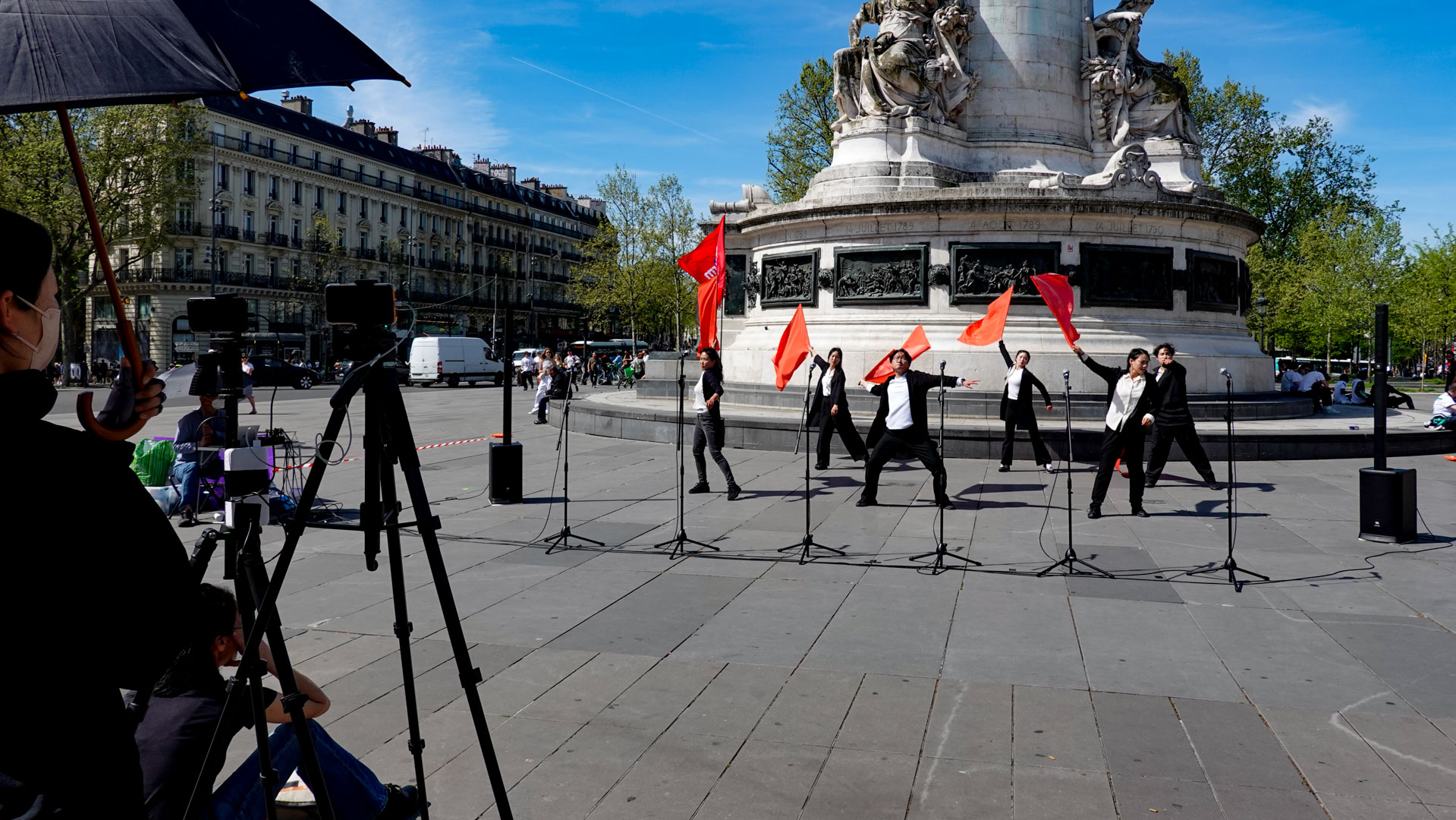Comme nous l'avions un peu oublié, les camarades de Corée du Nord nous le rappellent en organisant des chants et des danses patriotiques entrecoupés de discours didactiques sur les méfaits de l'impérialisme, place de la République.