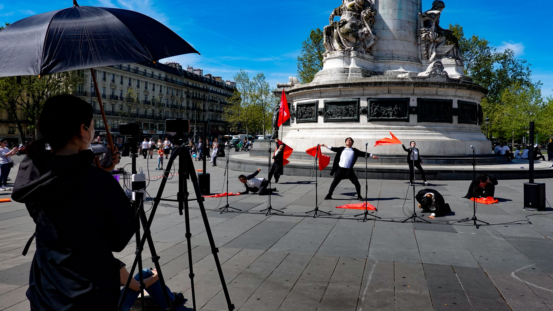 Les passants trop curieux sont éloignés des militants qui s’agitent et meurent héroïquement sous la statue de la République.