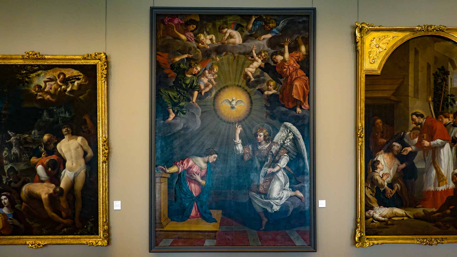 L’école italienne est représentée par des artistes de la Renaissance et du Baroque, tels que Pietro Perugino, dont la douceur des figures incarne l’humanisme du Quattrocento, ou Le Tintoret, maître de la lumière vénitienne. Plus dramatique, un tableau de Caravage, emblématique du clair-obscur, témoigne de la puissance expressive du naturalisme caravagesque.