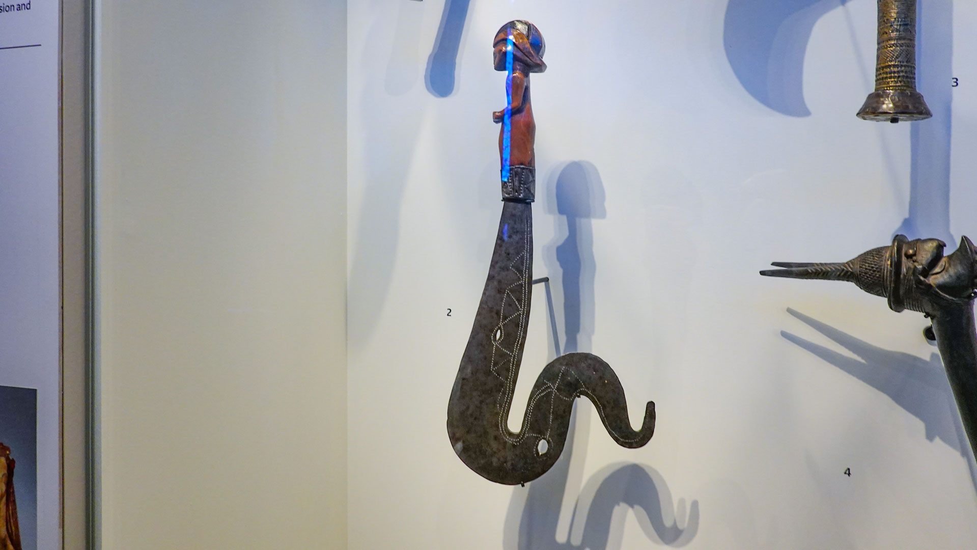 Au-delà des emblématiques masques liés au rite initiatique du Mukanda (destiné aux jeunes garçons), "La part de l’ombre" entend éclairer une production plus discrète : la statuaire en bois et en donner plusieurs clés d’analyse. Ce sont donc plus de 150 œuvres créées par les Yaka, Pende, Tshokwe et Suku, ainsi que par des groupes minoritaires comme les Yanzi, Buma, Lyembe, Sakata et Mbala, qui sont présentées, de leurs caractéristiques typologiques, iconographiques et stylistiques aux détails de leurs usages."