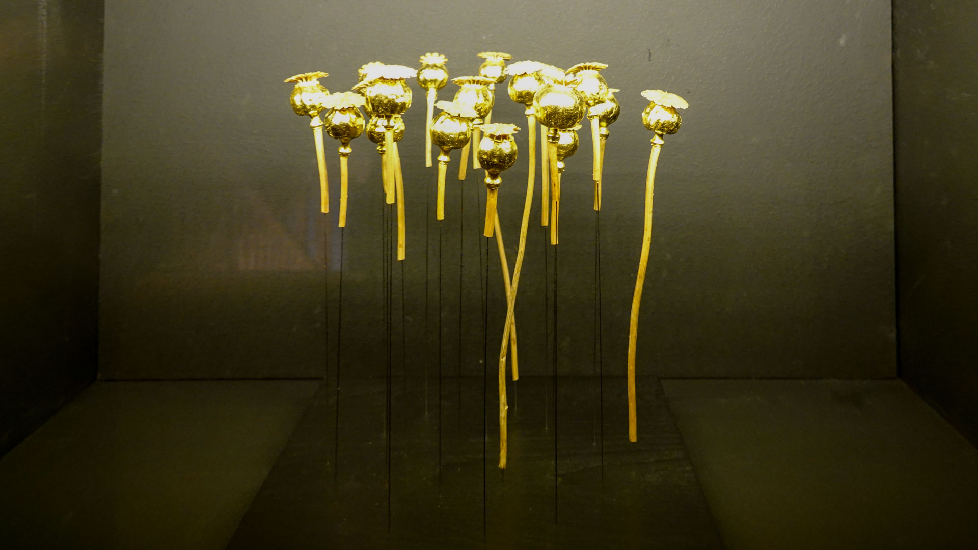 "Brindilles de bouleau avec bouts dorés à la feuille d’or, fleurs de muscaris bleues et or, fruits d’arbre du clergé bleus et lichen naturel", "Herbes folles dorées à la feuille d’or, feuilles de chêne dorées à l’or moongold et brindilles de bouleau carbonisées", "Coquelicots dorés à la feuille d’or et chapeaux noirs".