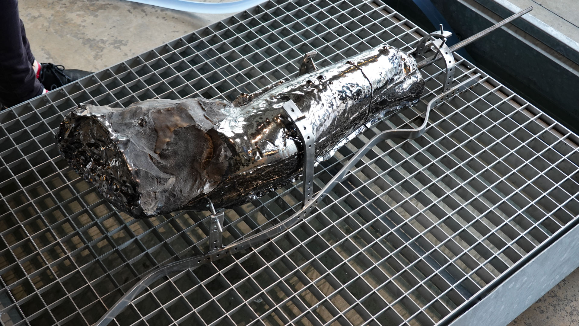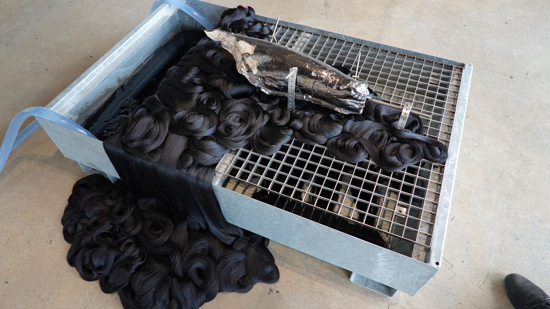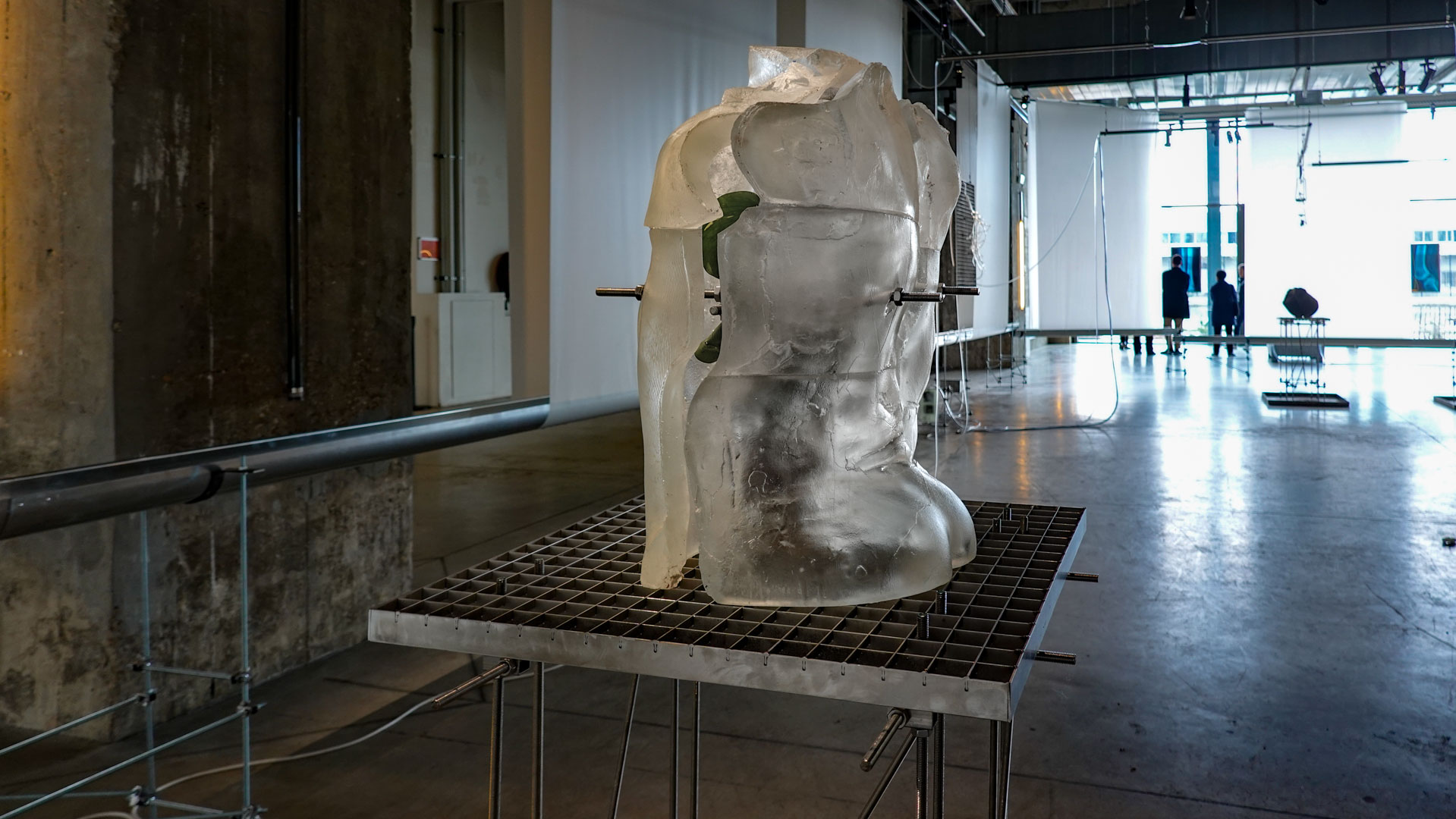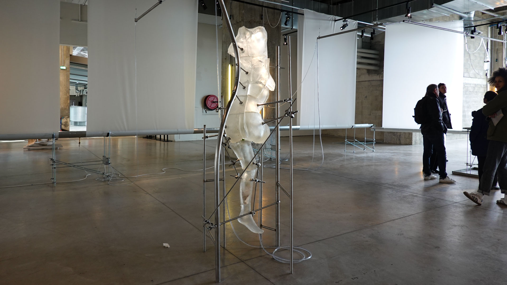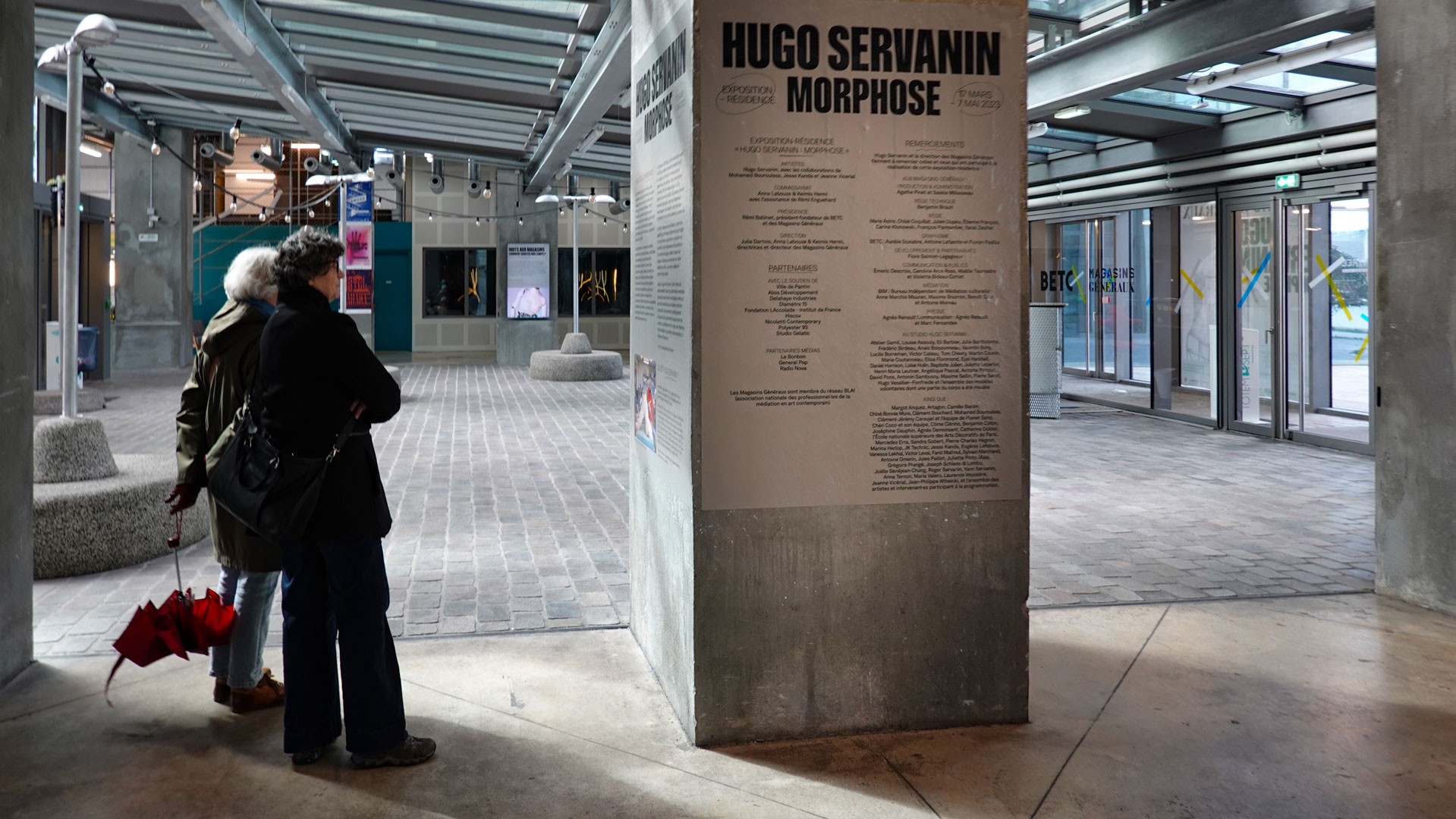 Ces êtres nouveaux, ces « Géants » comme les appelle Hugo Servanin, reflètent la nature fragile du corps humain. Ils nécessitent une attention et une maintenance de tous les jours. L’artiste et son équipe y veillent, faisant des Magasins Généraux une extension de l’atelier, une serre nucléaire où germent des mondes. Jusqu’à ce que la fin arrive. C’est le temps de l’embaumement, des corps céramisés, enveloppés dans des linceuls de verre et déposés inertes sur des bacs de rétention, à la manière de déchets industriels. Ils transmettent symboliquement au liquide qu’ils surplombent de quoi nourrir les vivants. La Morphose est un cycle, une chaîne de transformations corporelles interconnectées, un fantasme d’harmonie."
