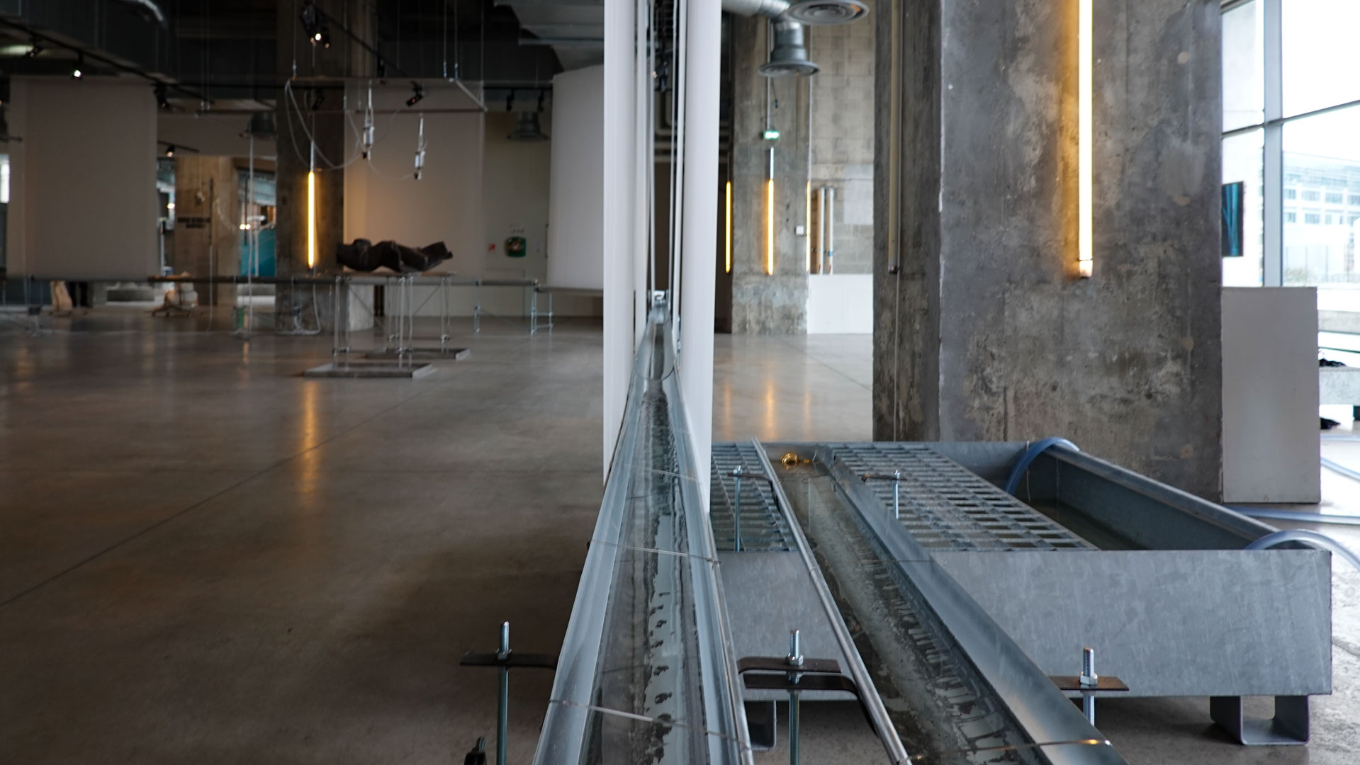 Un ruisseau dont l’eau a été puisée dans le canal de l’Ourcq traverse un environnement évolutif et changeant, terrain de croissance de ces organismes. De corps en corps, d’une gouttière principale à de fins réseaux veineux, le flux pénètre, connecte, insuffle. Des plantes prennent racine et se déploient, des micro-organismes se développent et s’adaptent, des symbioses s’organisent, et c’est tout le bâtiment qui prend vie.