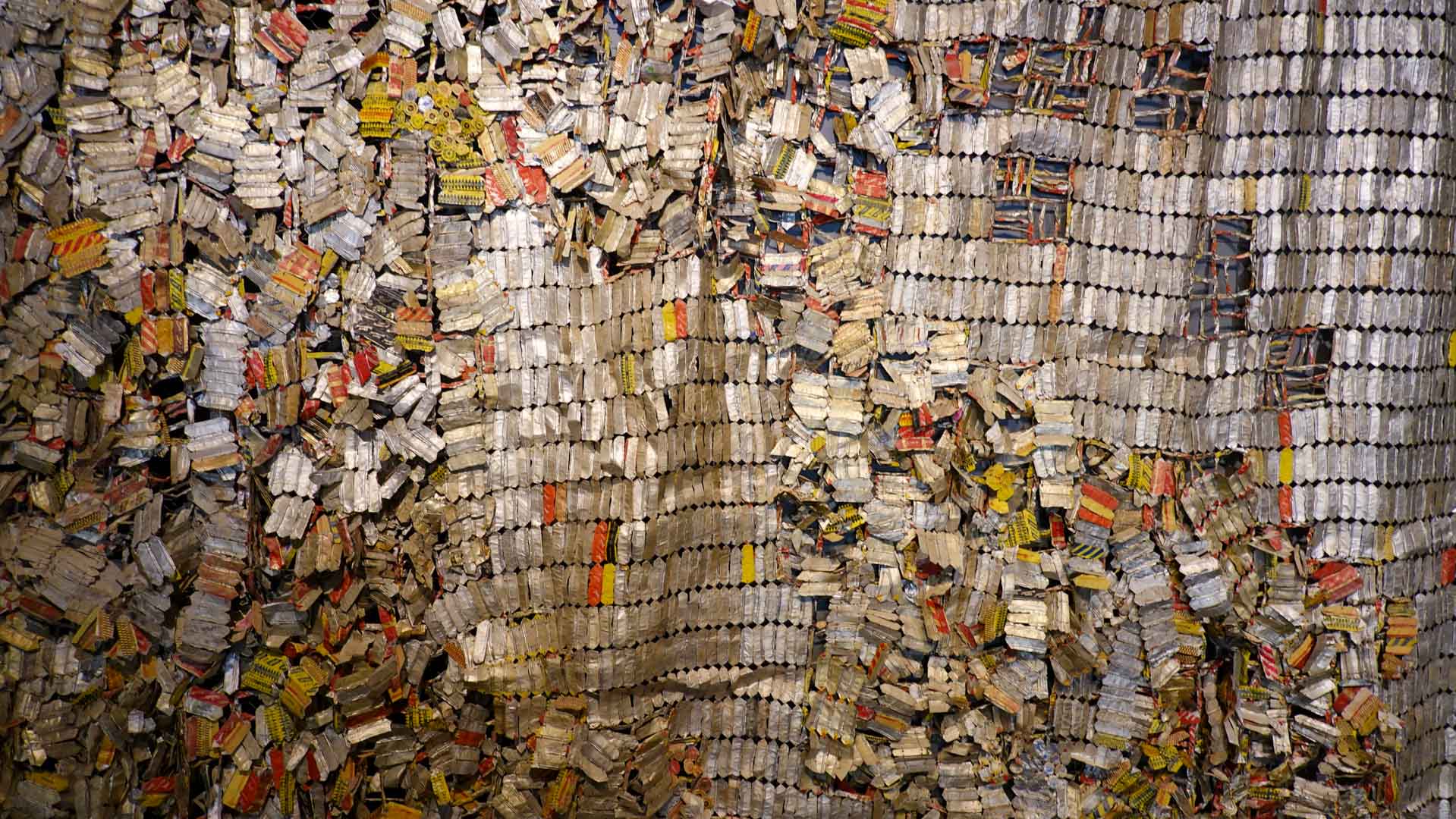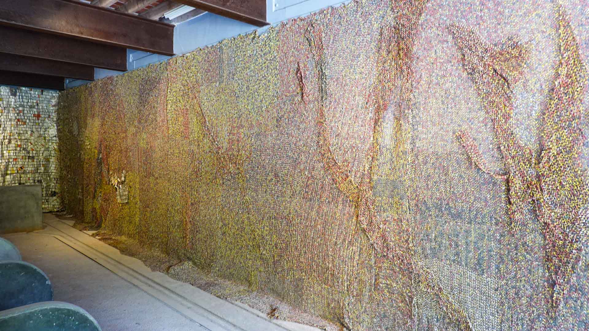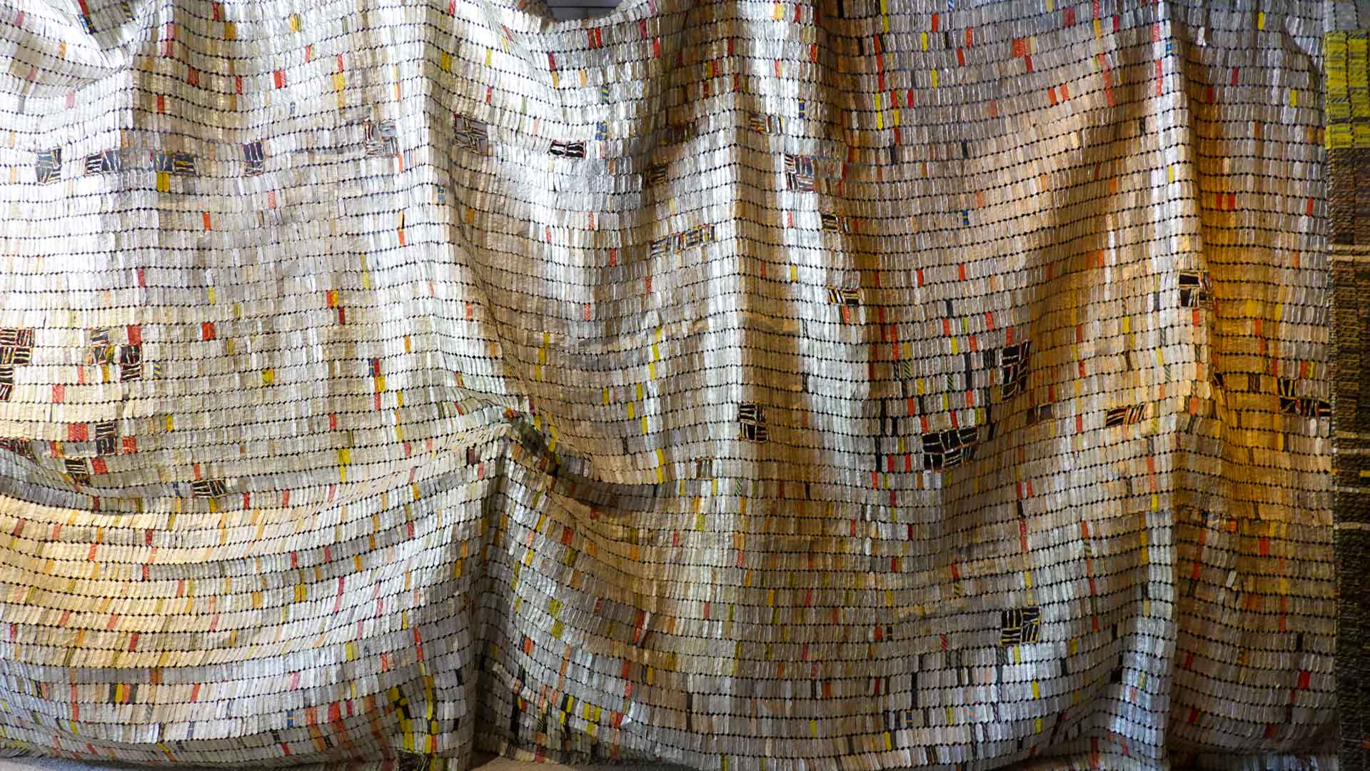 Cette installation murale monumentale constituée de milliers d’étiquettes et capsules de bouteilles en aluminium, forme un sublime paysage d’or et d’argent. Une œuvre aux couleurs vives et chatoyantes qui s’inspirent des grandes étoffes kente, pièces aux motifs symboliques portées par les chefs ghanéens."