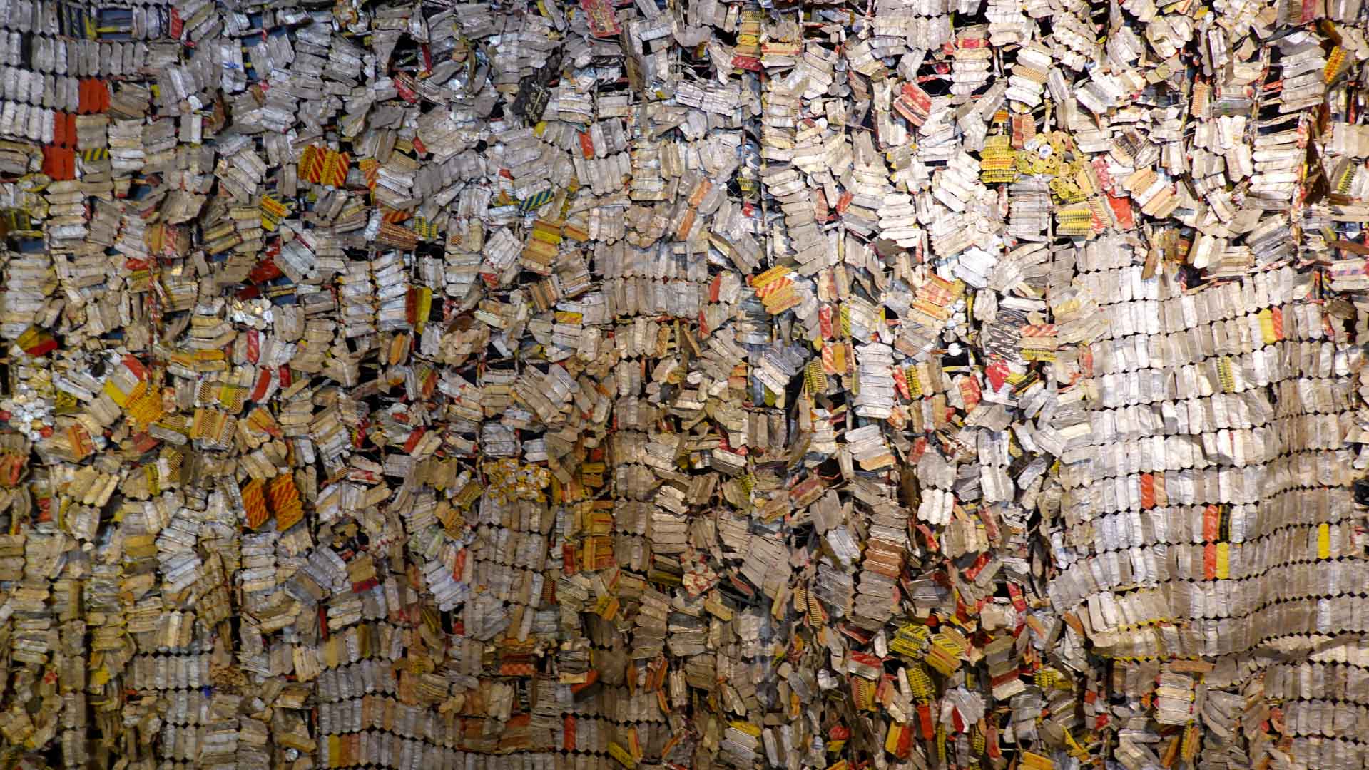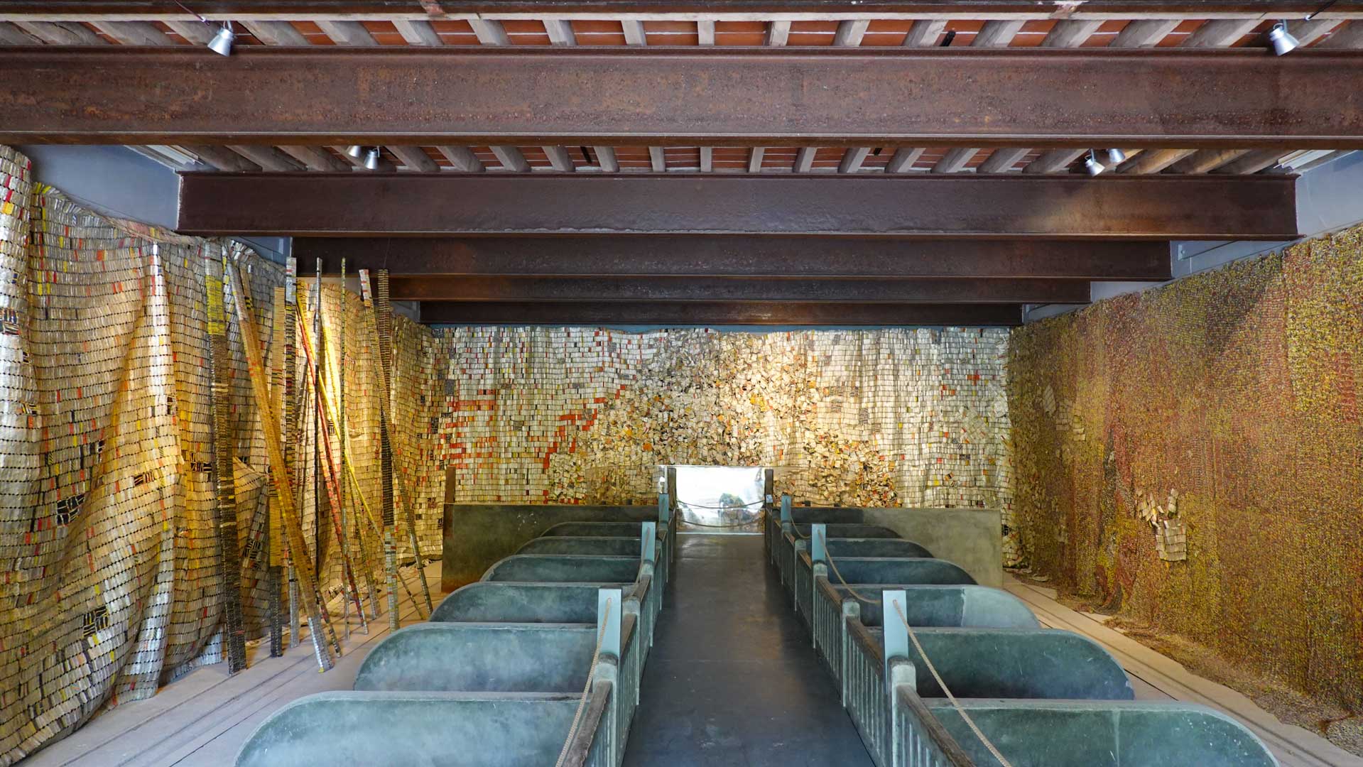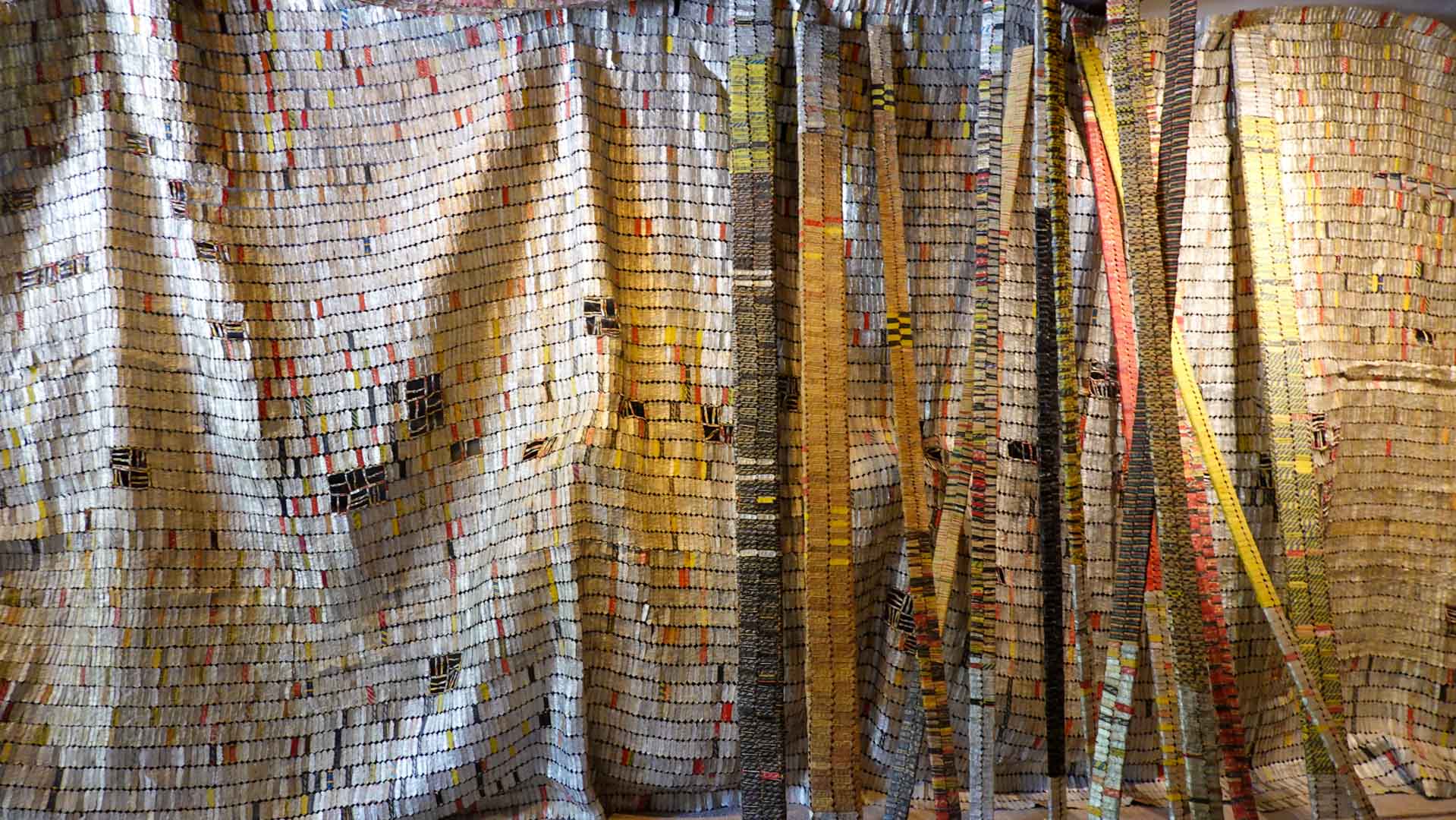 Cette installation murale monumentale constituée de milliers d’étiquettes et capsules de bouteilles en aluminium, forme un sublime paysage d’or et d’argent. Une œuvre aux couleurs vives et chatoyantes qui s’inspirent des grandes étoffes kente, pièces aux motifs symboliques portées par les chefs ghanéens."