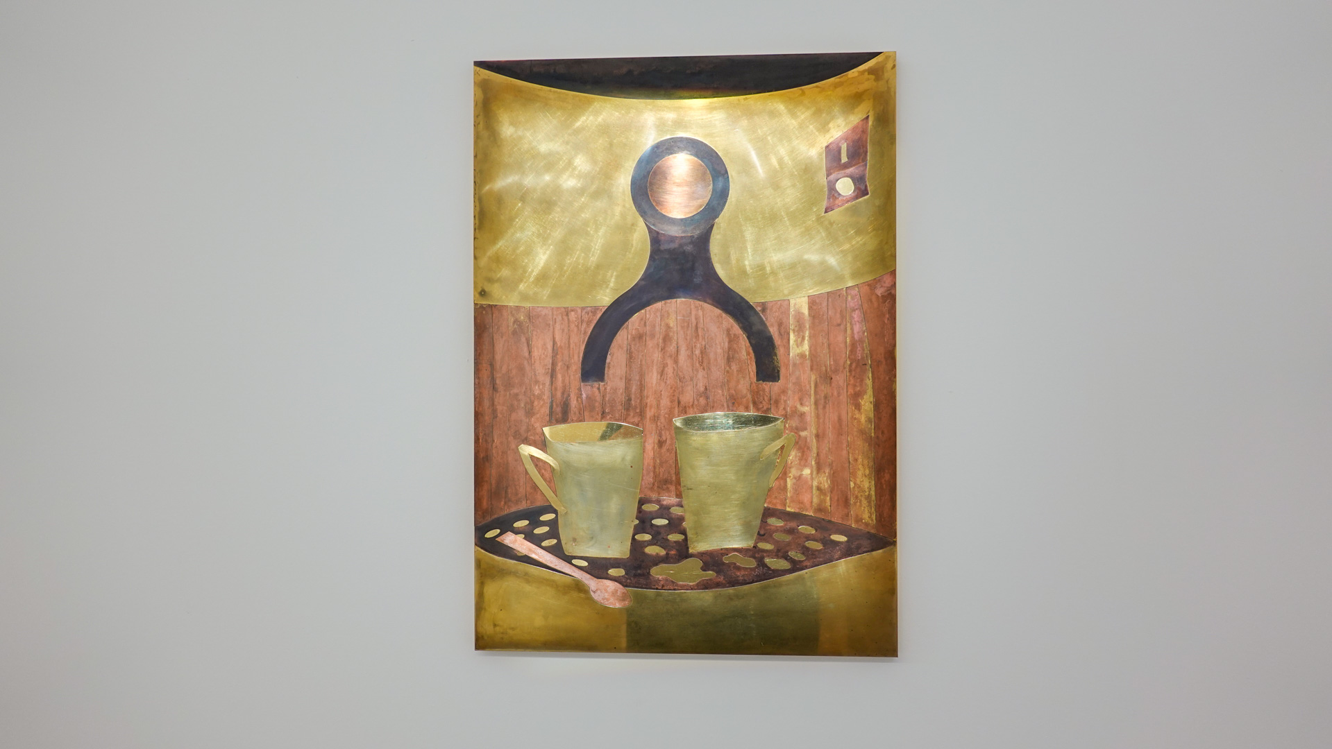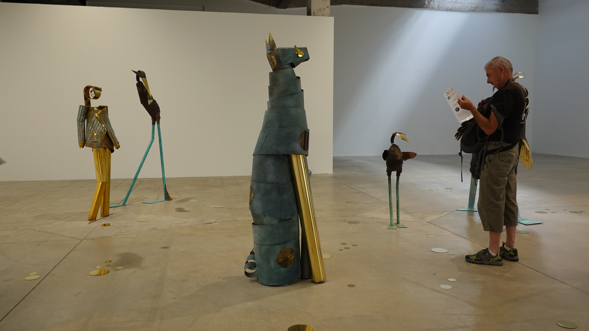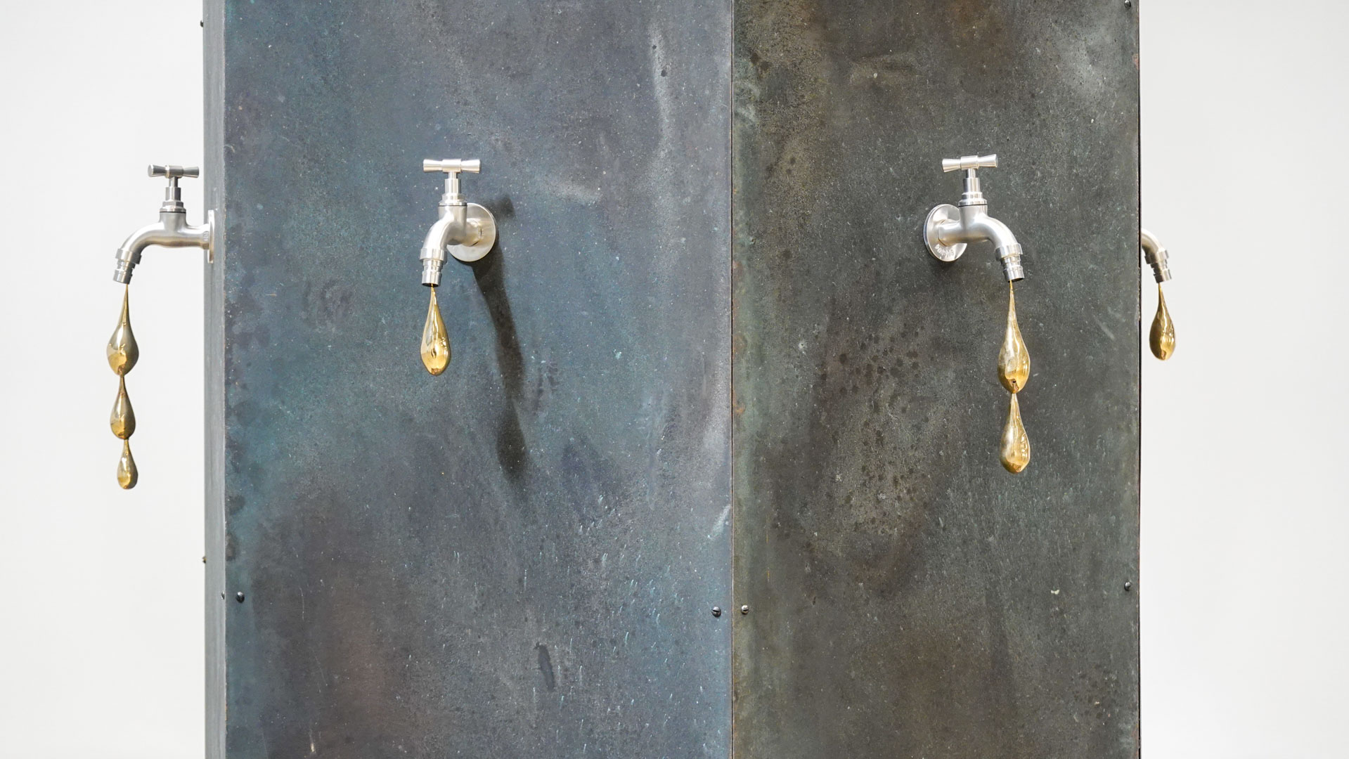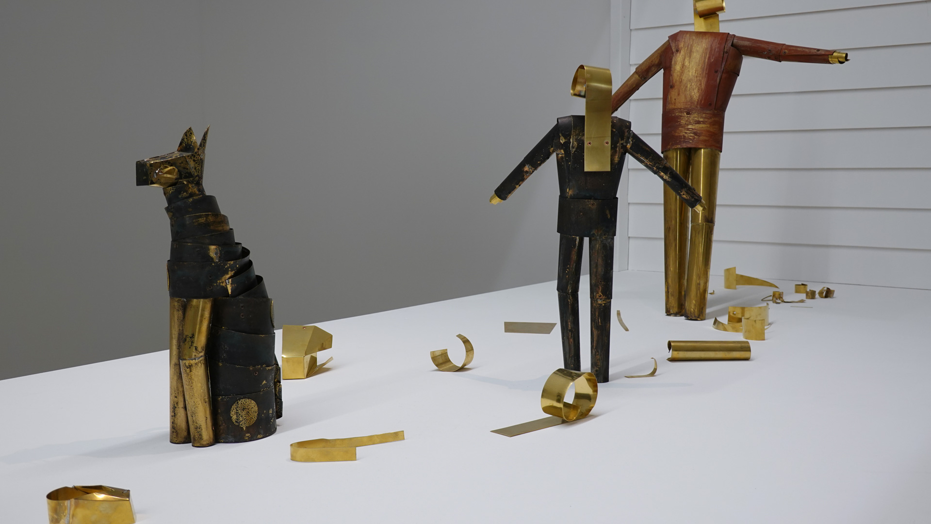 Dans une atmosphère enchantée, des animaux anthropomorphisés et des personnages métalliques vont et viennent. Des gouttes d’une matière dorée s’échappent de robinets et une architecture blanche, à priori impénétrable, se dresse comme un atelier temporairement à l’arrêt. Des tableaux de laiton donnent des indices sur l’intrigue à décoder tandis que les plus curieux découvriront des salles inaccessibles où tout un monde s’active."