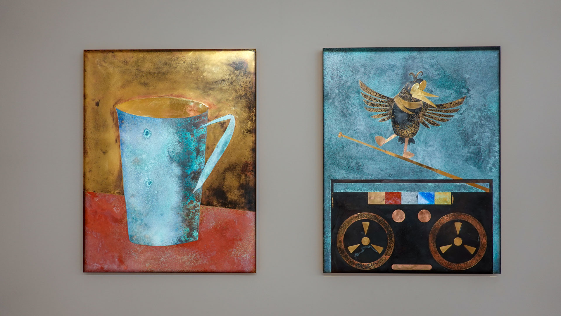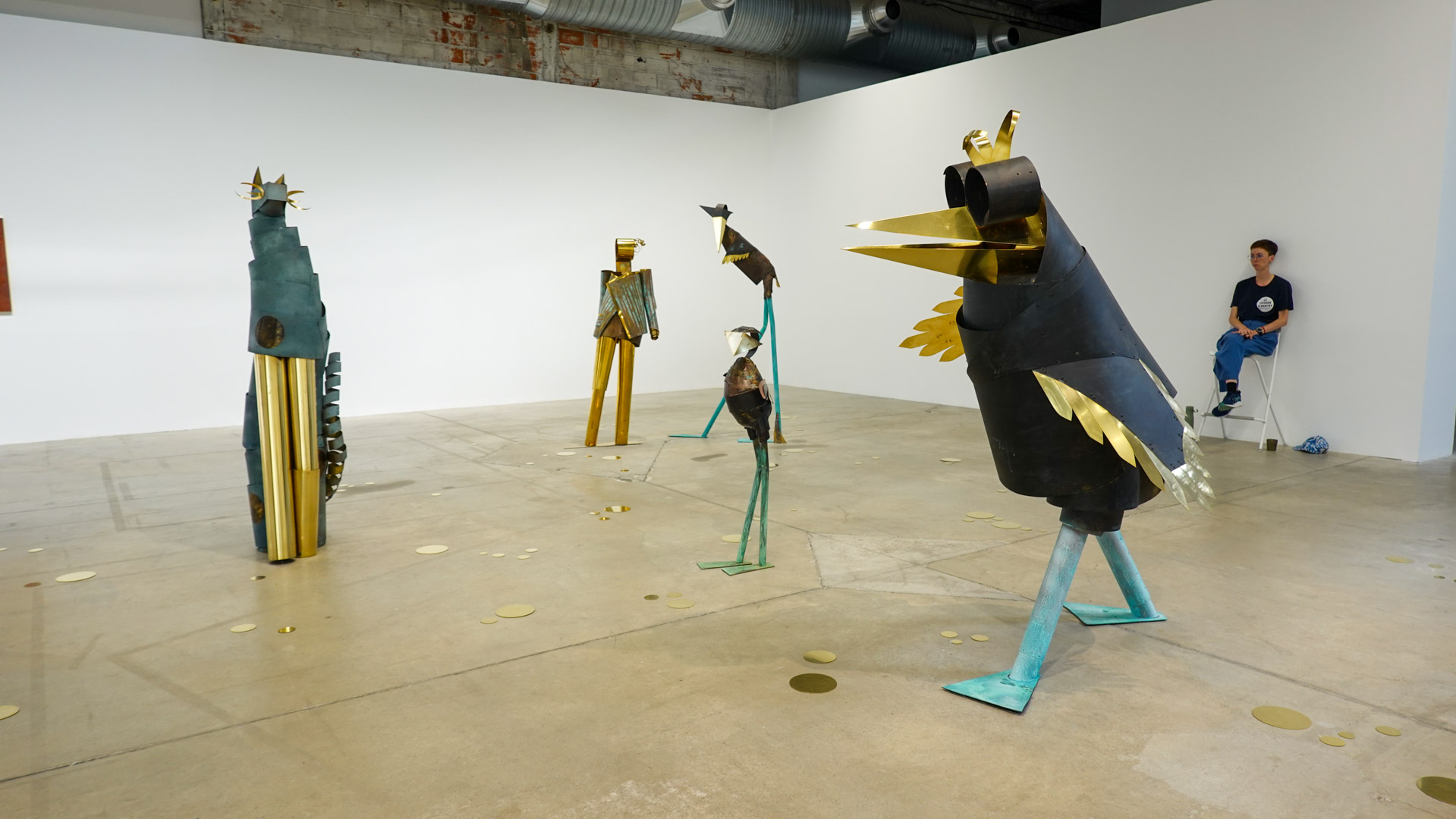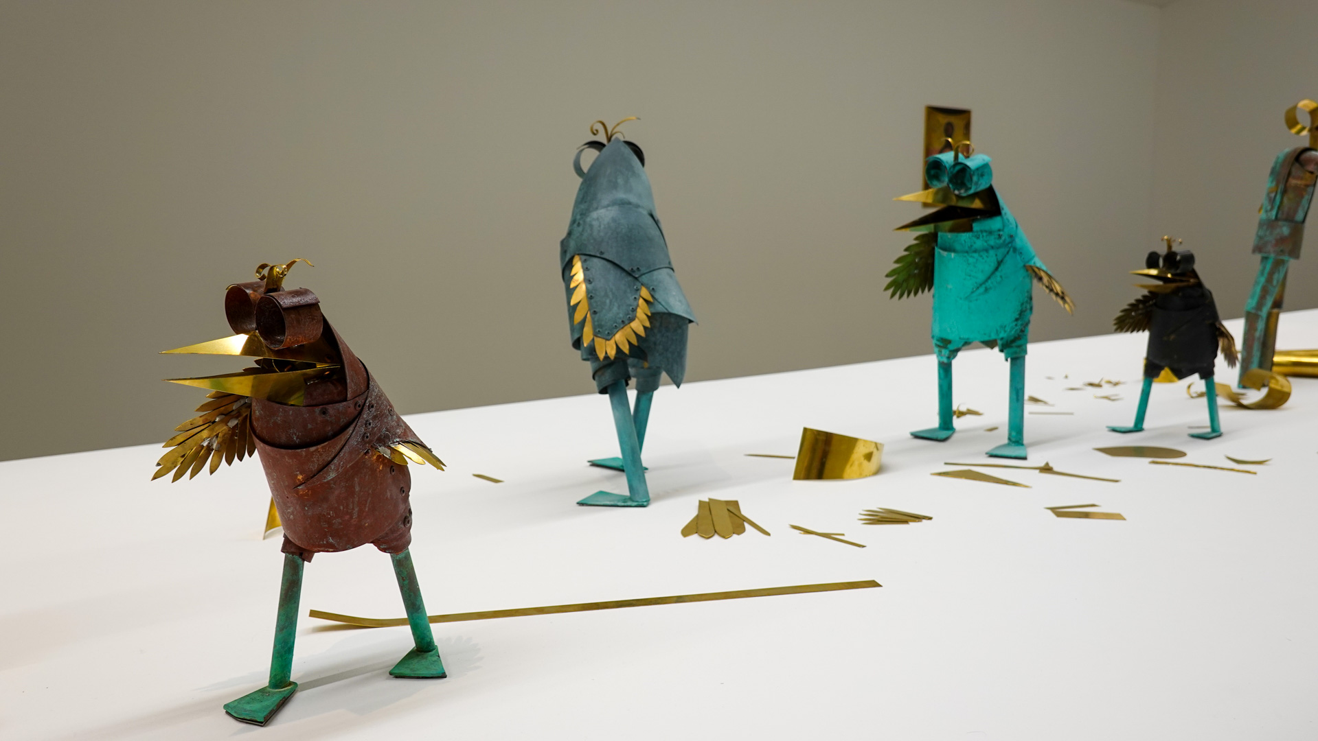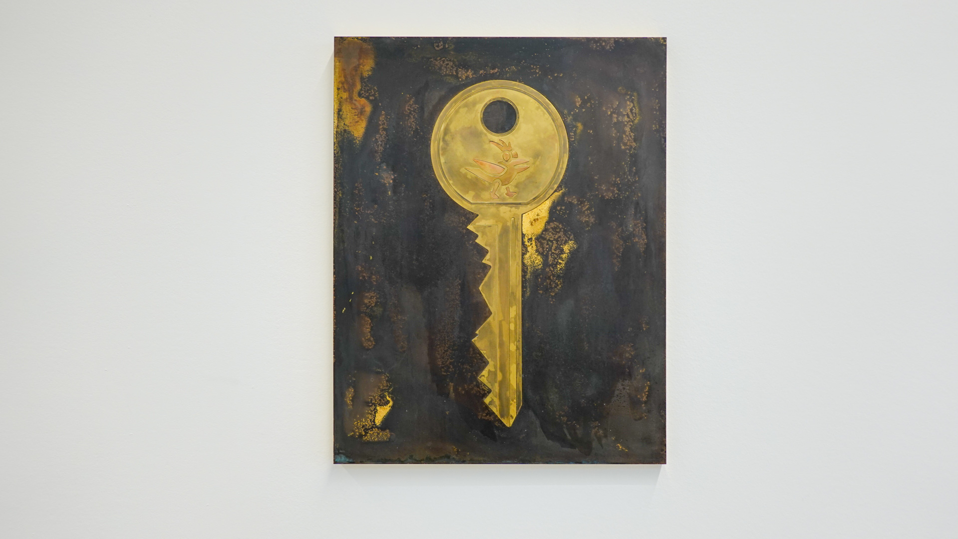 Dans une atmosphère enchantée, des animaux anthropomorphisés et des personnages métalliques vont et viennent. Des gouttes d’une matière dorée s’échappent de robinets et une architecture blanche, à priori impénétrable, se dresse comme un atelier temporairement à l’arrêt. Des tableaux de laiton donnent des indices sur l’intrigue à décoder tandis que les plus curieux découvriront des salles inaccessibles où tout un monde s’active."