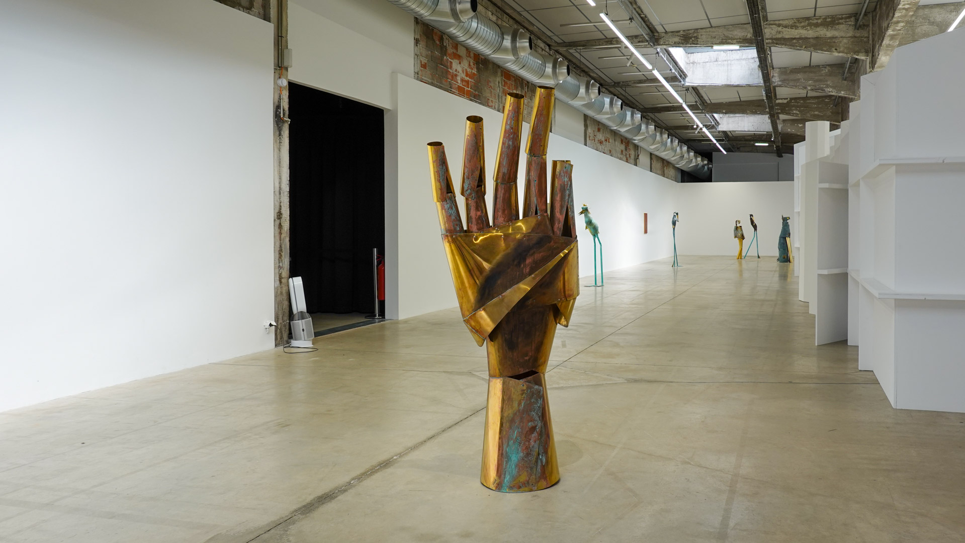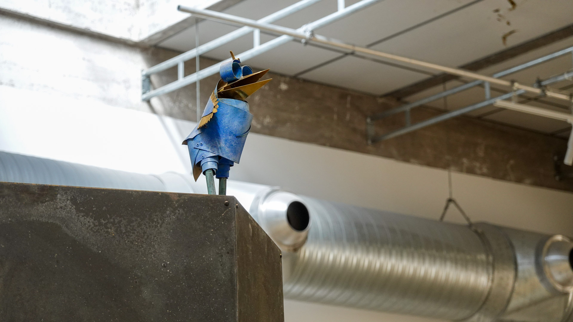 "Tel un rêve éveillé figé dans le temps, suite à un bug temporel, l’espace de la HAB Galerie se transforme en une scène aux allures de fabrique. CuCO & CO, qui évoque la formule chimique du vert-de-gris associé aux autres teintes qui colorent ce paysage, invite à explorer avec humour et poésie le cycle perpétuel de la matière et l’énigme de réalités parallèles où des sculptures prendraient vie.