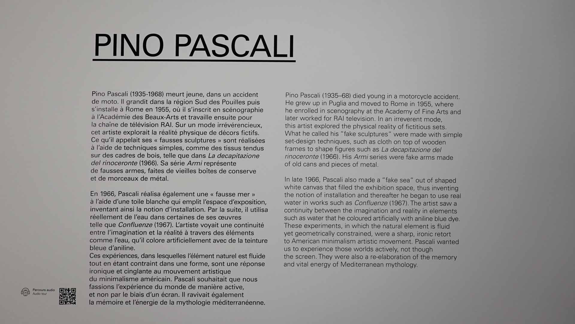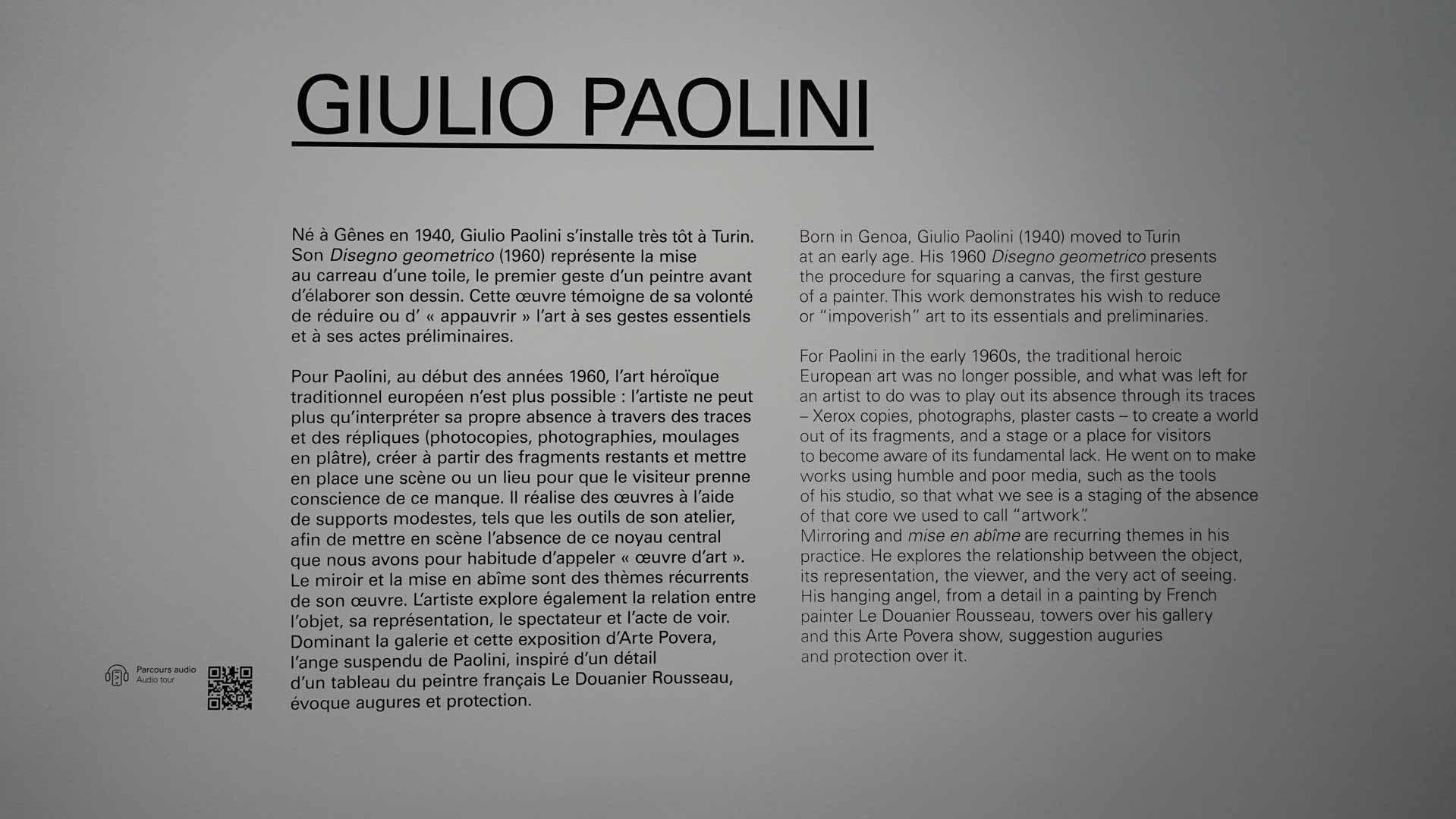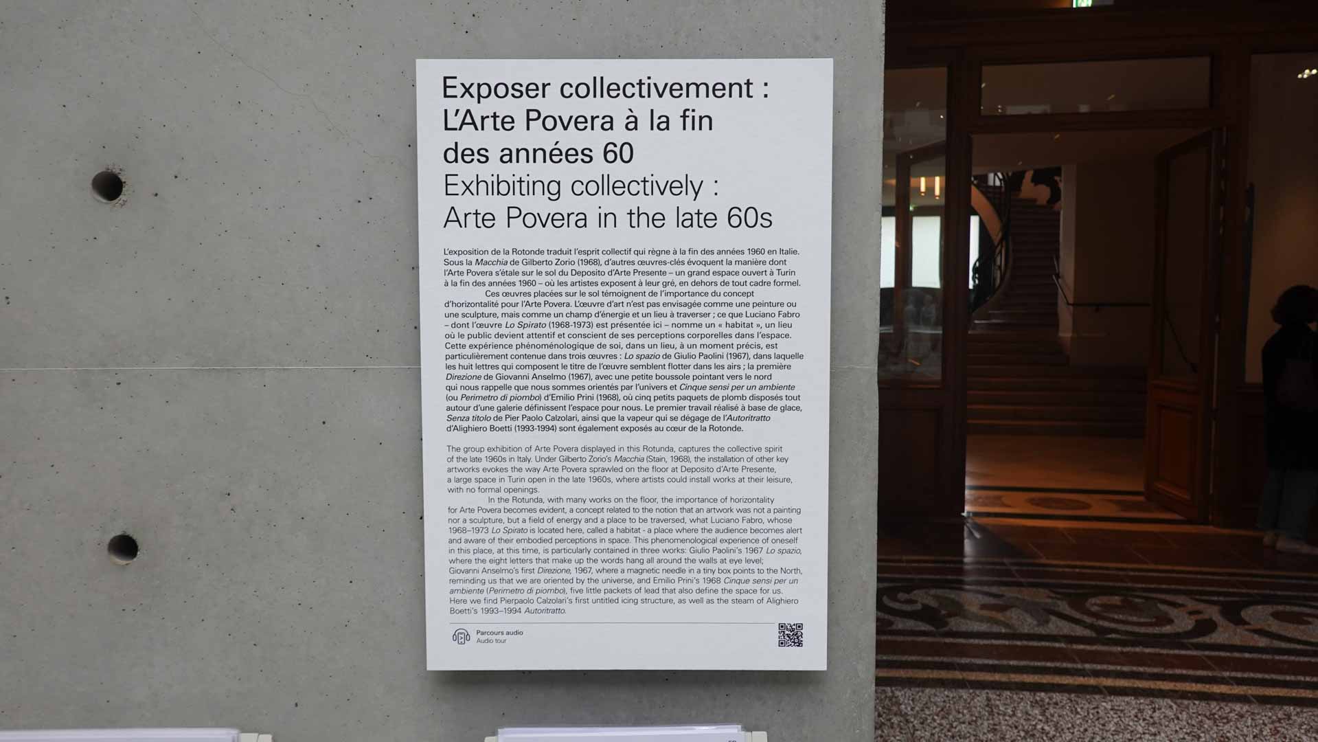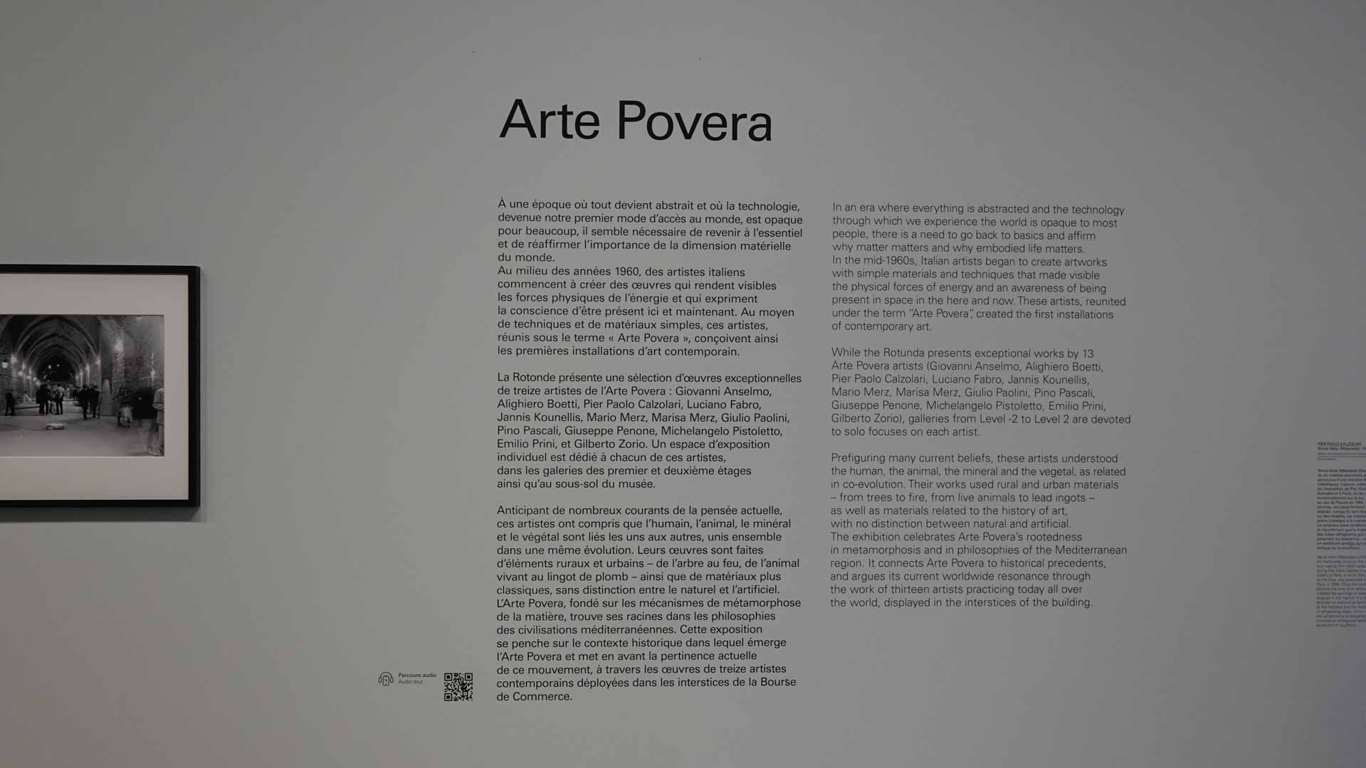“Au milieu des années 1960, un certain nombre d’artistes italiens – essentiellement originaires de Turin, Gênes, Bologne, Milan et Rome – ont initié un corpus d’œuvres original, libre d’esprit, totalement non conventionnel et non dogmatique, élargissant ainsi les domaines de la peinture, de la sculpture, du dessin et de la photographie, en créant les premières "installations" de l’histoire de l’art, ainsi que des œuvres et des actions performatives.