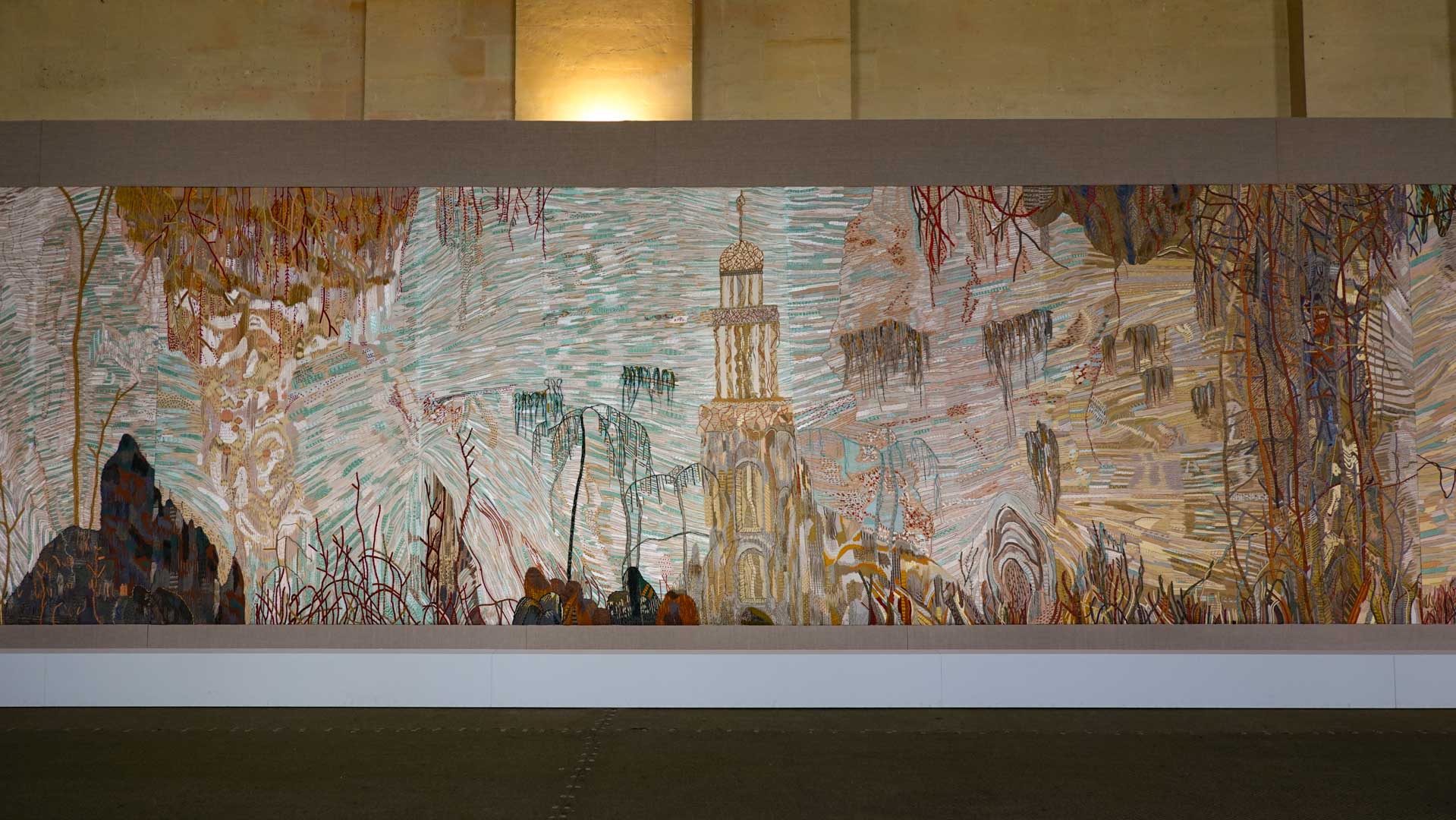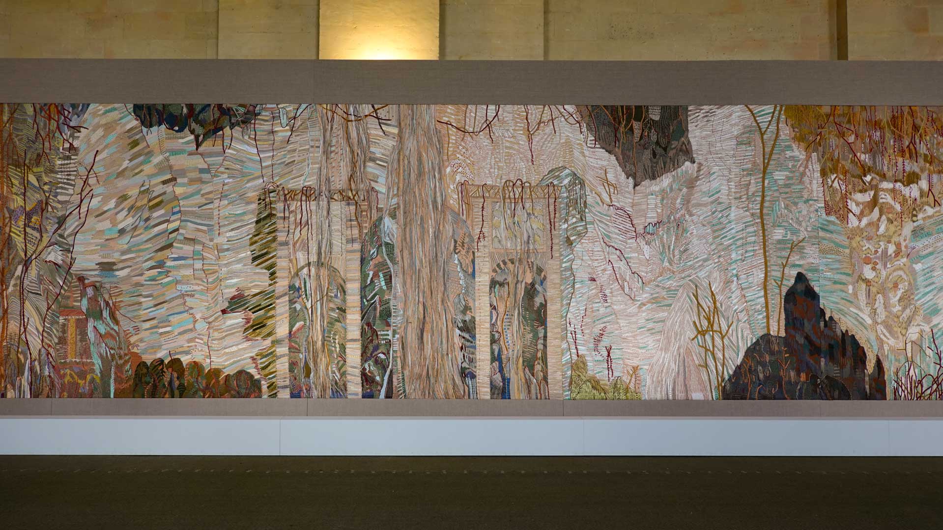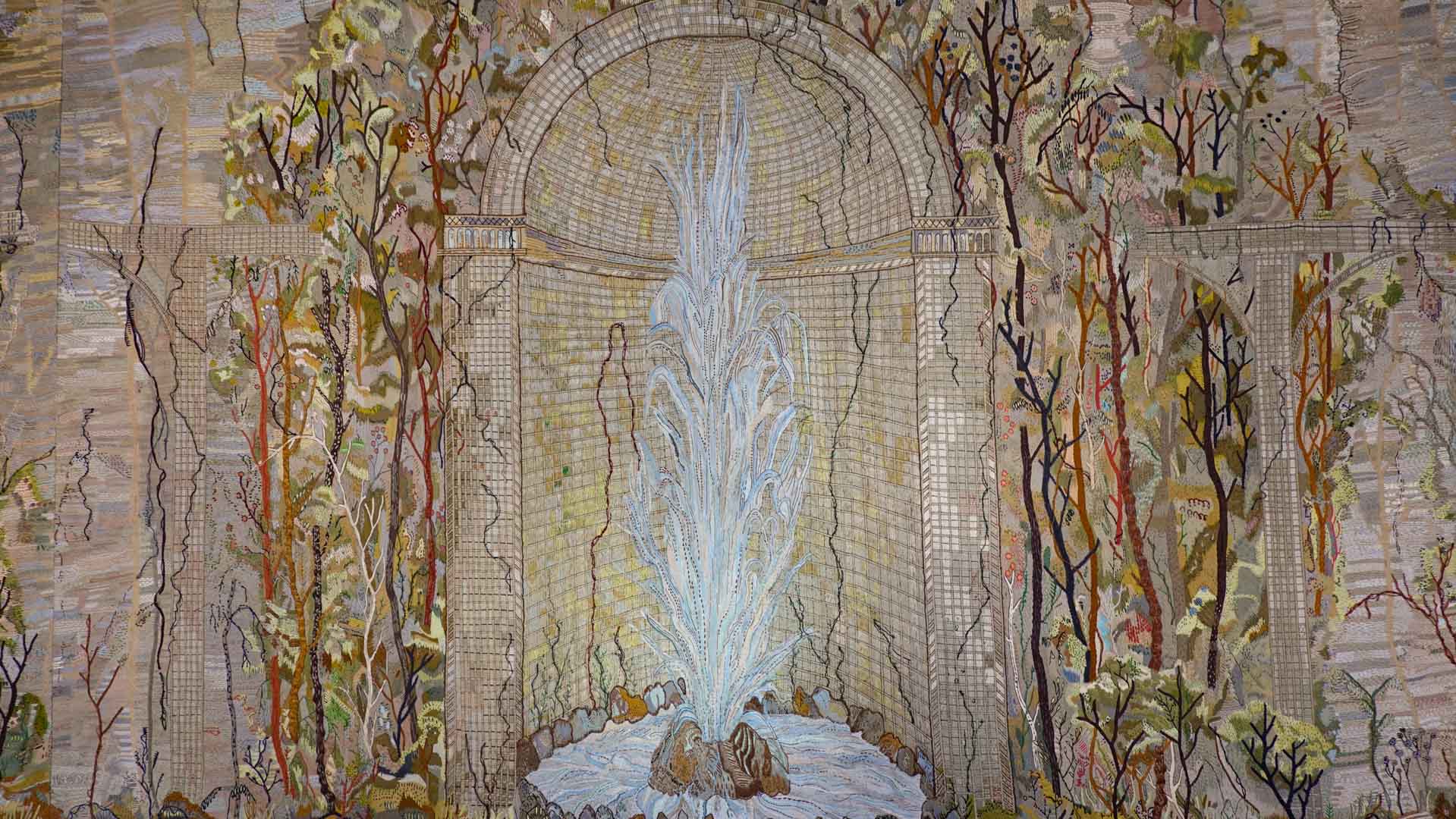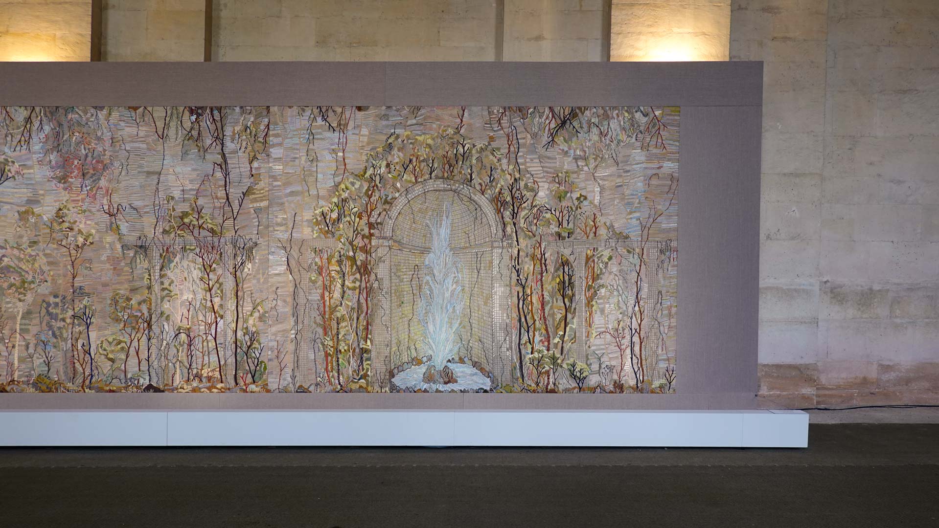 Avec l'ajout d'un panneau brodé inspiré des bosquets versaillais, notamment les Bains d'Apollon, Eva Jospin établit un dialogue entre l'art du jardin et la broderie.