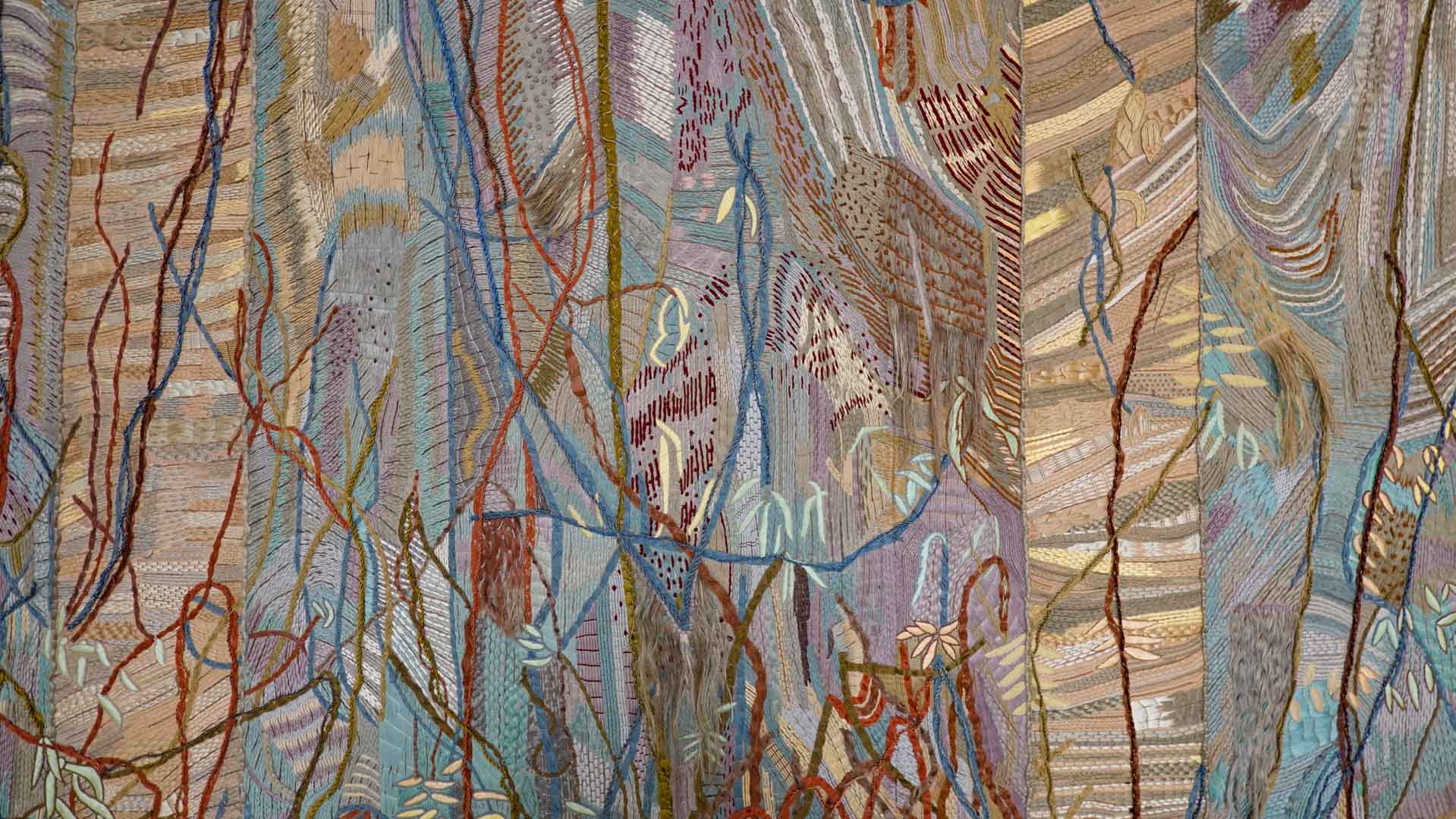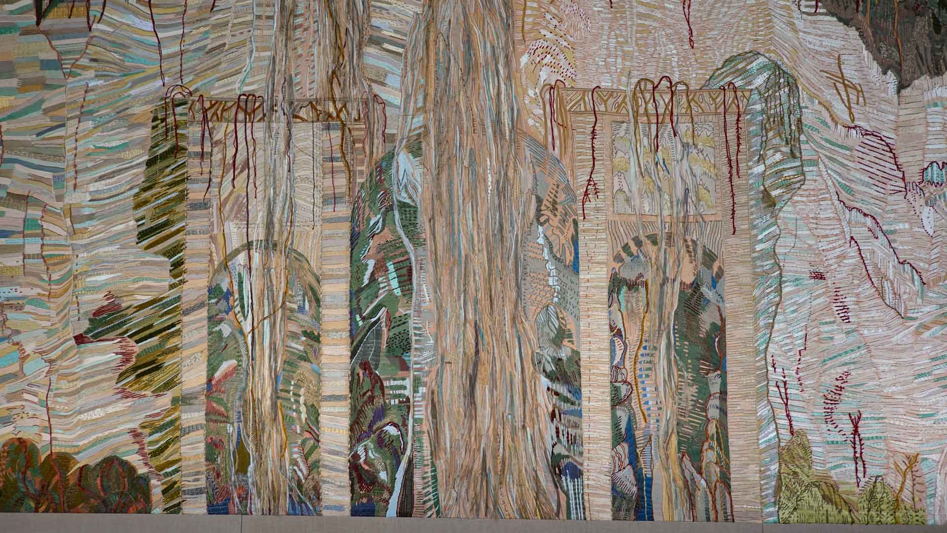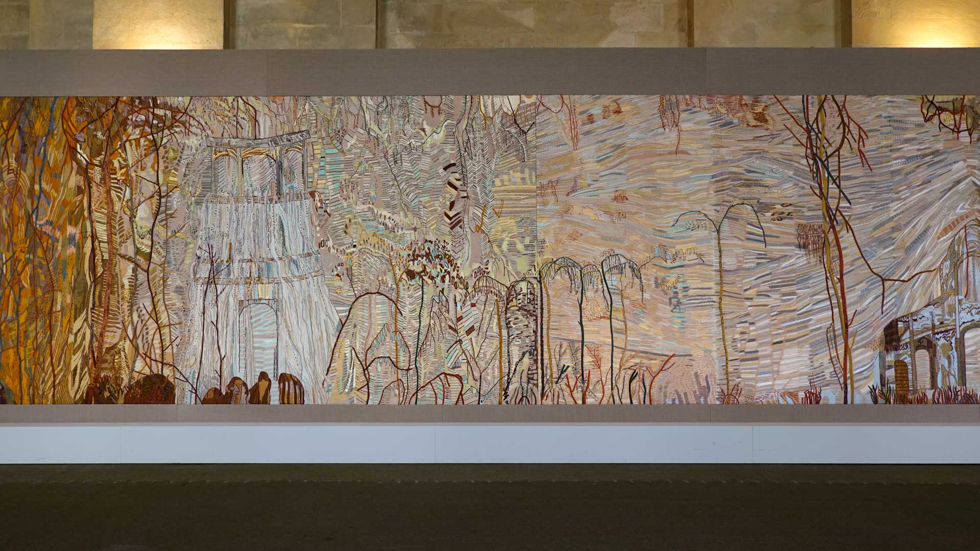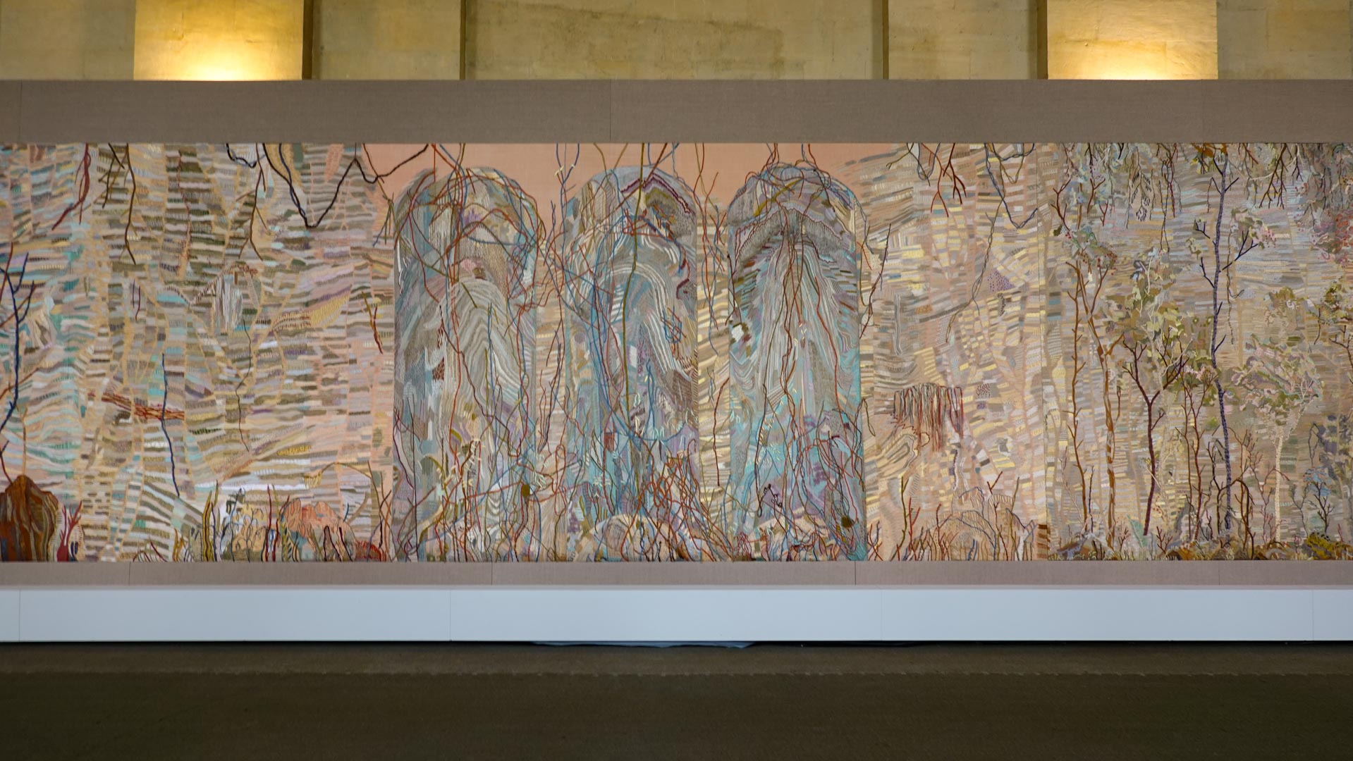 Avec l'ajout d'un panneau brodé inspiré des bosquets versaillais, notamment les Bains d'Apollon, Eva Jospin établit un dialogue entre l'art du jardin et la broderie.