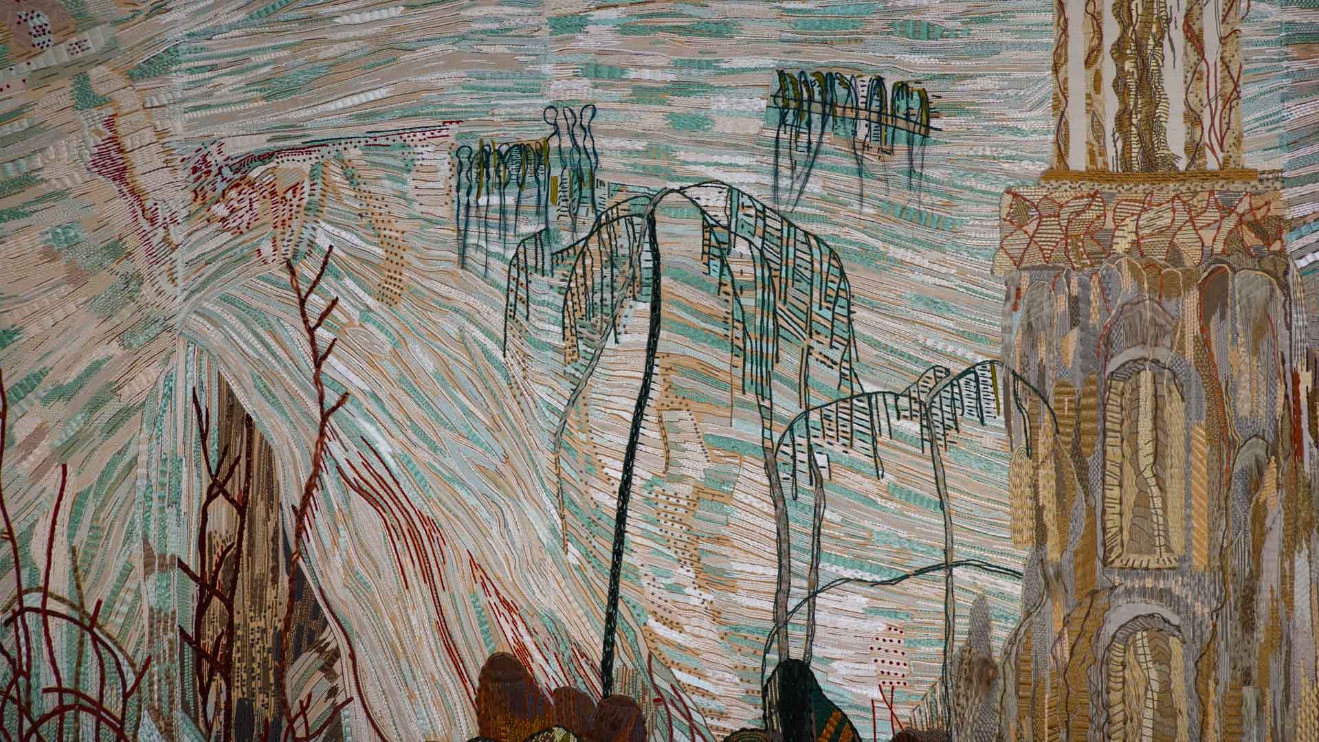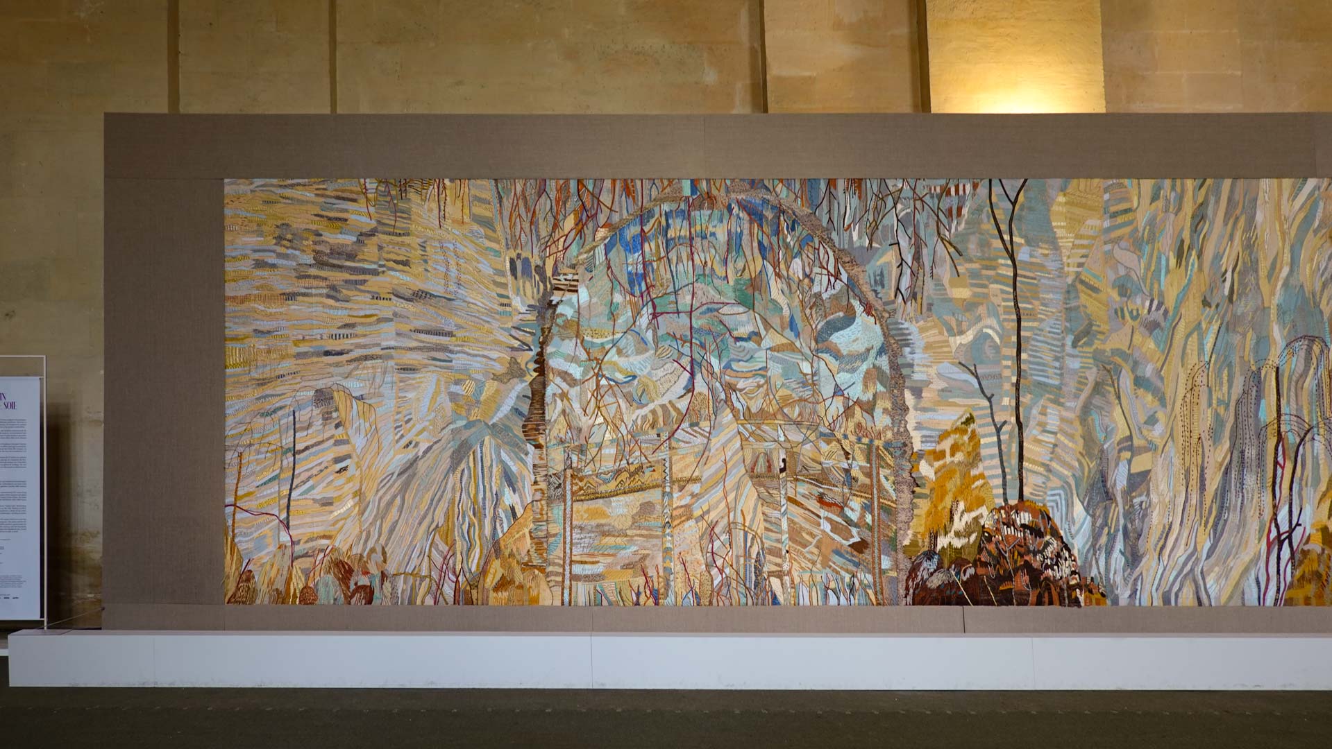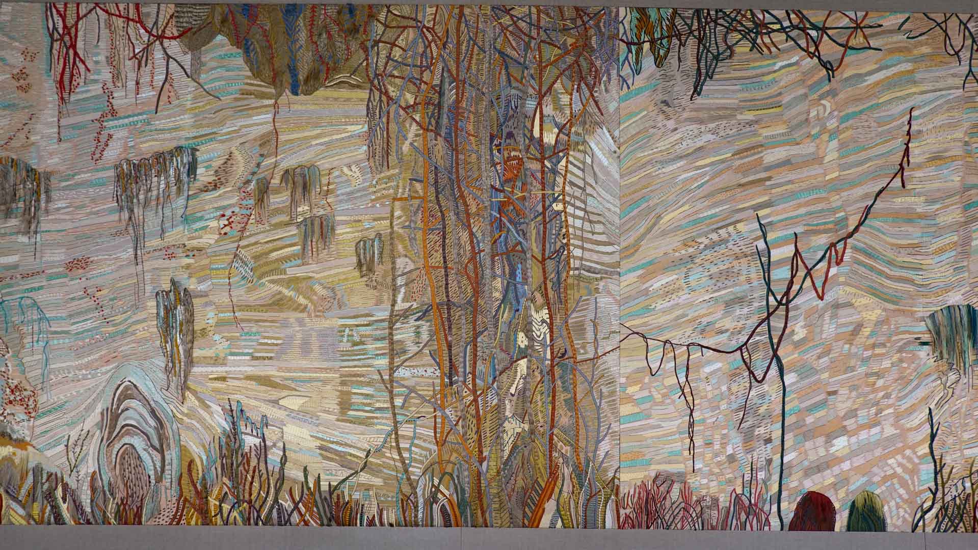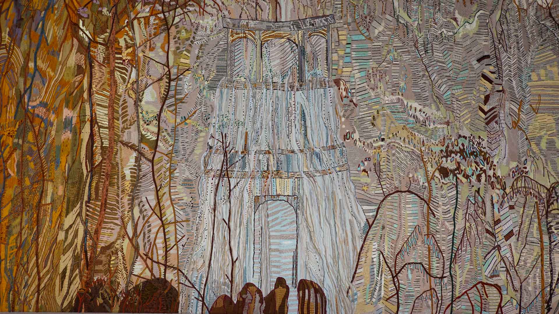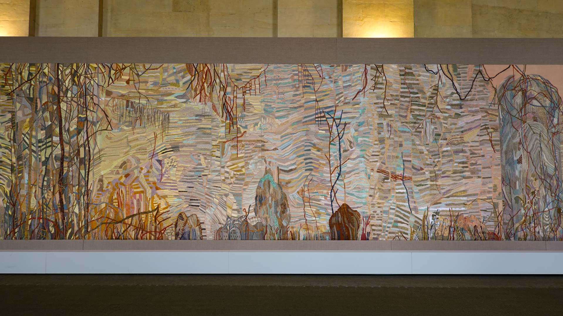 Avec l'ajout d'un panneau brodé inspiré des bosquets versaillais, notamment les Bains d'Apollon, Eva Jospin établit un dialogue entre l'art du jardin et la broderie.